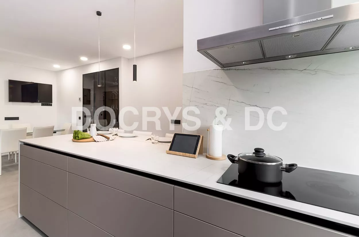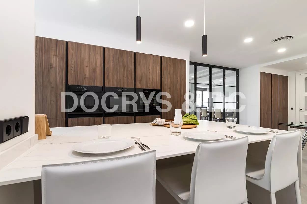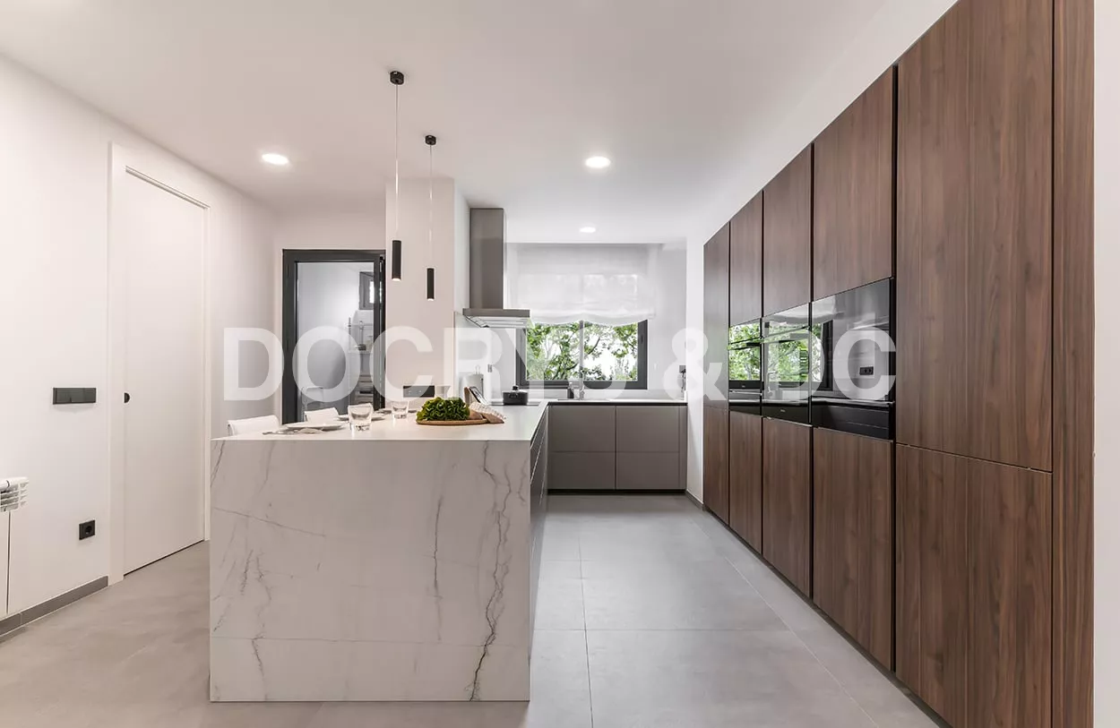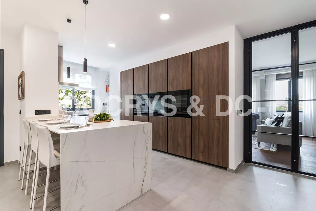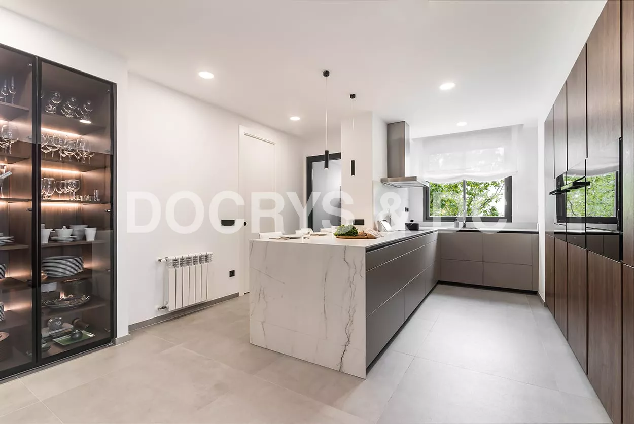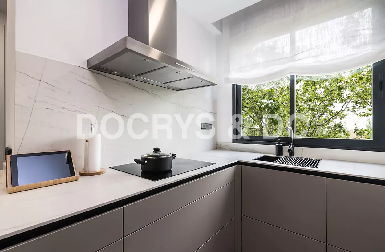 Esta cocina está separada del salón con un cerramiento acristalado, el cual hace que no se pierda la conexión visual con ambos espacios y deja entrar una gran luminosidad.