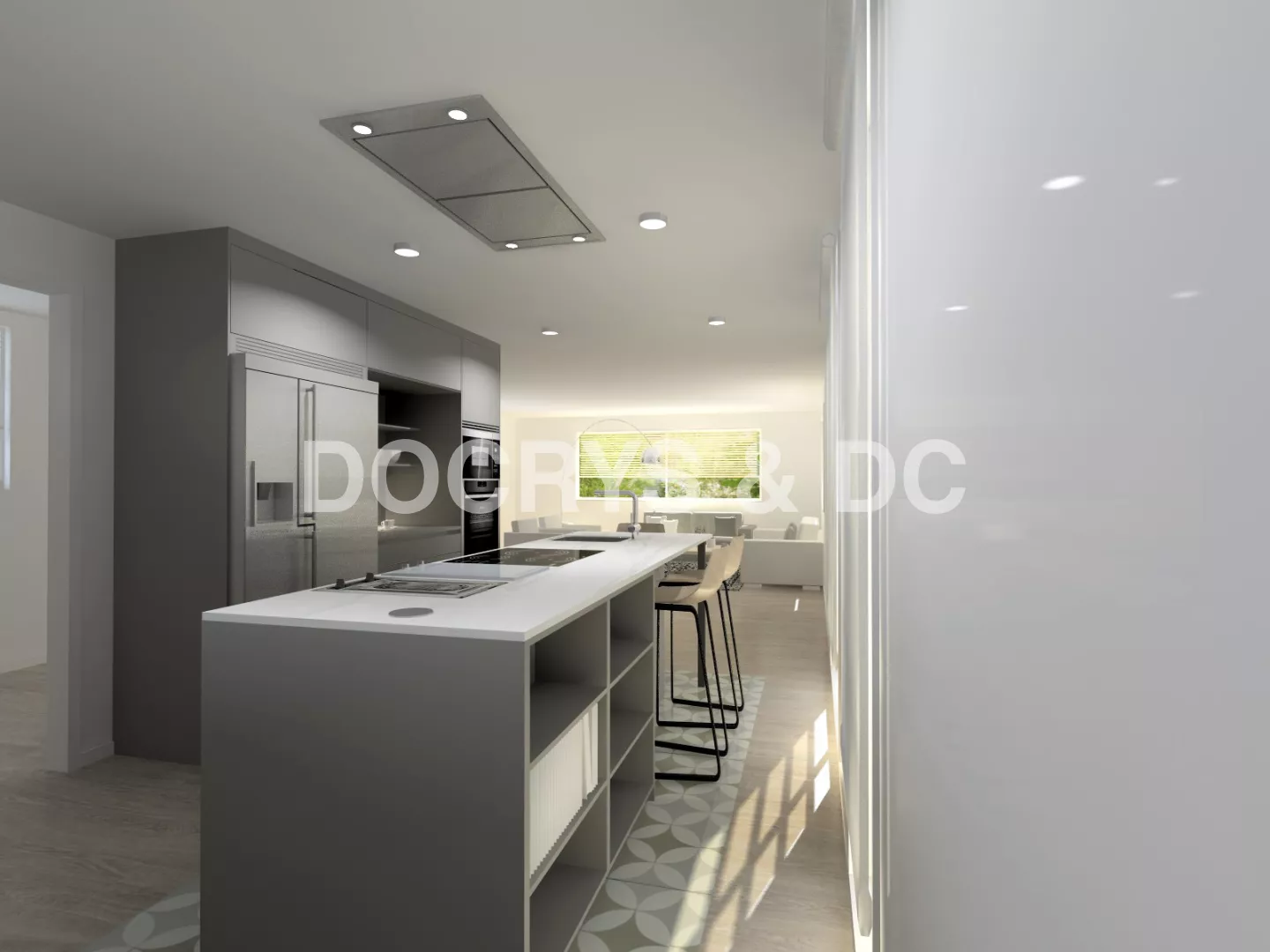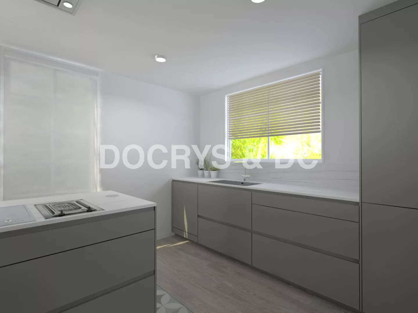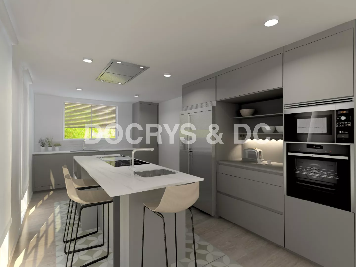 Cocina Santos en color Gris Visón con isla y 2 frentes. El diseño de esta cocina queda abierto al salón, consiguiendo una cocina muy amplia y luminosa. El color elegido es el gris visón junto con un suelo hidráulico, hacen de esta estancia, una cocina muy especial, moderna y elegante