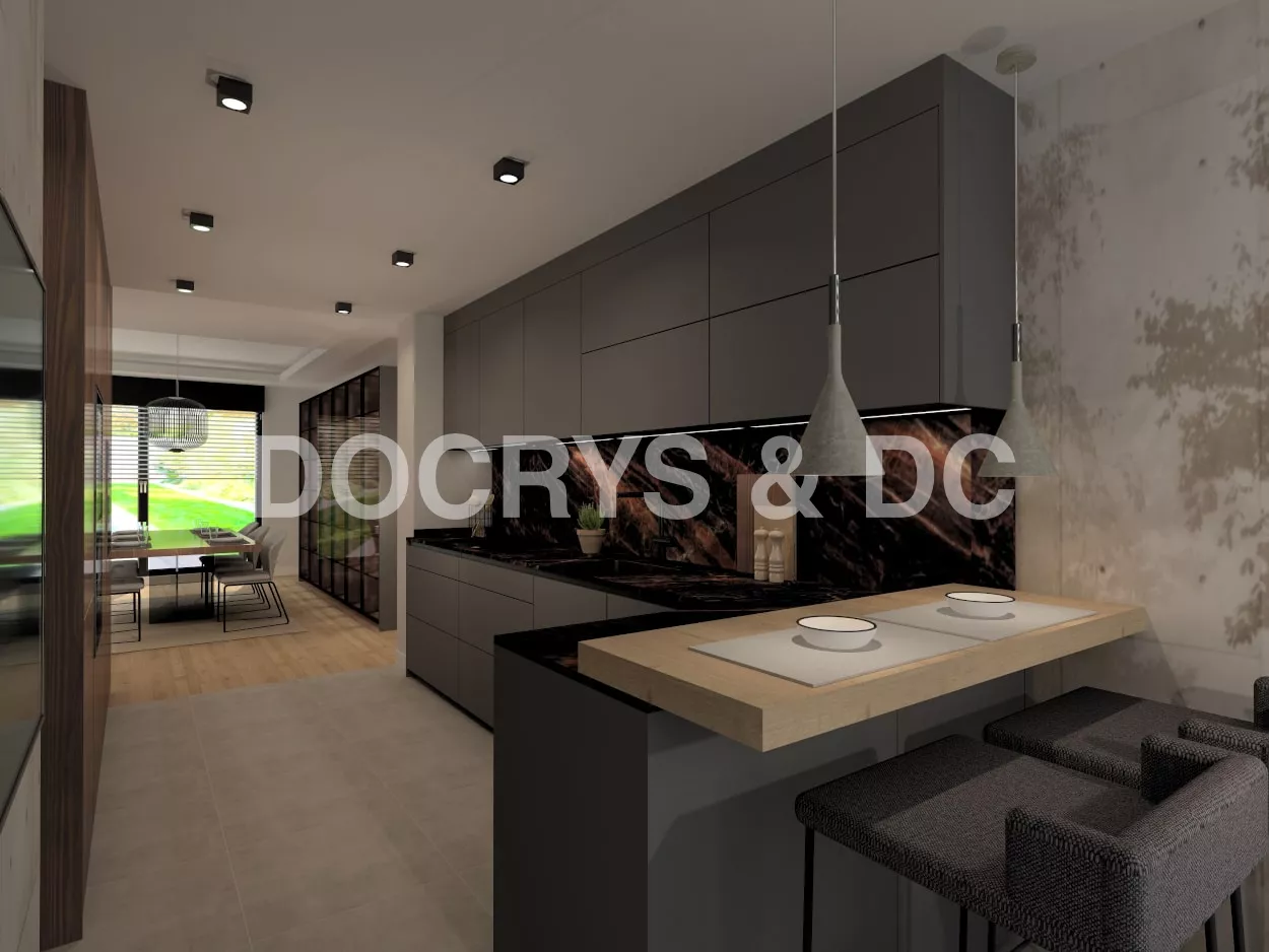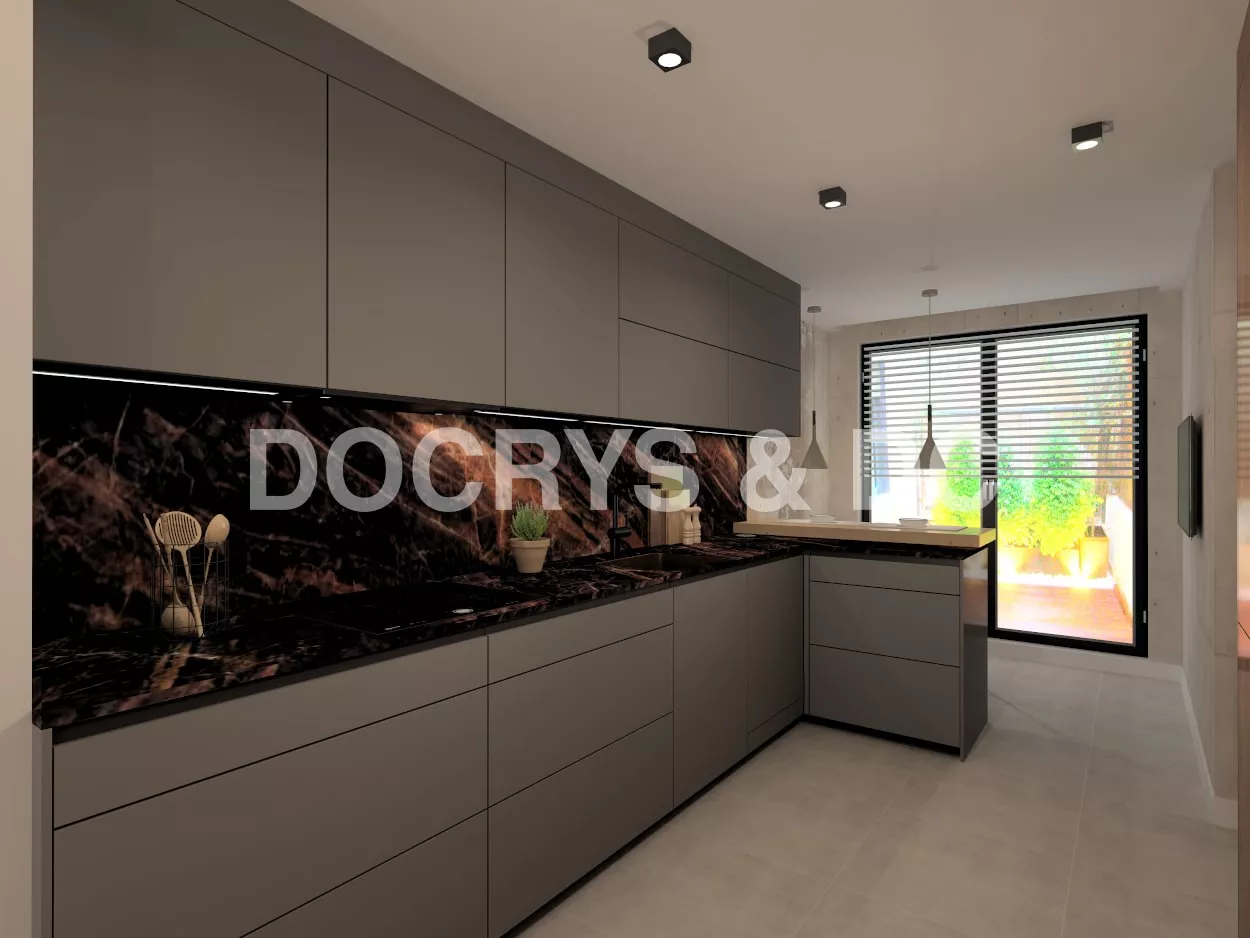 El frente con distribución en L, cuenta con muebles bajos, muebles altos, zona de cocción y zona de aguas. Además, cuenta con una pequeña barra en madera para dos comensales.