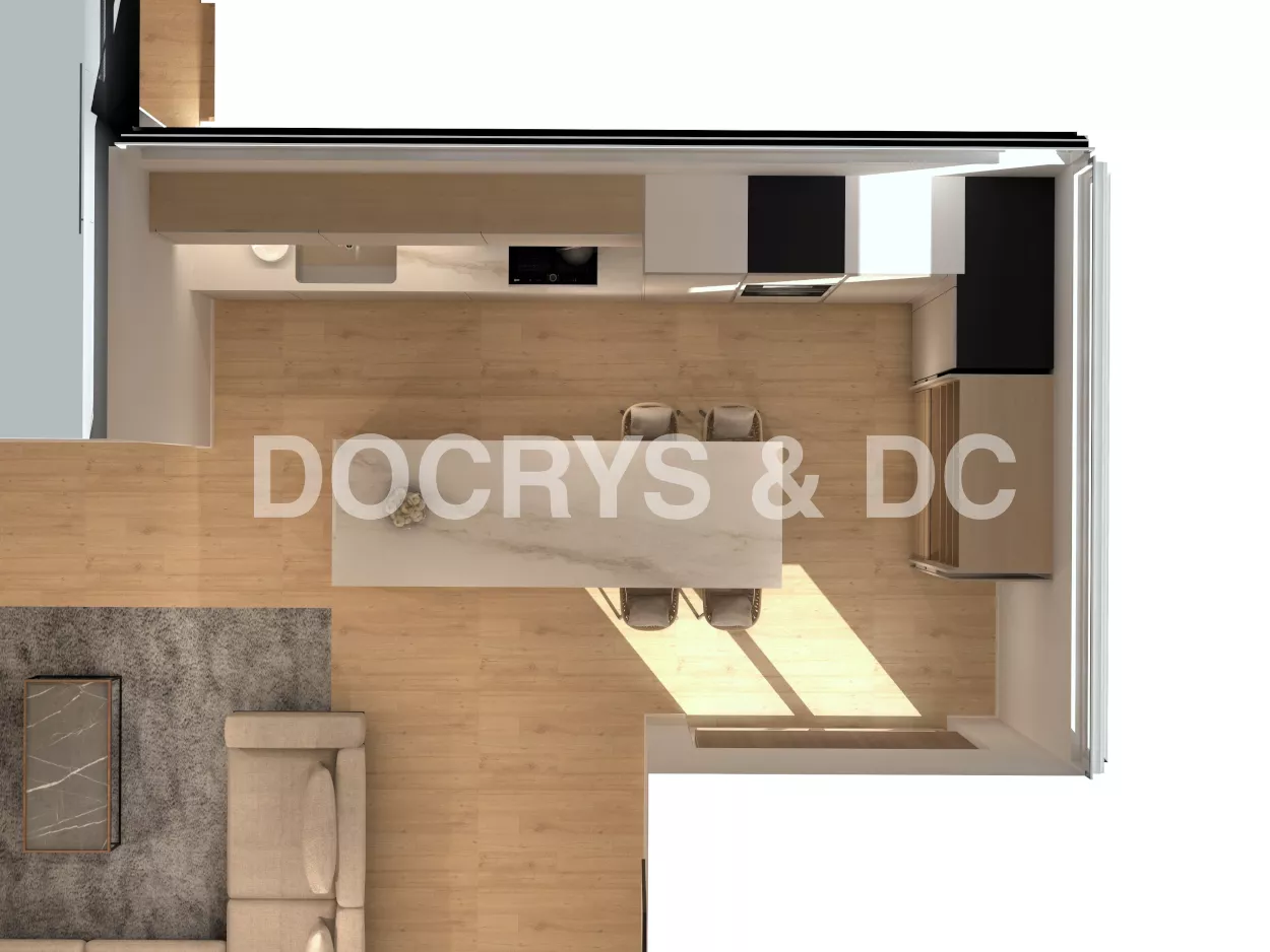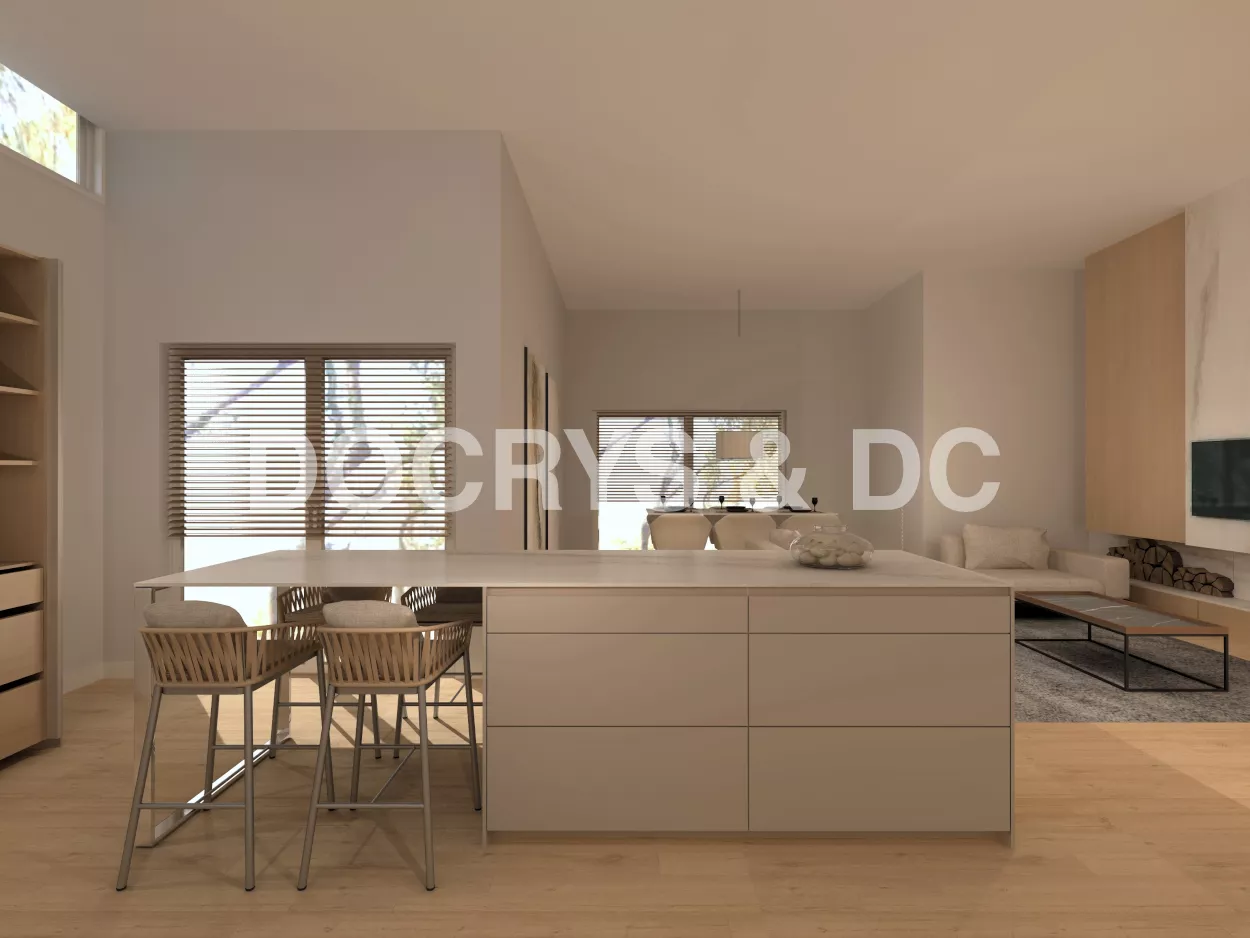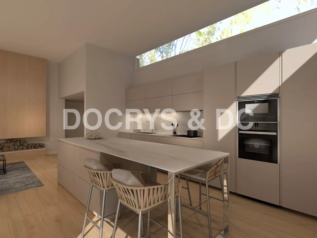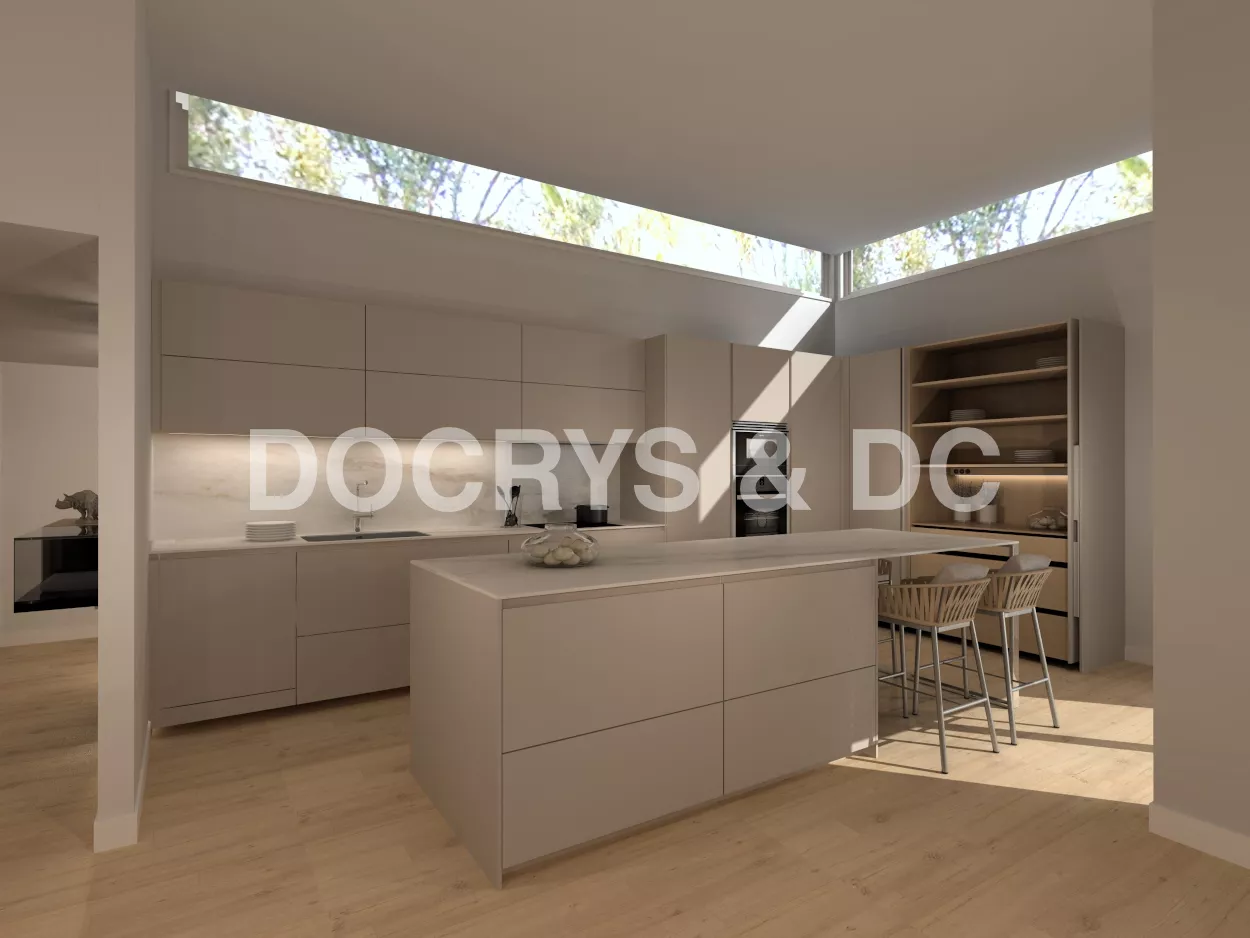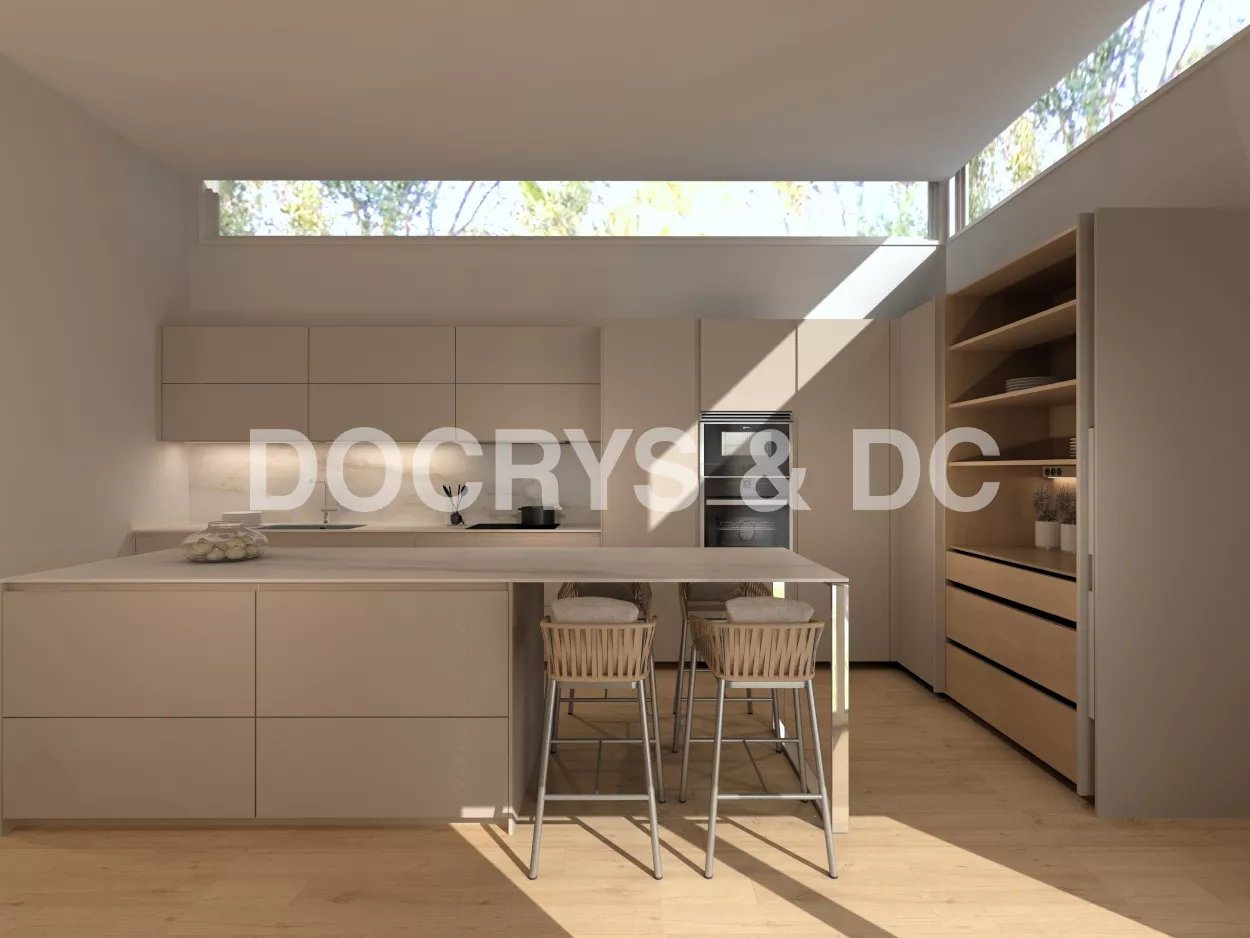 Cocina moderna con isla en gris arena y nogal