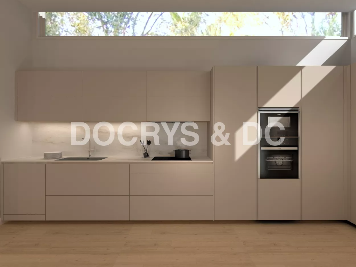 Esta Cocina moderna en color gris areal y roble natural con material estratificado y encimera de Lapitec tiene una distribución que cuenta con un frente y una isla central en otro color como protagonista del espacio.