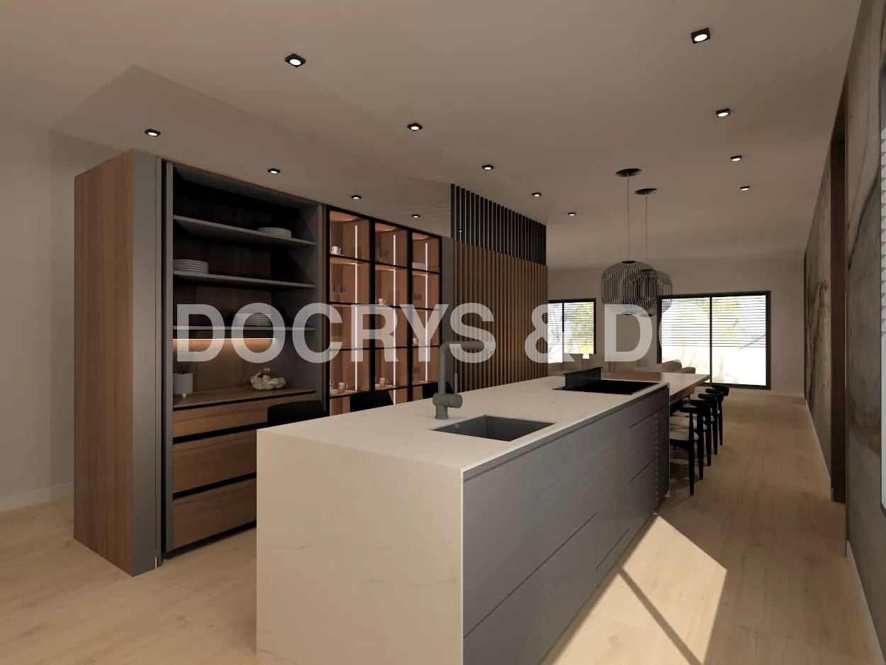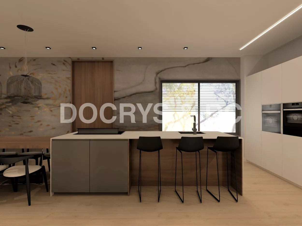 Por otro lado, cuenta con una isla central, compuesta por muebles bajos, donde se ubican la zona de aguas y la zona de cocción. Además, cuenta con una extensión formando una mesa de office para cuatro comensales.