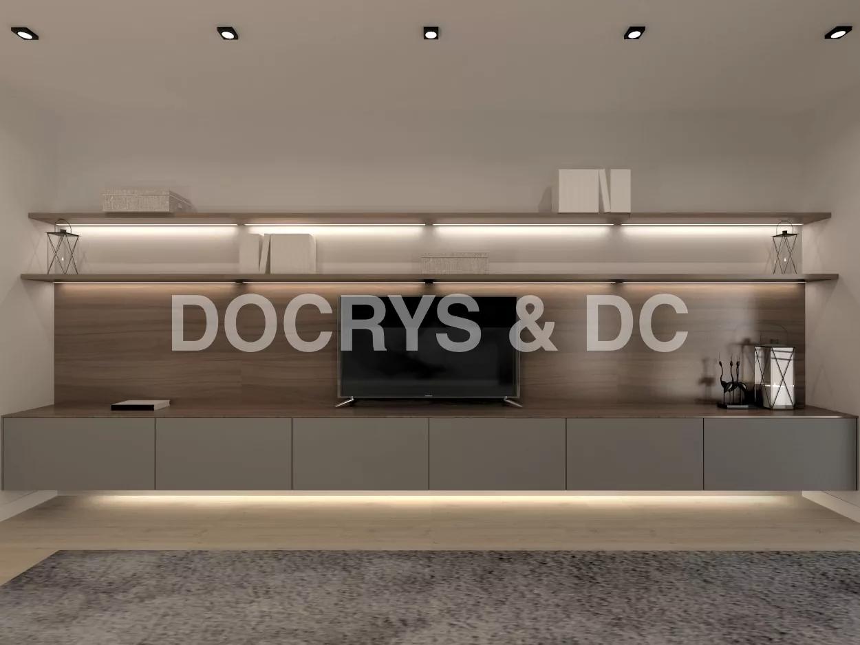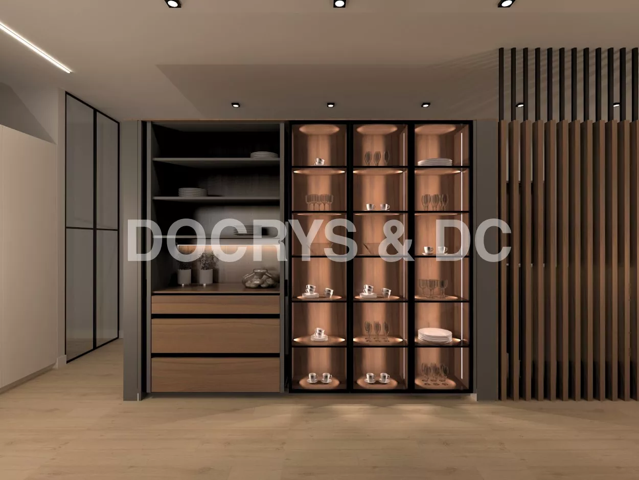 Uno de los frentes está compuesto por un mueble escamoteable y varias vitrinas.