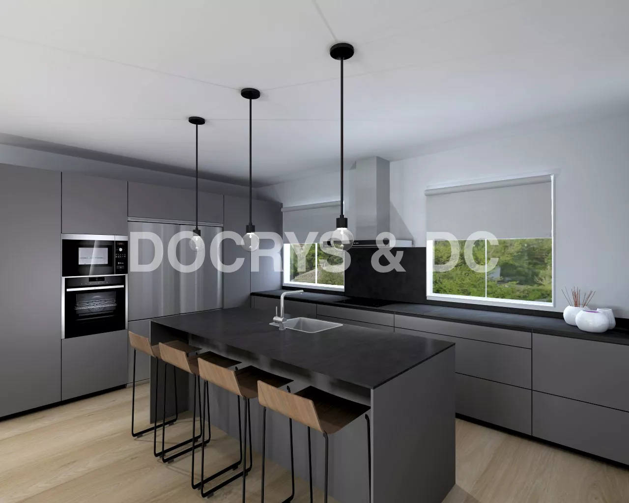 Cocina Santos: plataforma A, apertura mecanizada. Laminado antihuellas Gris Bromo Seda.