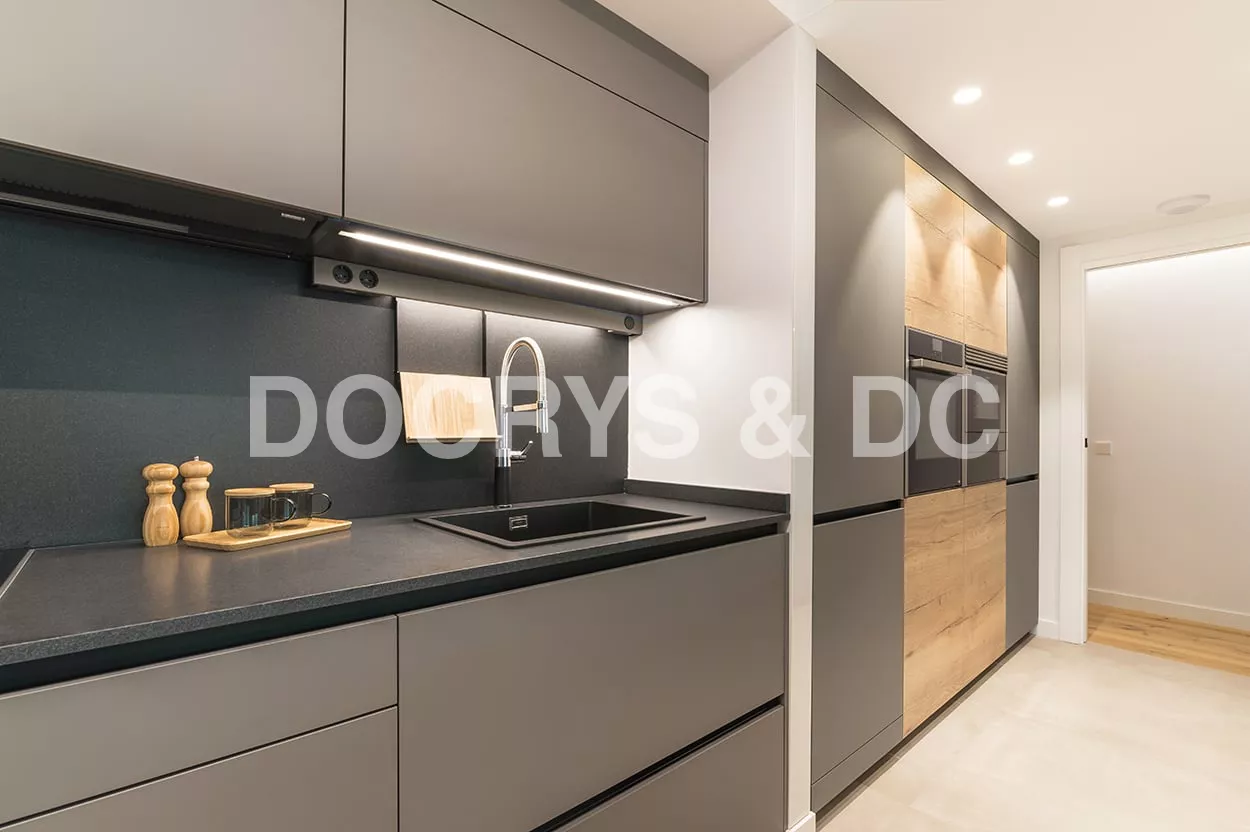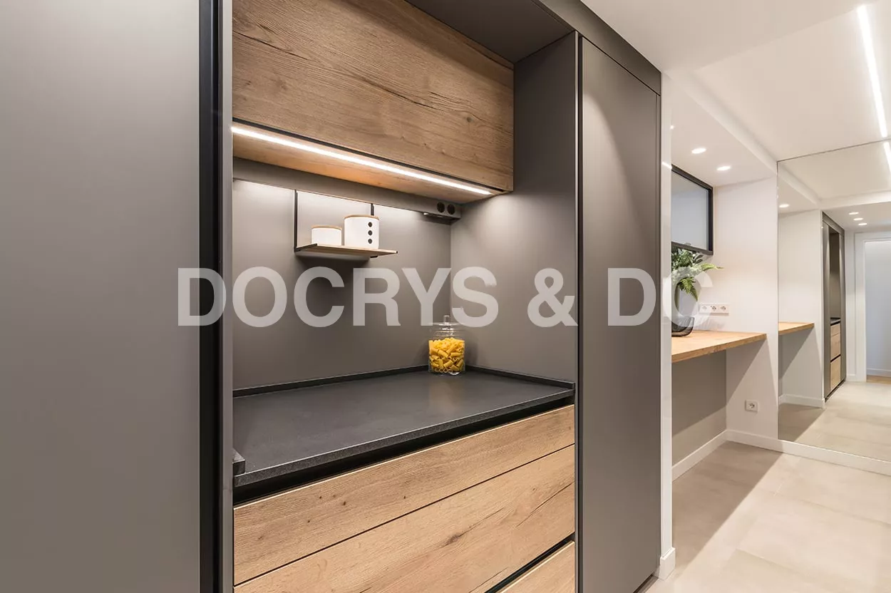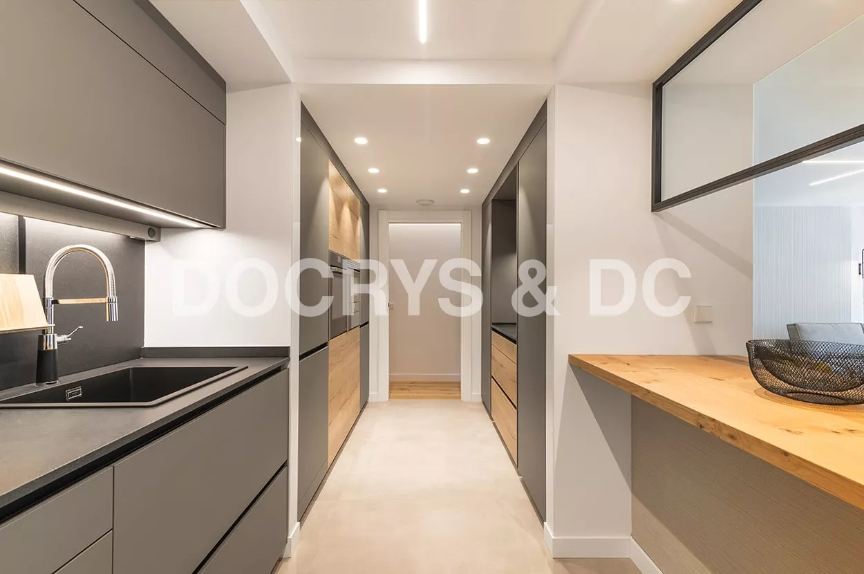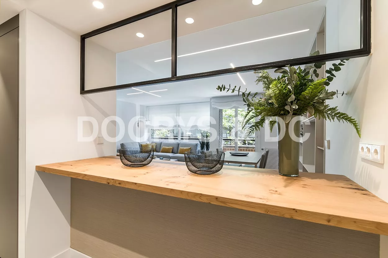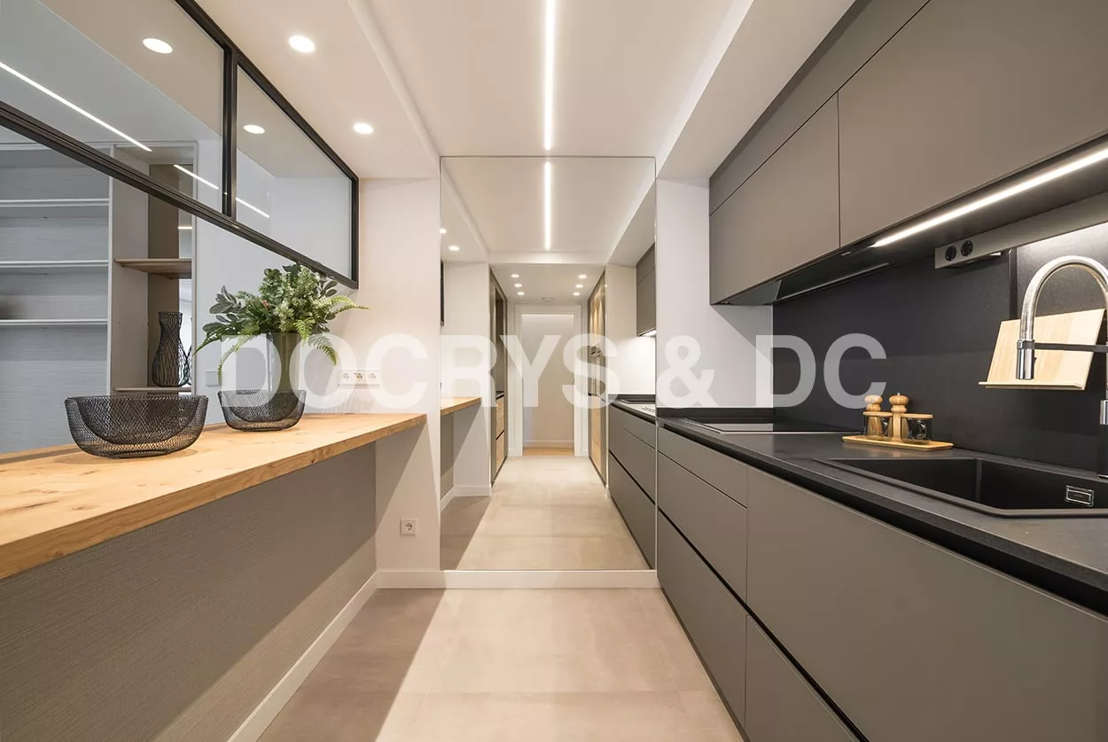 La cocina, también está separada del salón por un cerramiento acristalado, que permite que entre la luz y la sensación de amplitud sea mayor en la cocina.