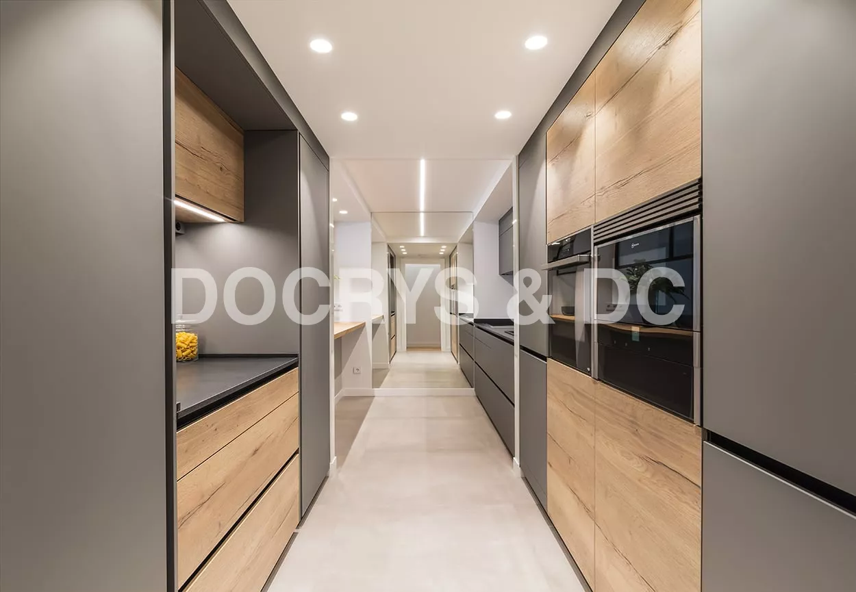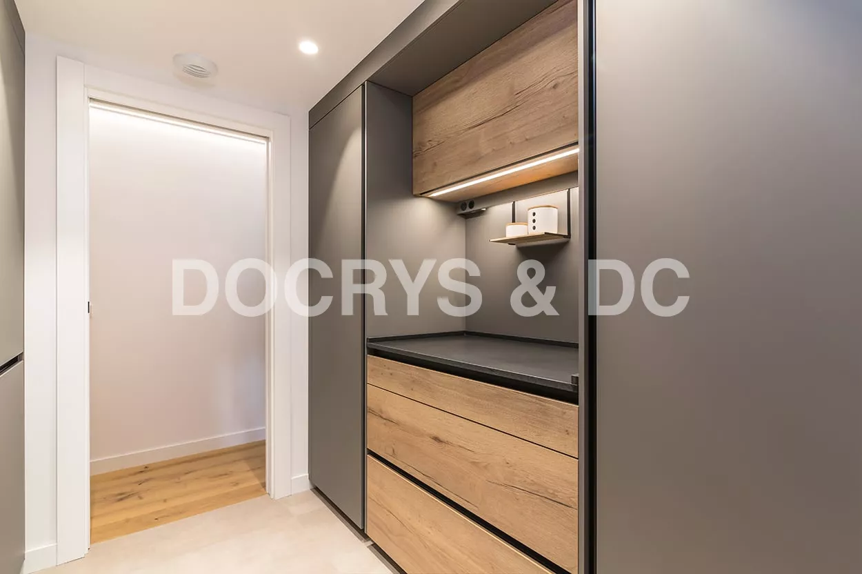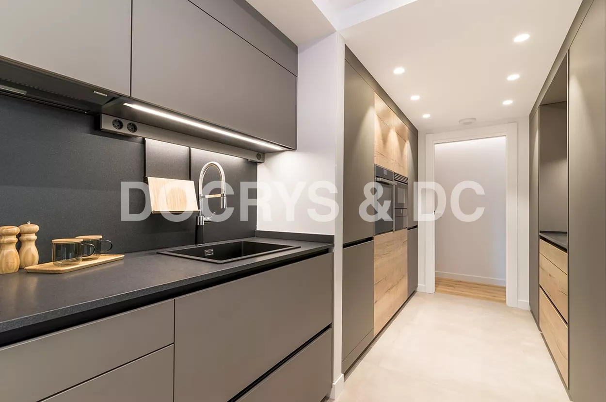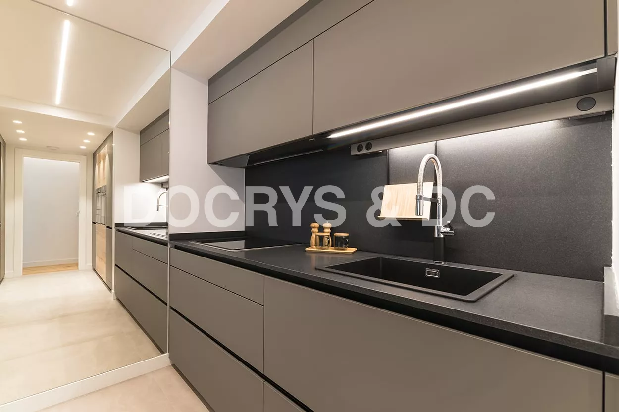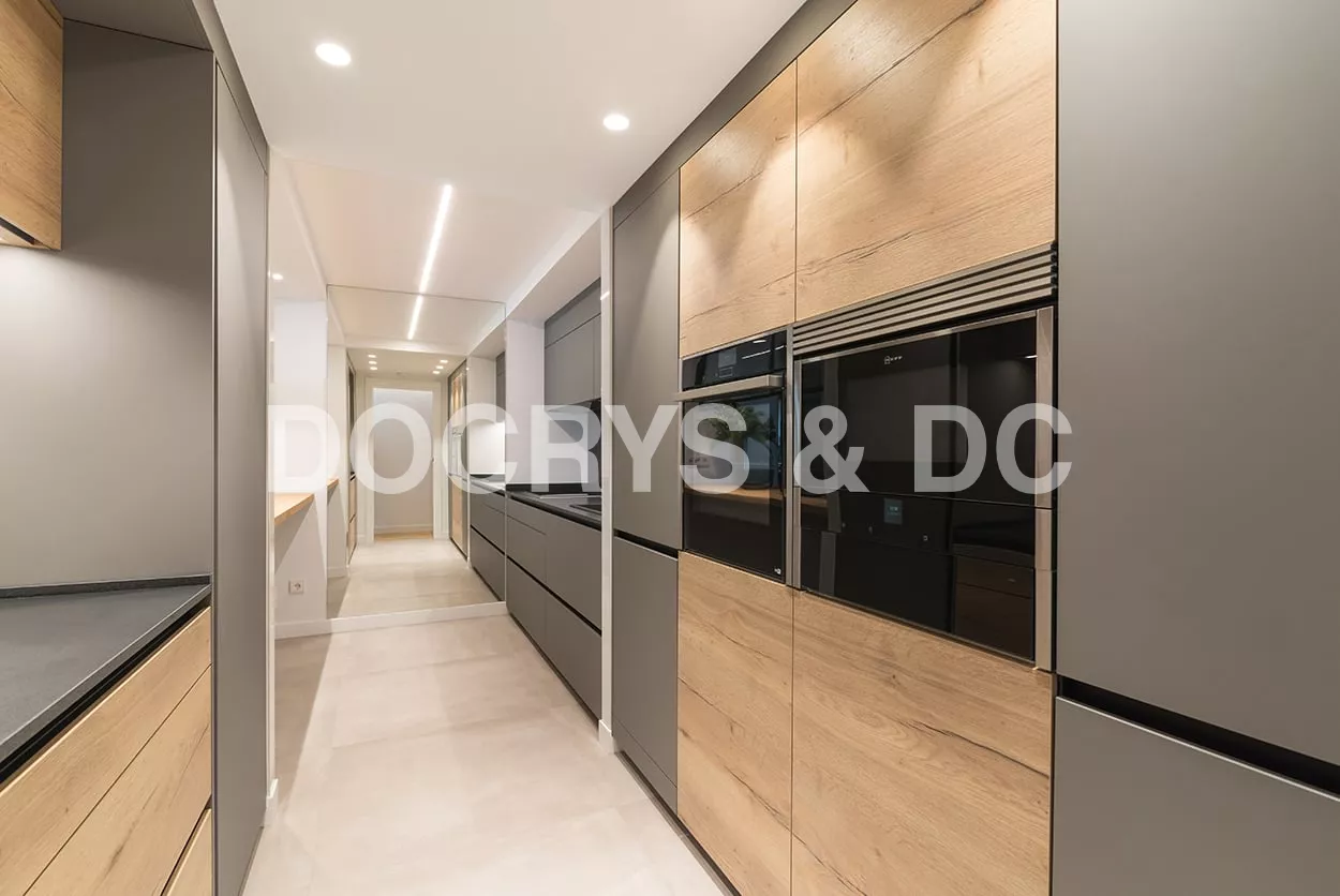 La cocina, también está separada del salón por un cerramiento acristalado, que permite que entre la luz y la sensación de amplitud sea mayor en la cocina.