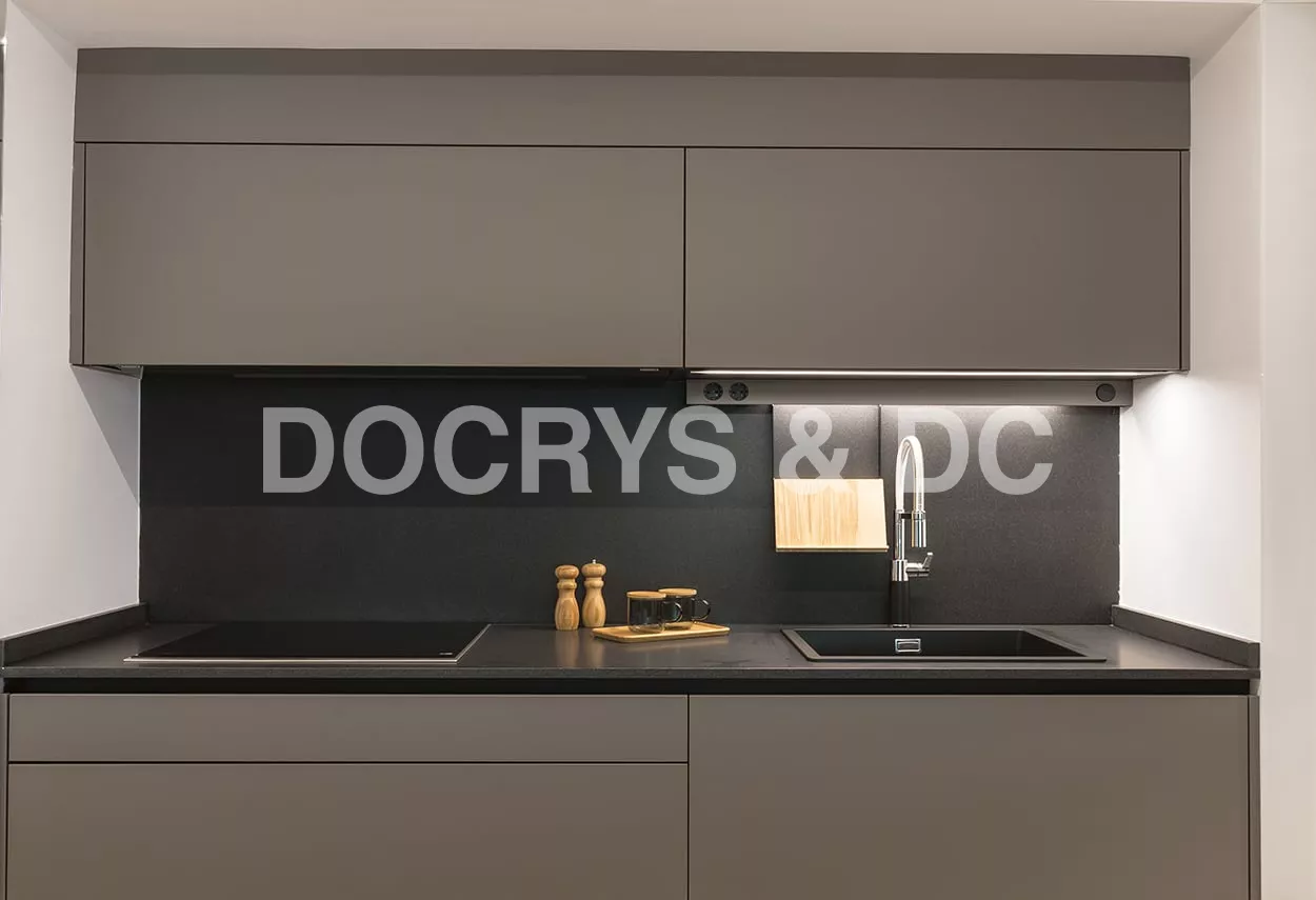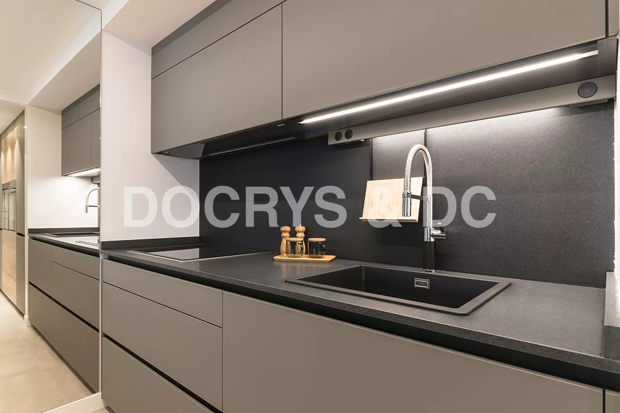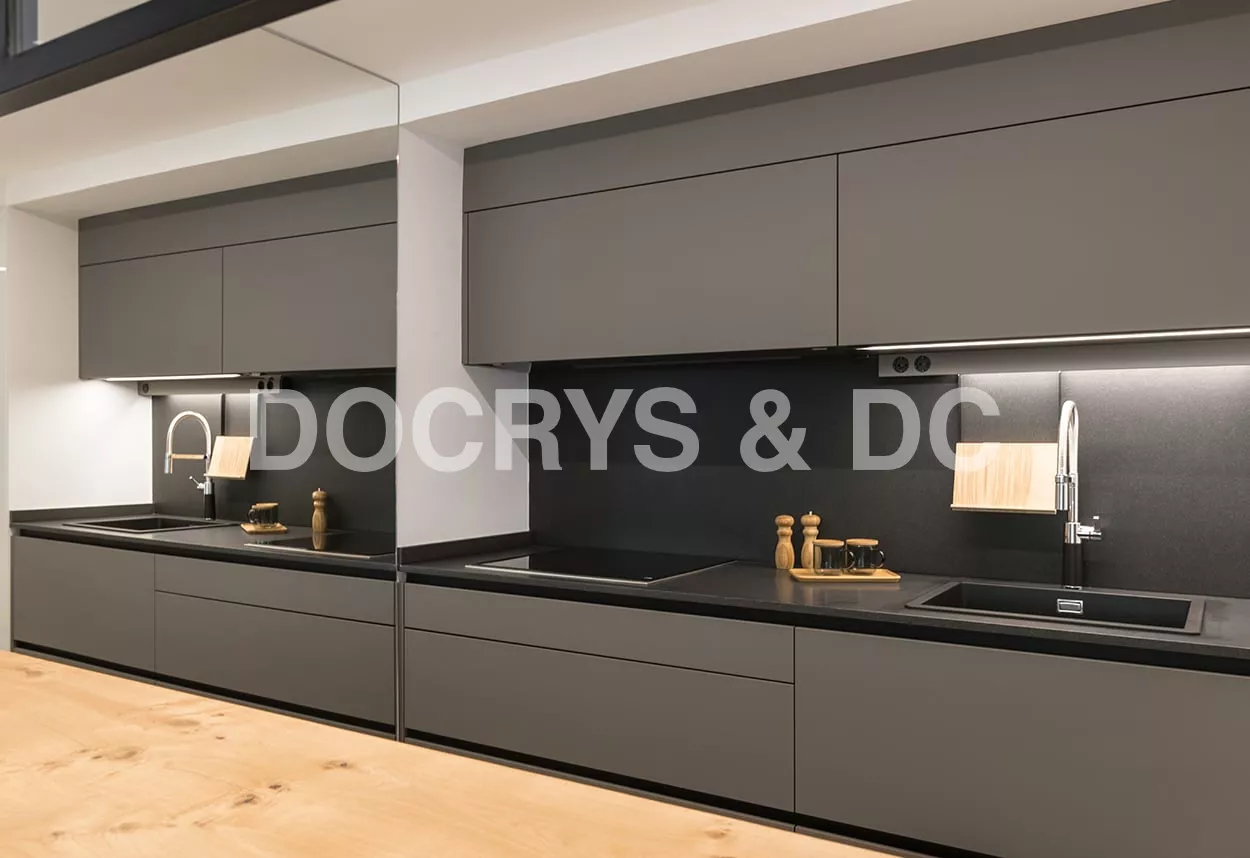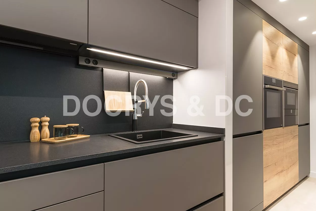 La distribución de esta cocina moderna es en paralelo, cuenta con dos frentes, uno de ellos compuesto por muebles altos, muebles bajos y columnas, donde se ubican los grandes electrodomésticos. En este frente, se ubica la zona de aguas y la zona de cocción.