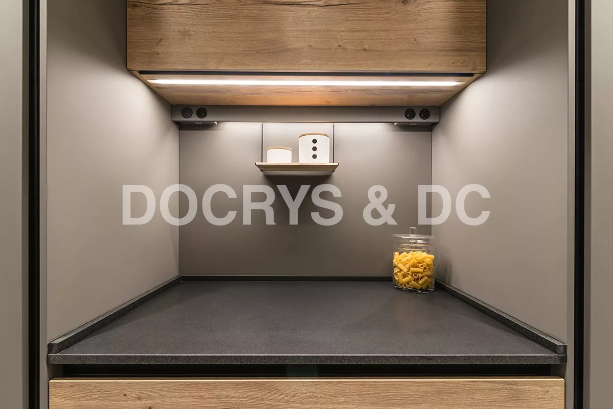 Cocinas Santos en color Gris visón seda y roble rústico sincro con material estratificado y laminado y encimera de Naturamia en color Sahara nights, acabado vintage.