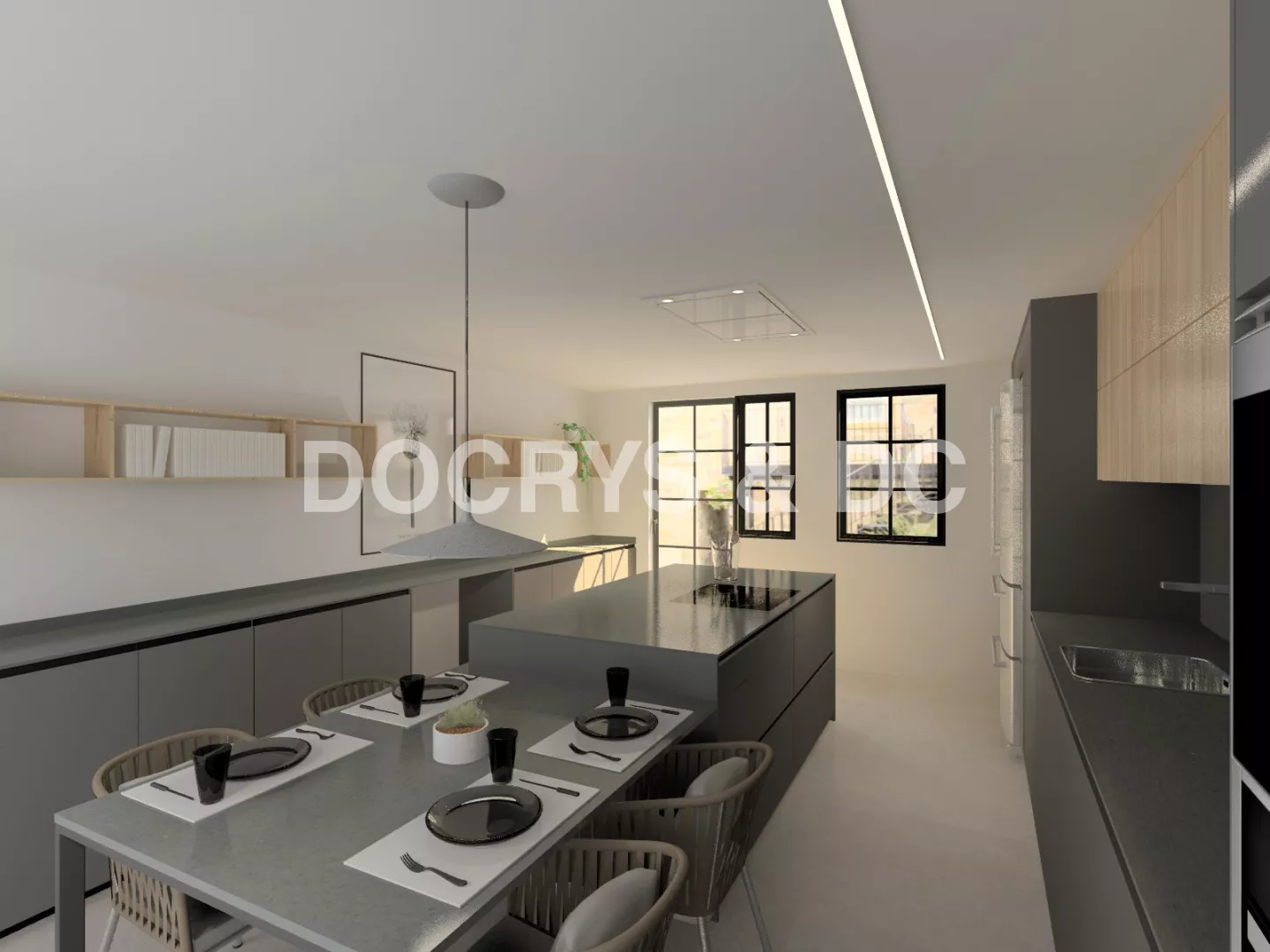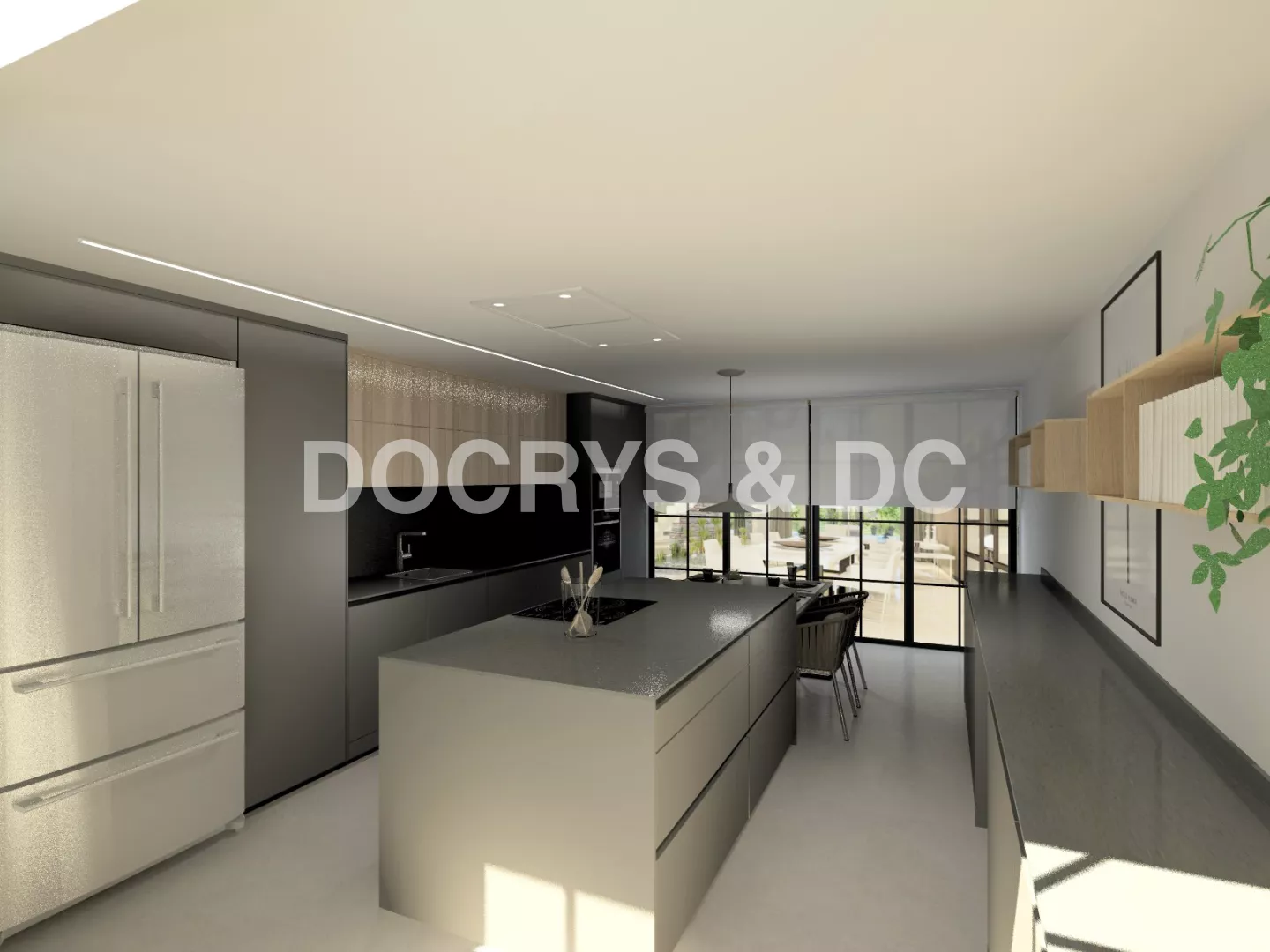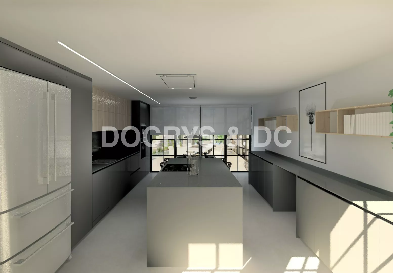 Cocina Santos Gris Antracita en material estratificado y chapa de madera natural. El diseño de esta cocina moderna se distribuye en dos frentes y una gran isla central que hace a la vez de office para cuatro comensales.
