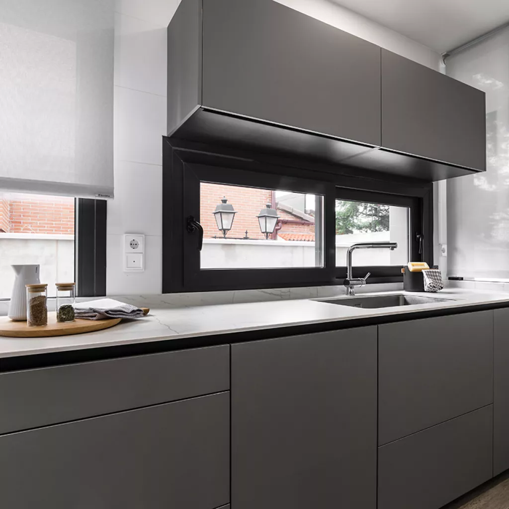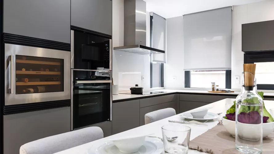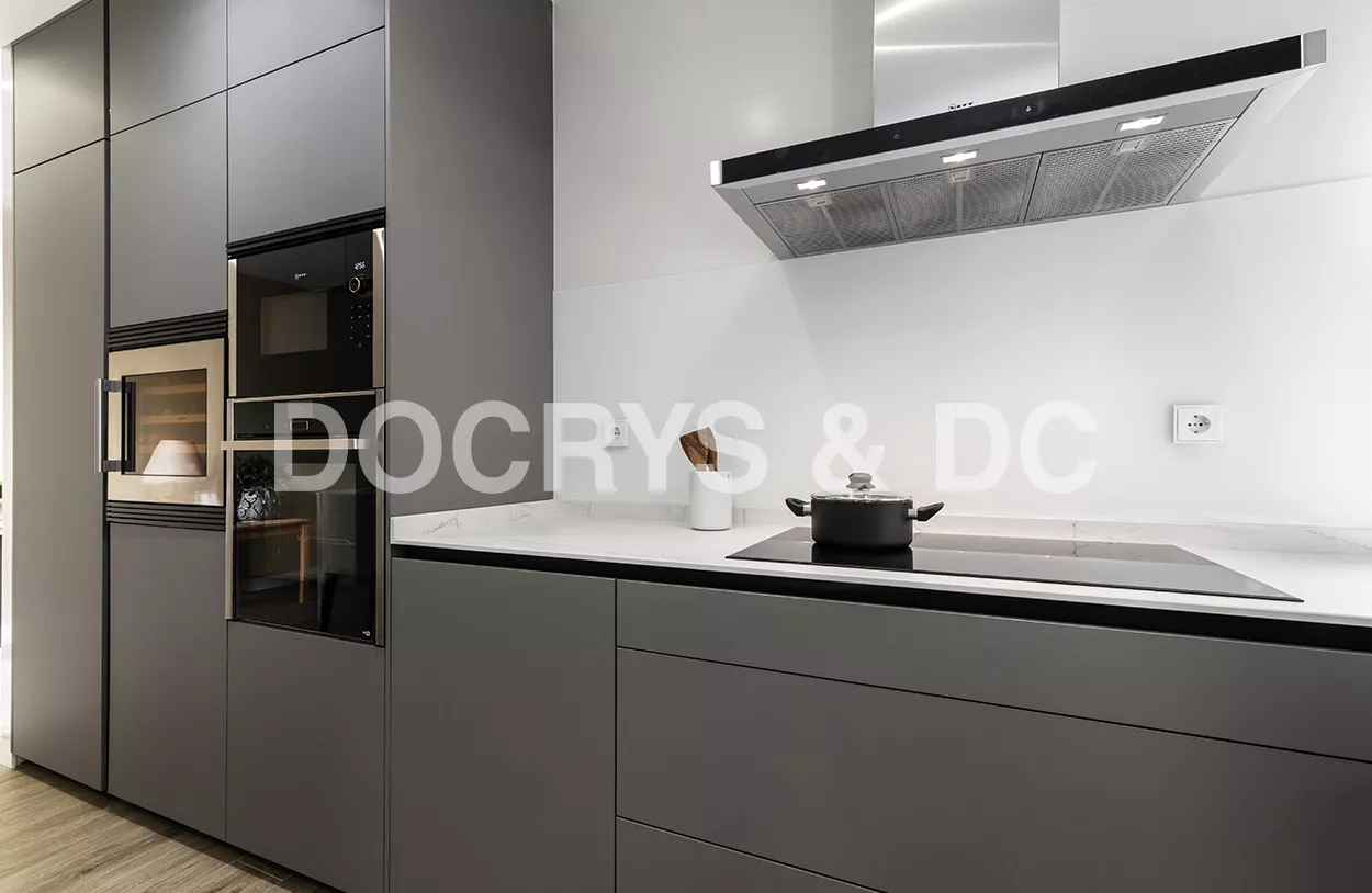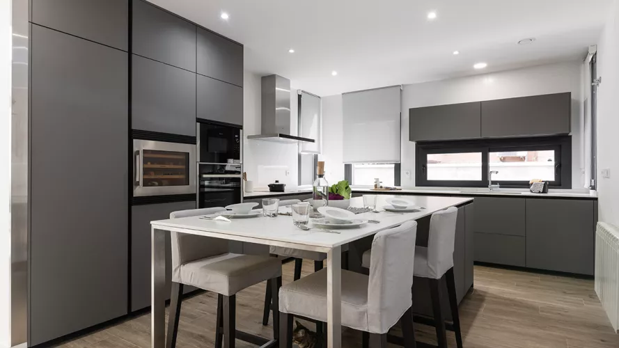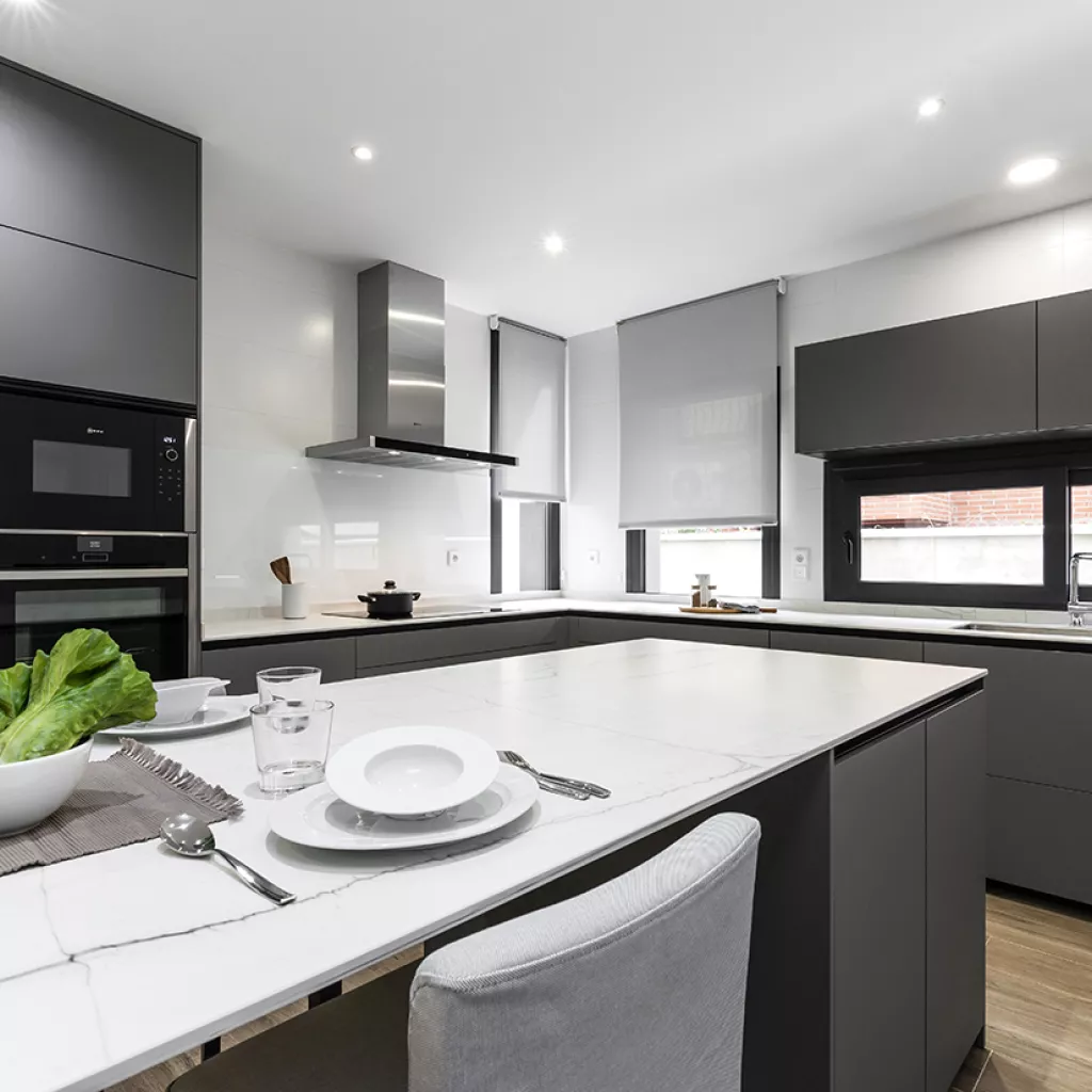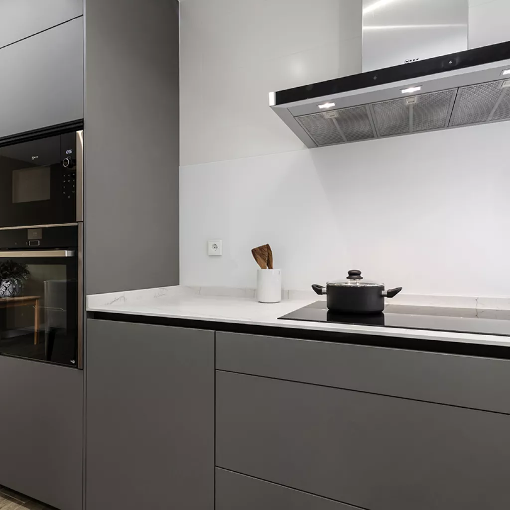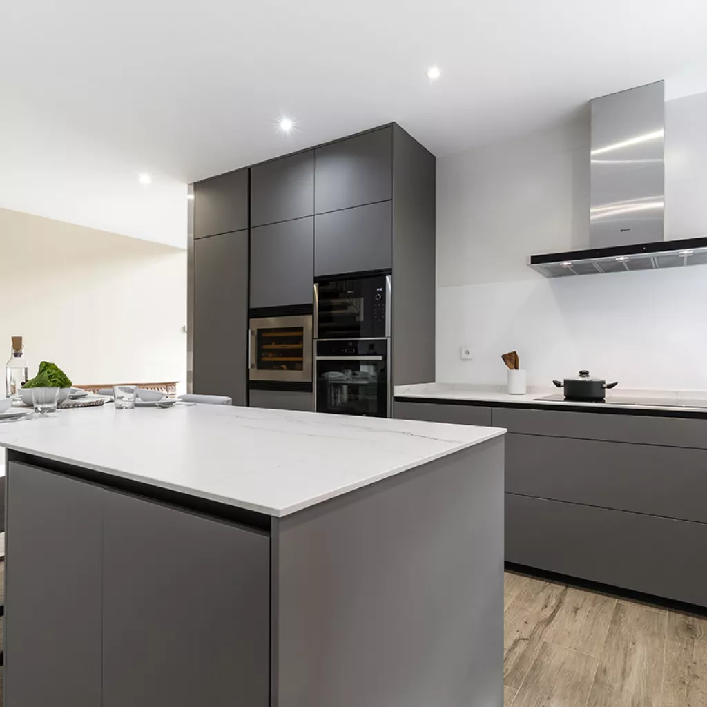 Cocinas Santos en color Gris Visón Seda con material estratificado y encimera de Neolith en color Montblanc acabado Suede.