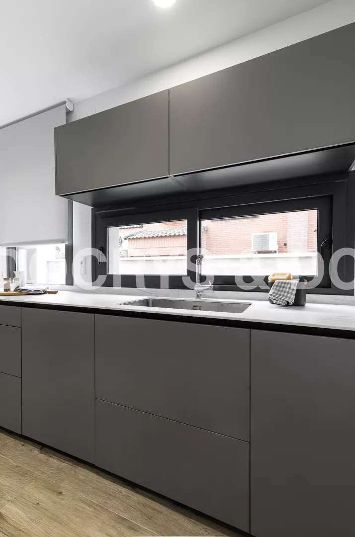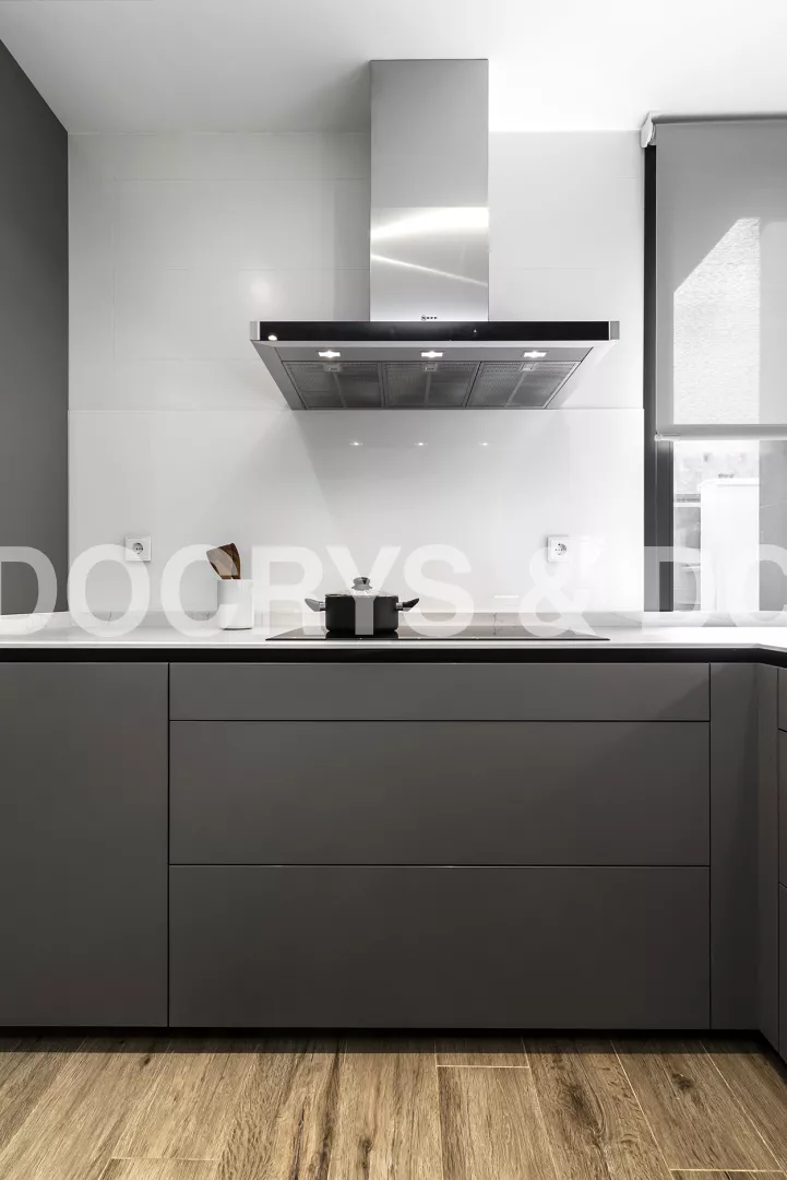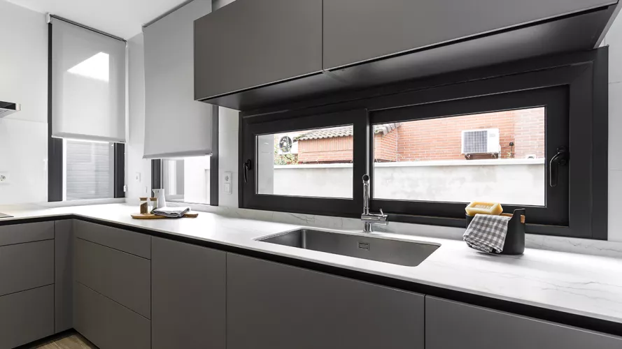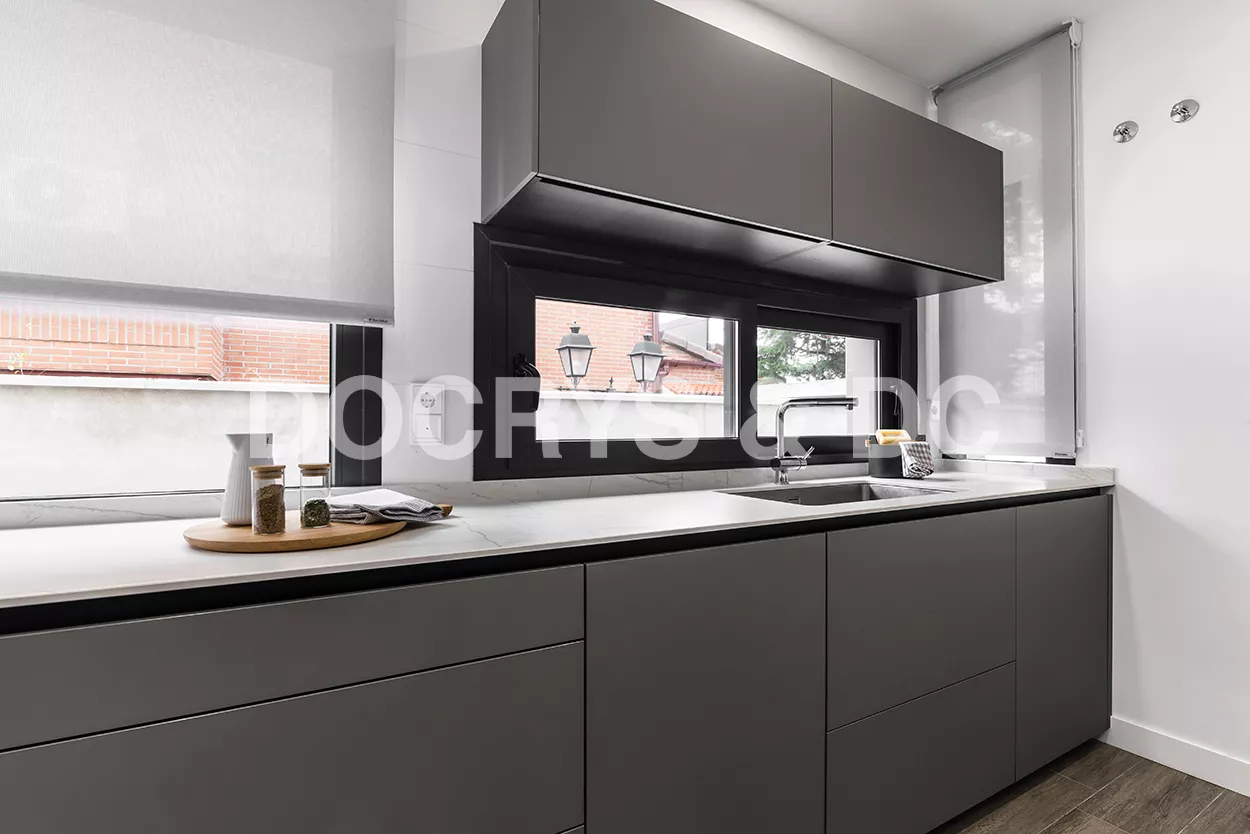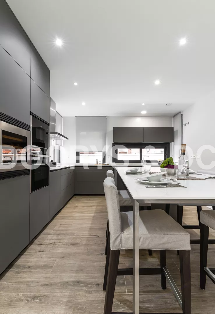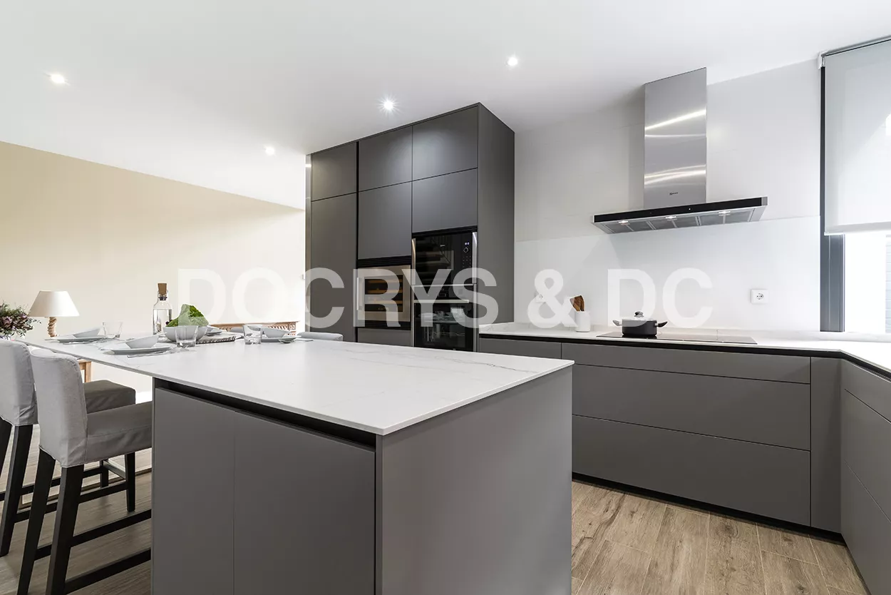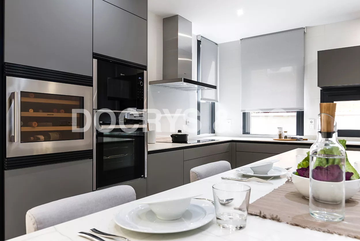 Cocinas Santos en color Gris Visón Seda con material estratificado y encimera de Neolith en color Montblanc acabado Suede.