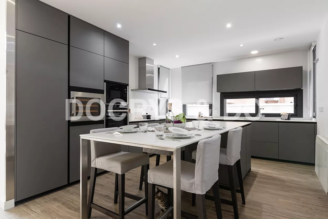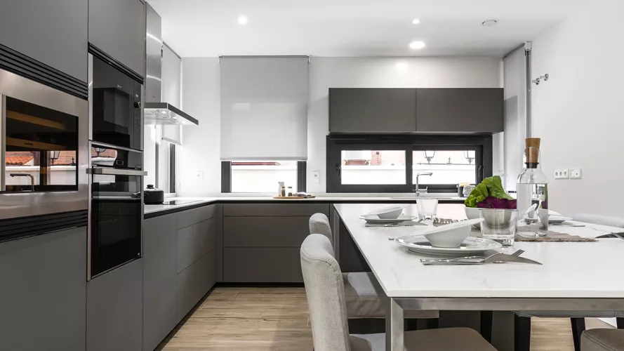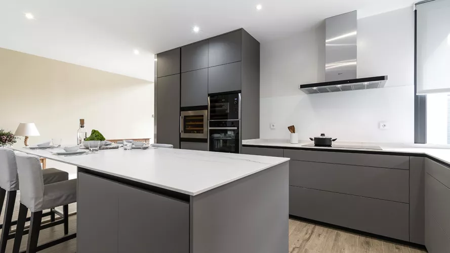 Cocina moderna en color gris visón en forma de L y con isla.