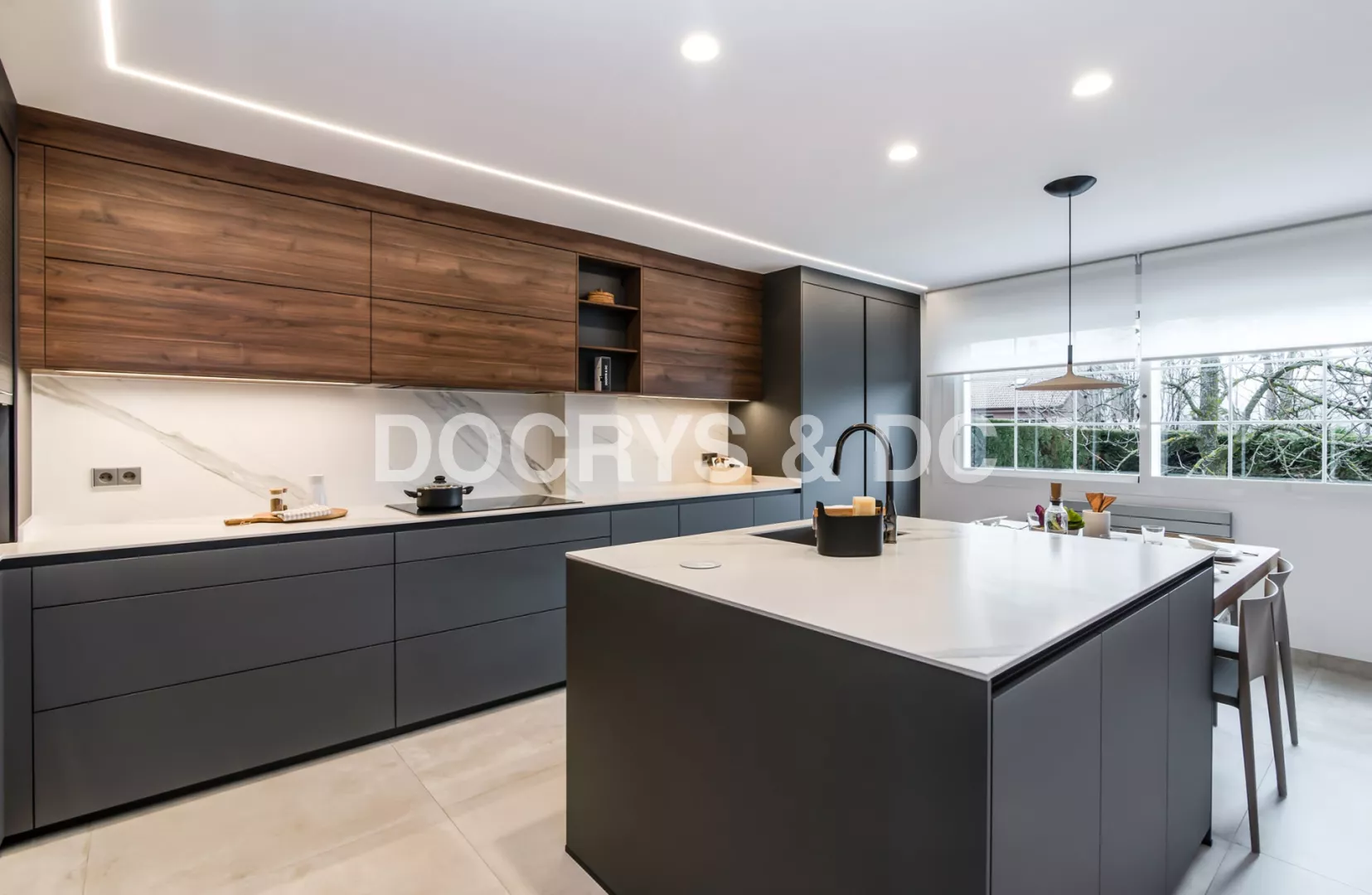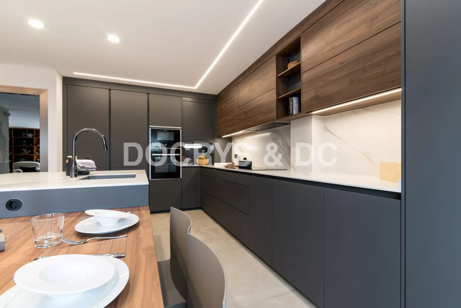 Cocinas Santos en color Gris antracita Seda y nogal tierra con material estratificado y encimera de Dekton en color Opera acabado Velvet.
