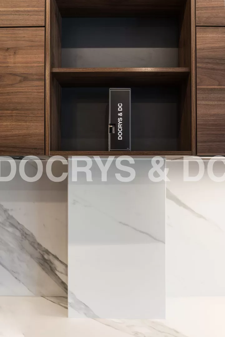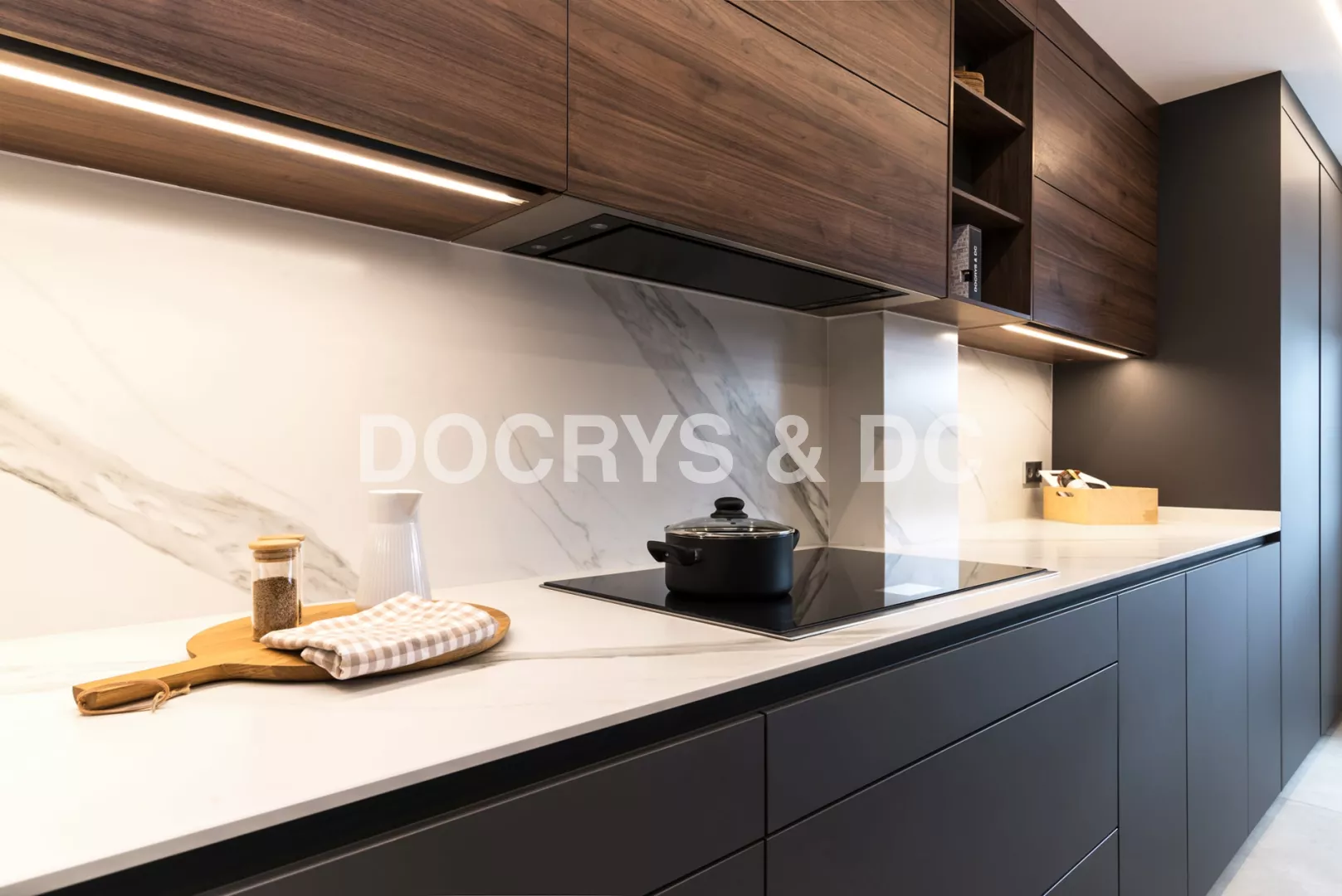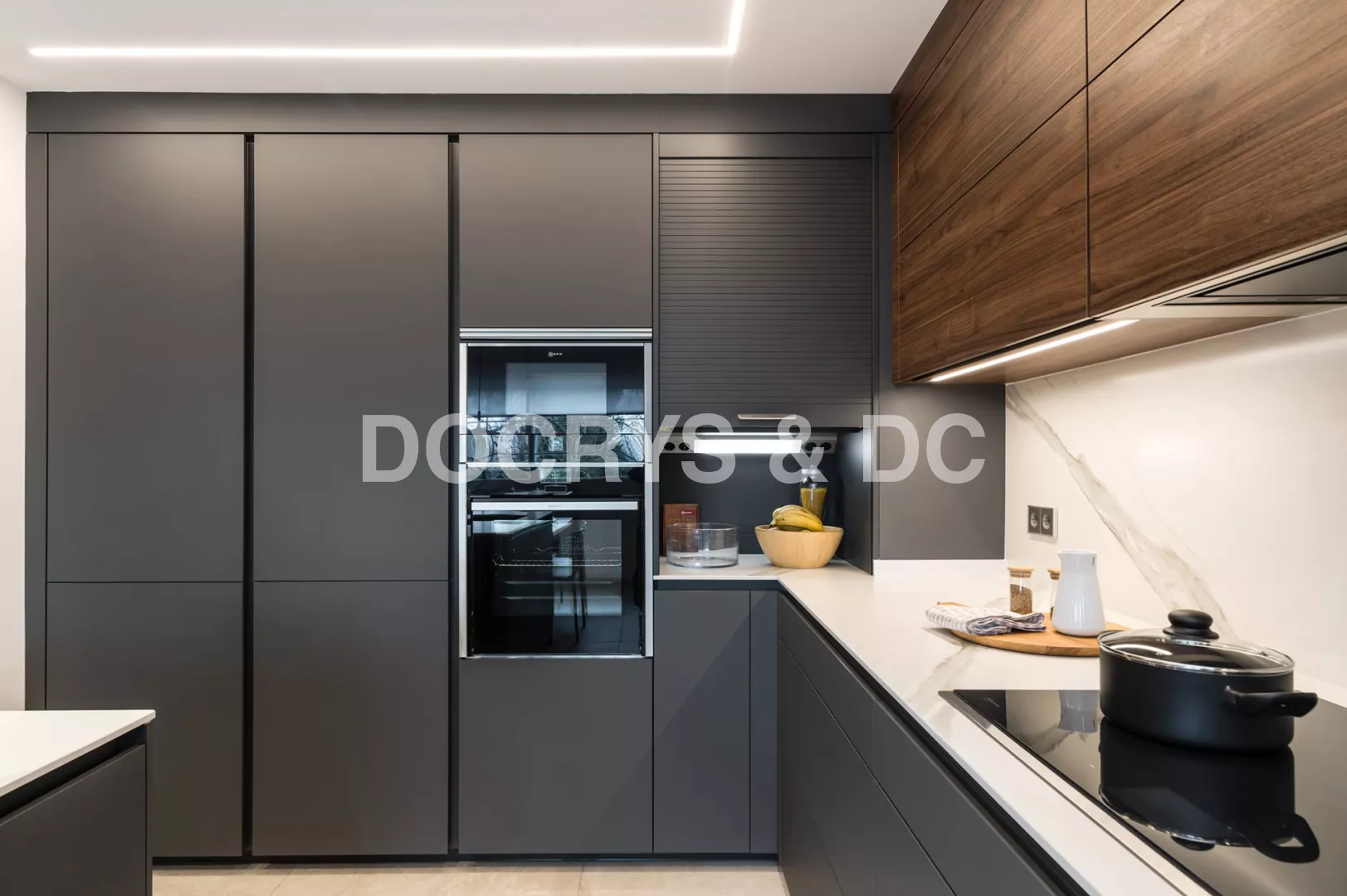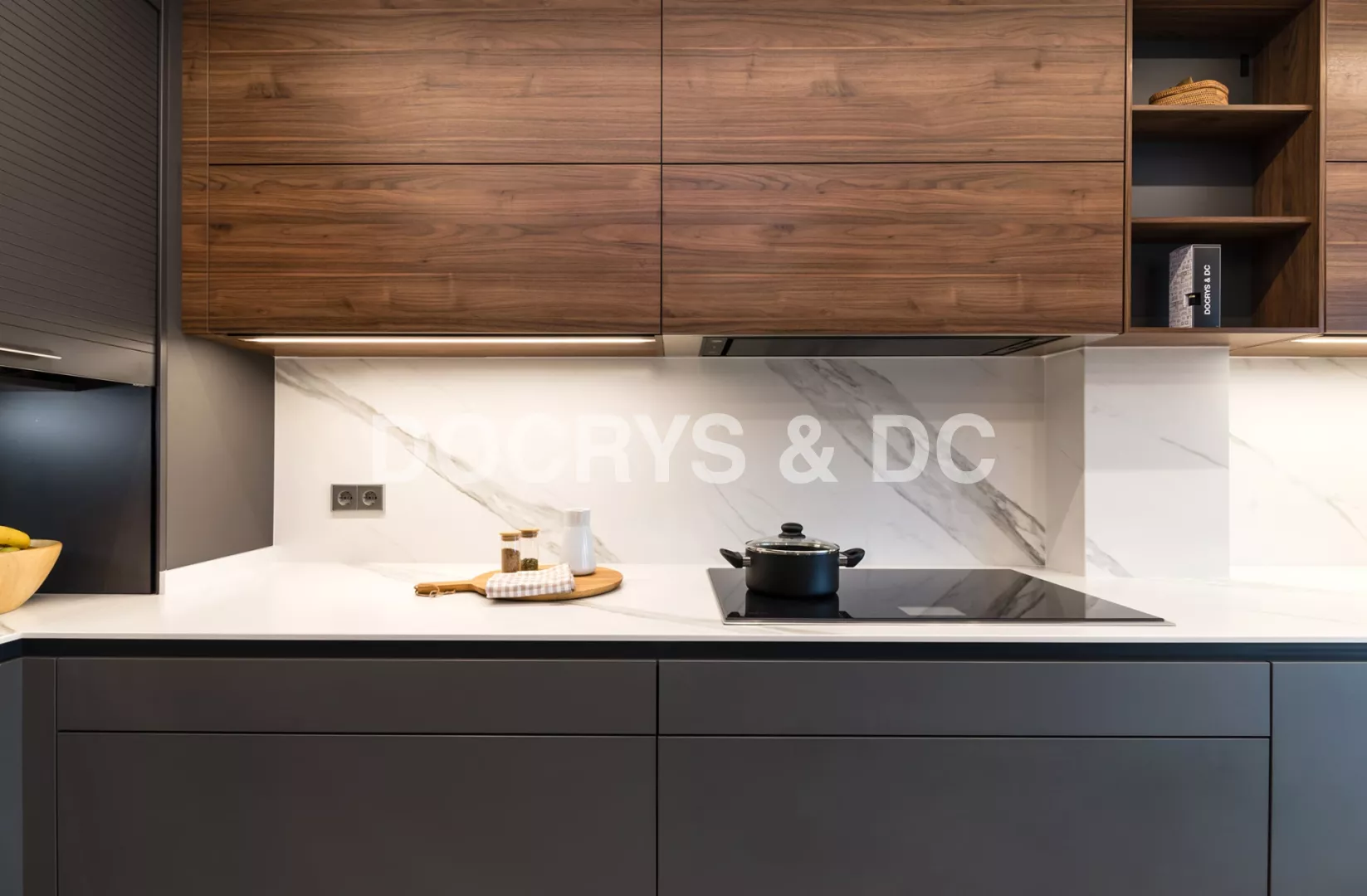 La combinación de los colores gris antracita y nogal tierra más el blanco de la encimera, dan como resultado un espacio muy elegante, además de funcional.