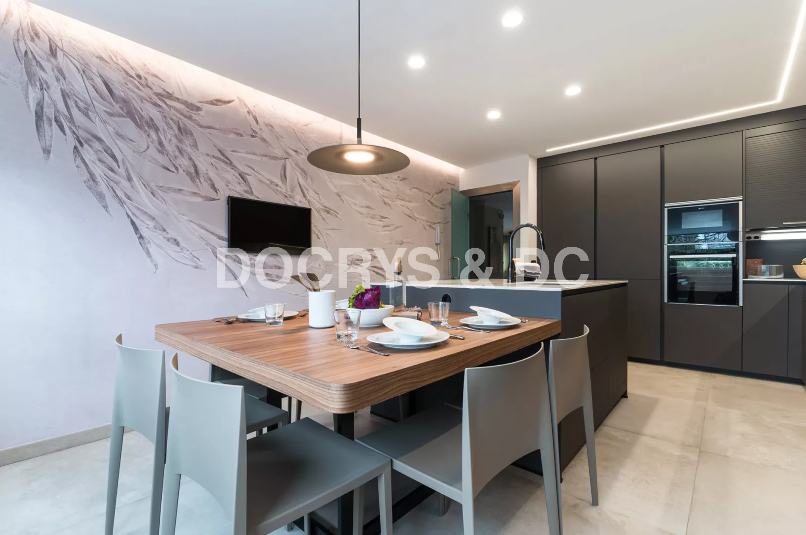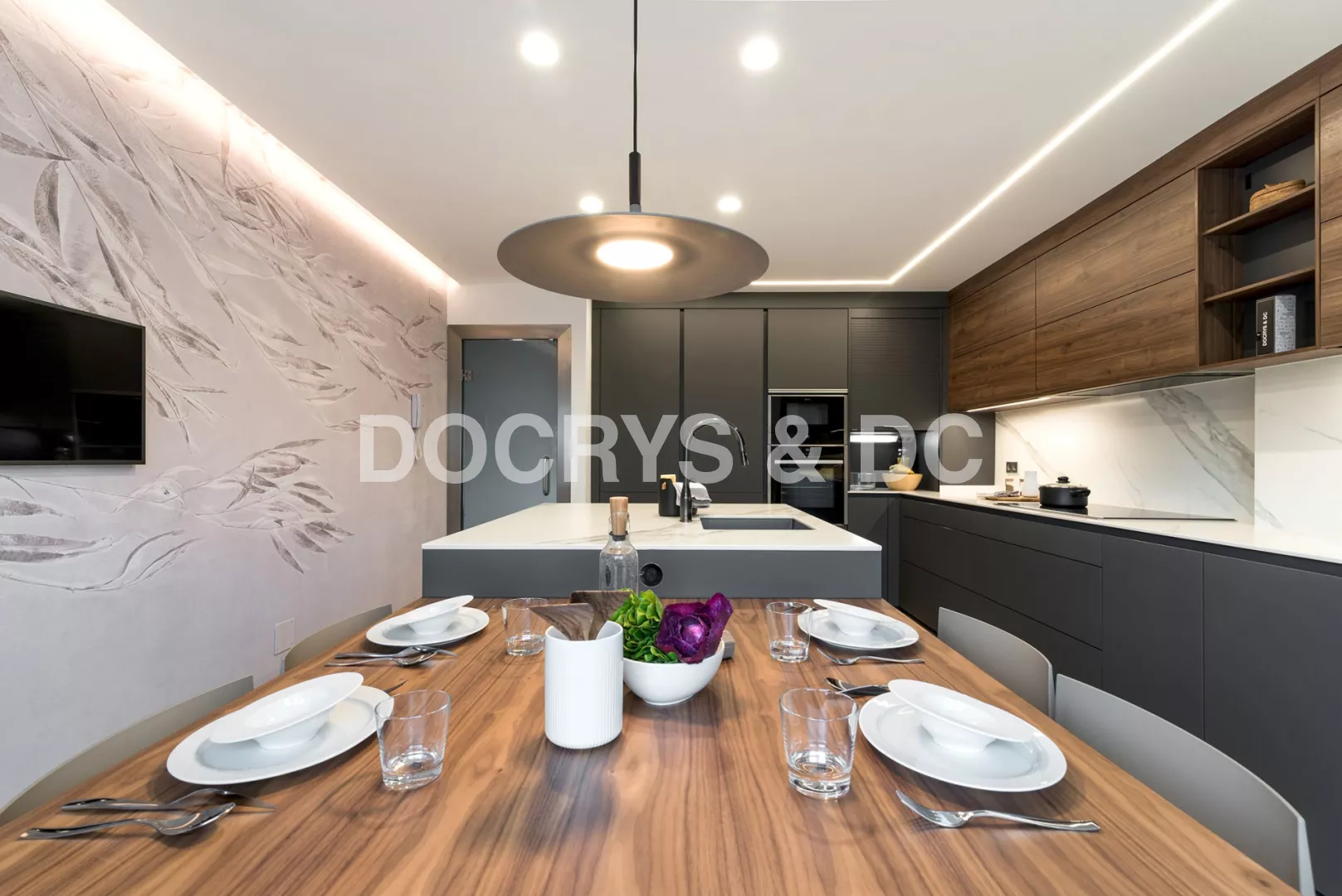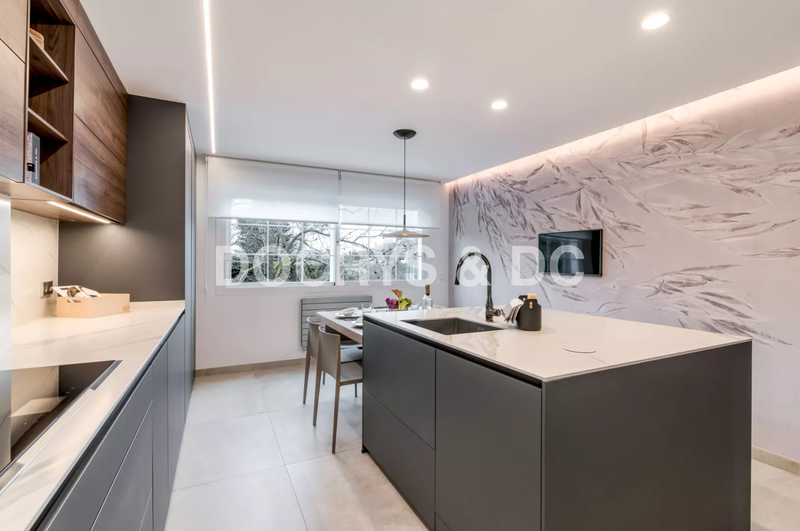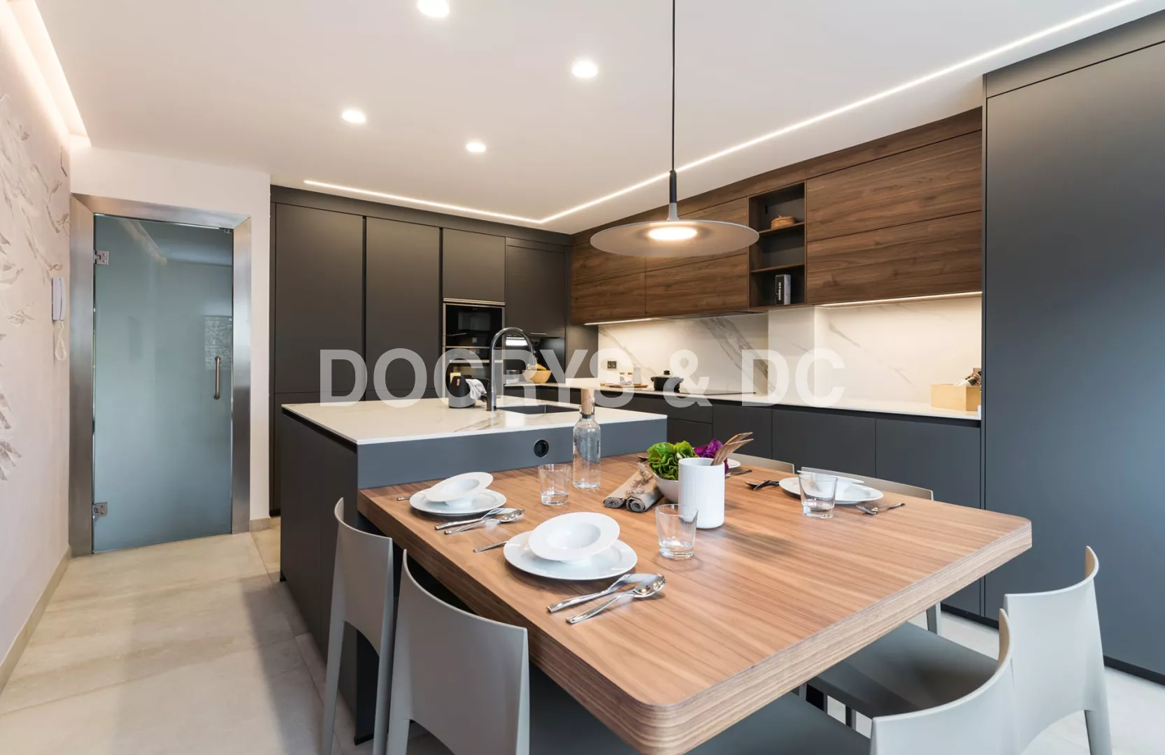 Como prolongación a la isla, hemos puesto una mesa en madera a modo de office para seis comensales.