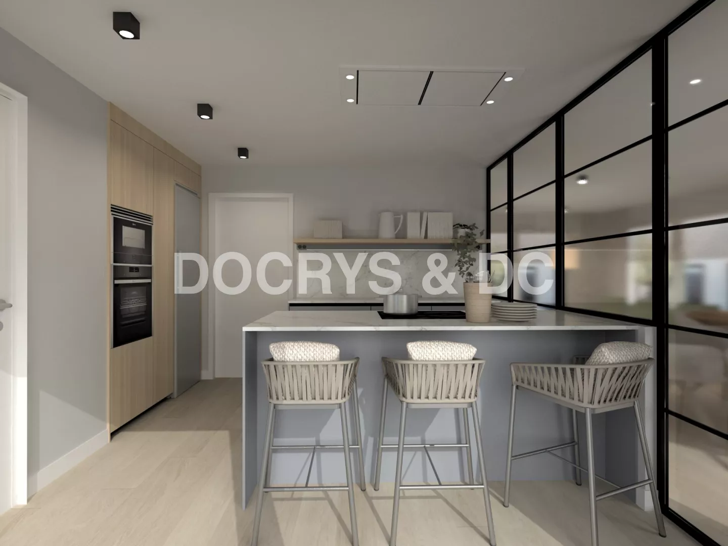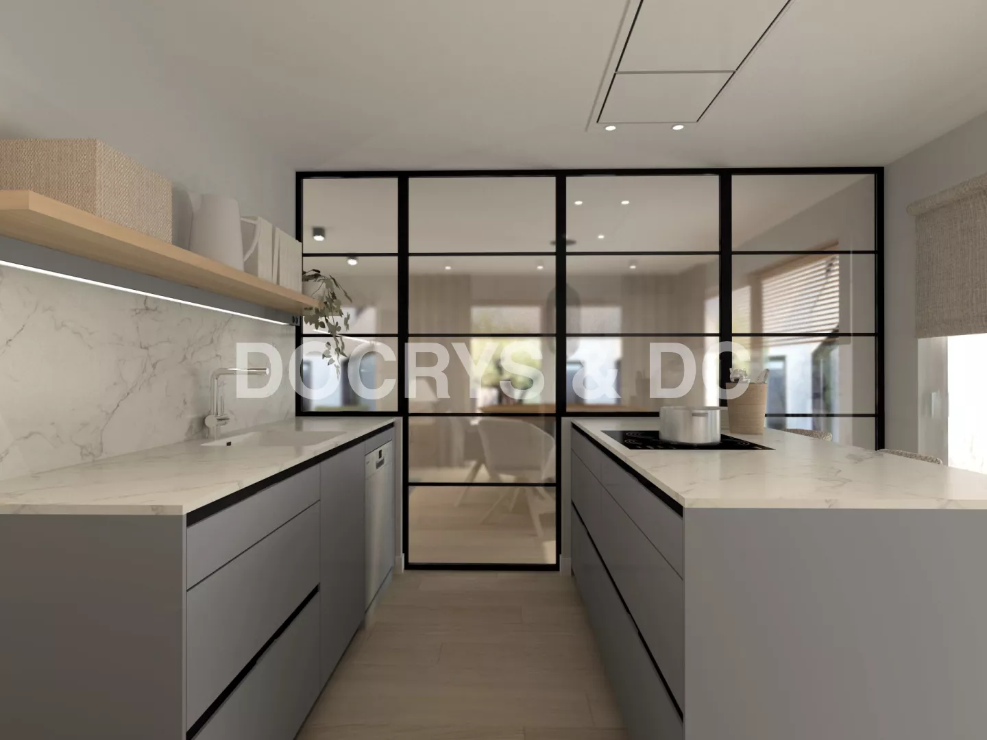 El espacio de esta cocina, está contiguo al salón y se ha utilizado un gran ventanal y puerta en cristal, creando un espacio separado pero sin romper la conexión visual de las estancias, además, ganamos luminosidad y amplitud en ambas estancias.