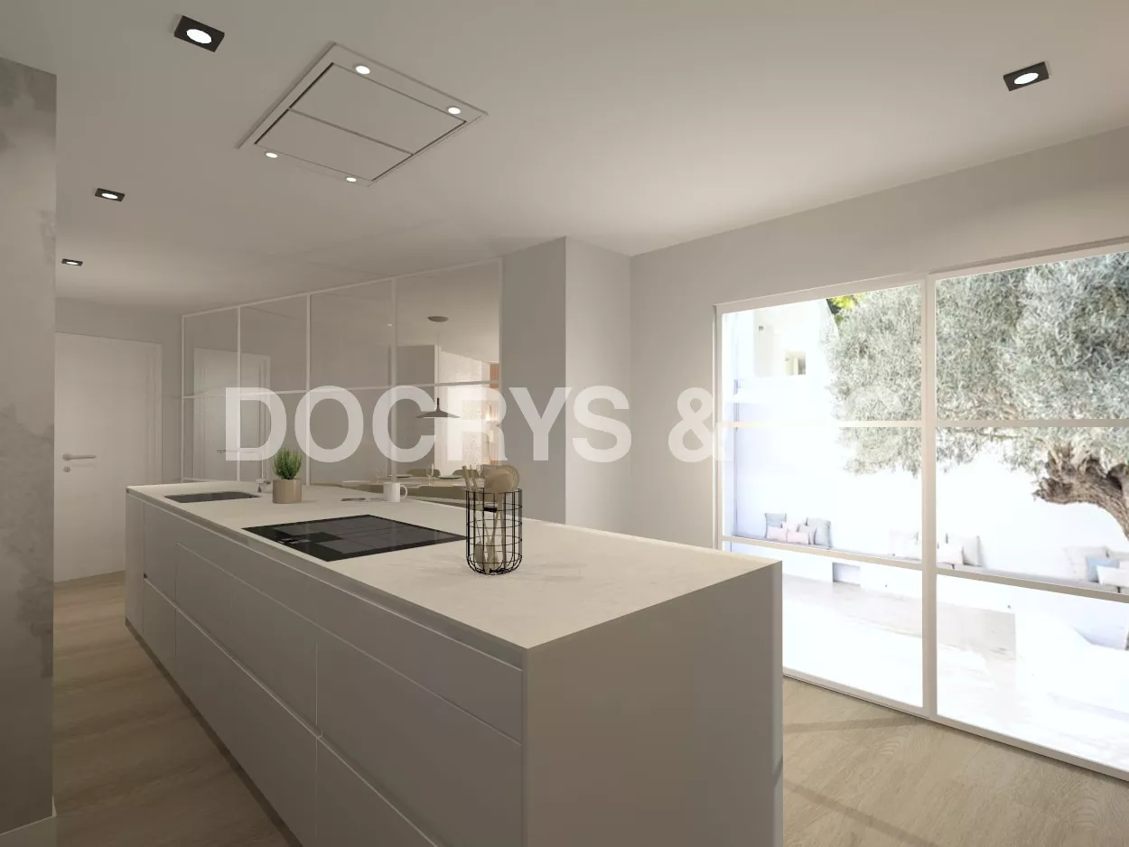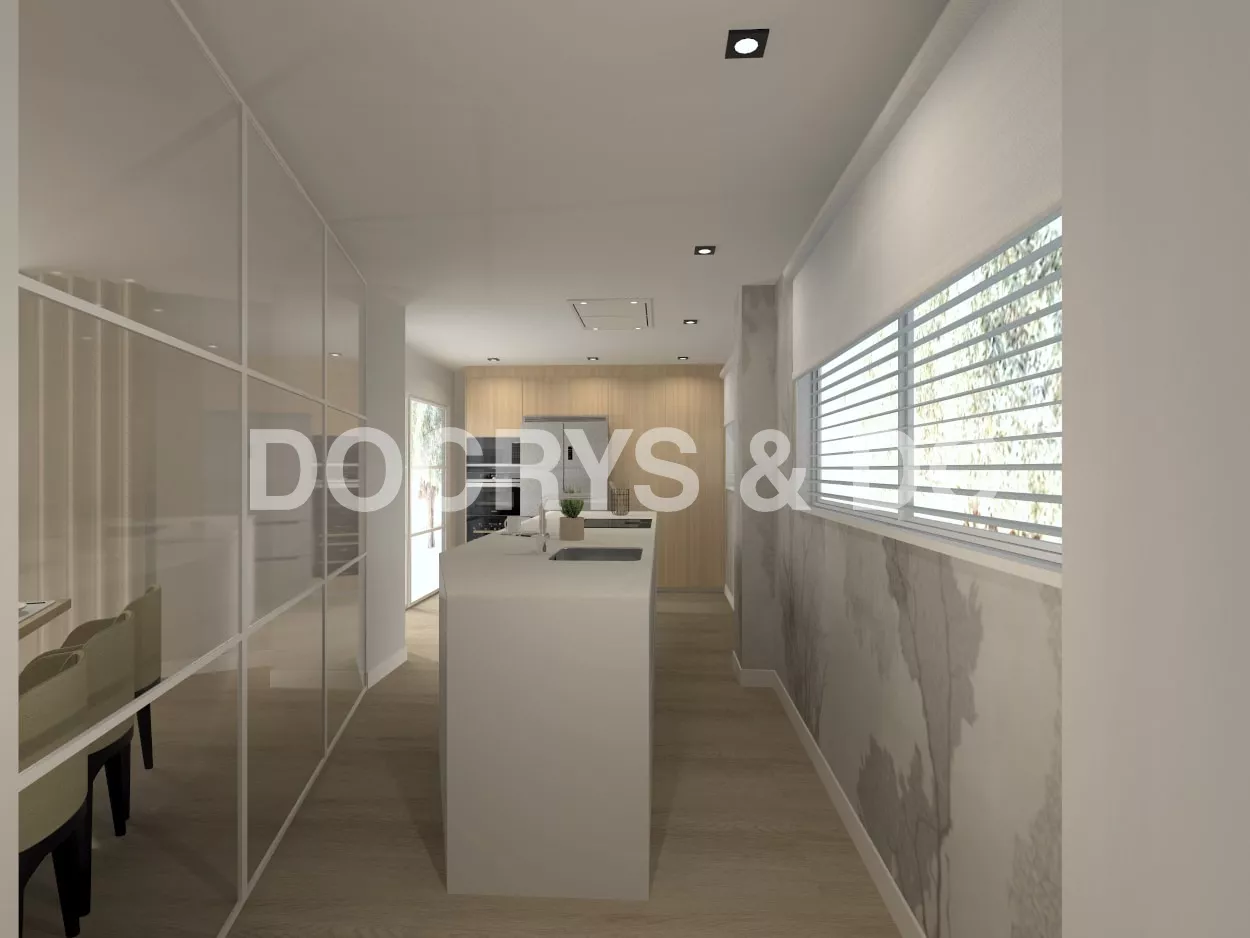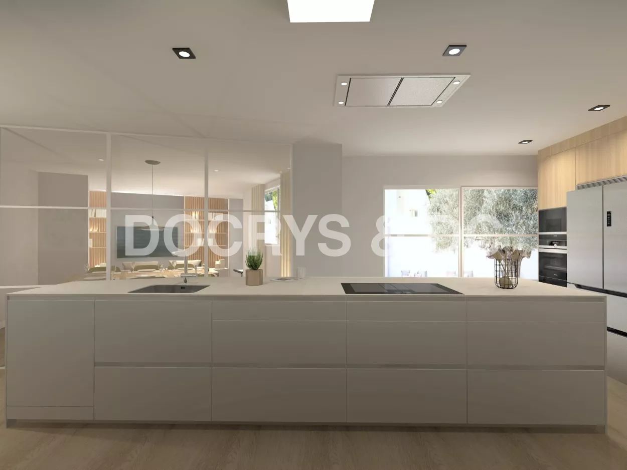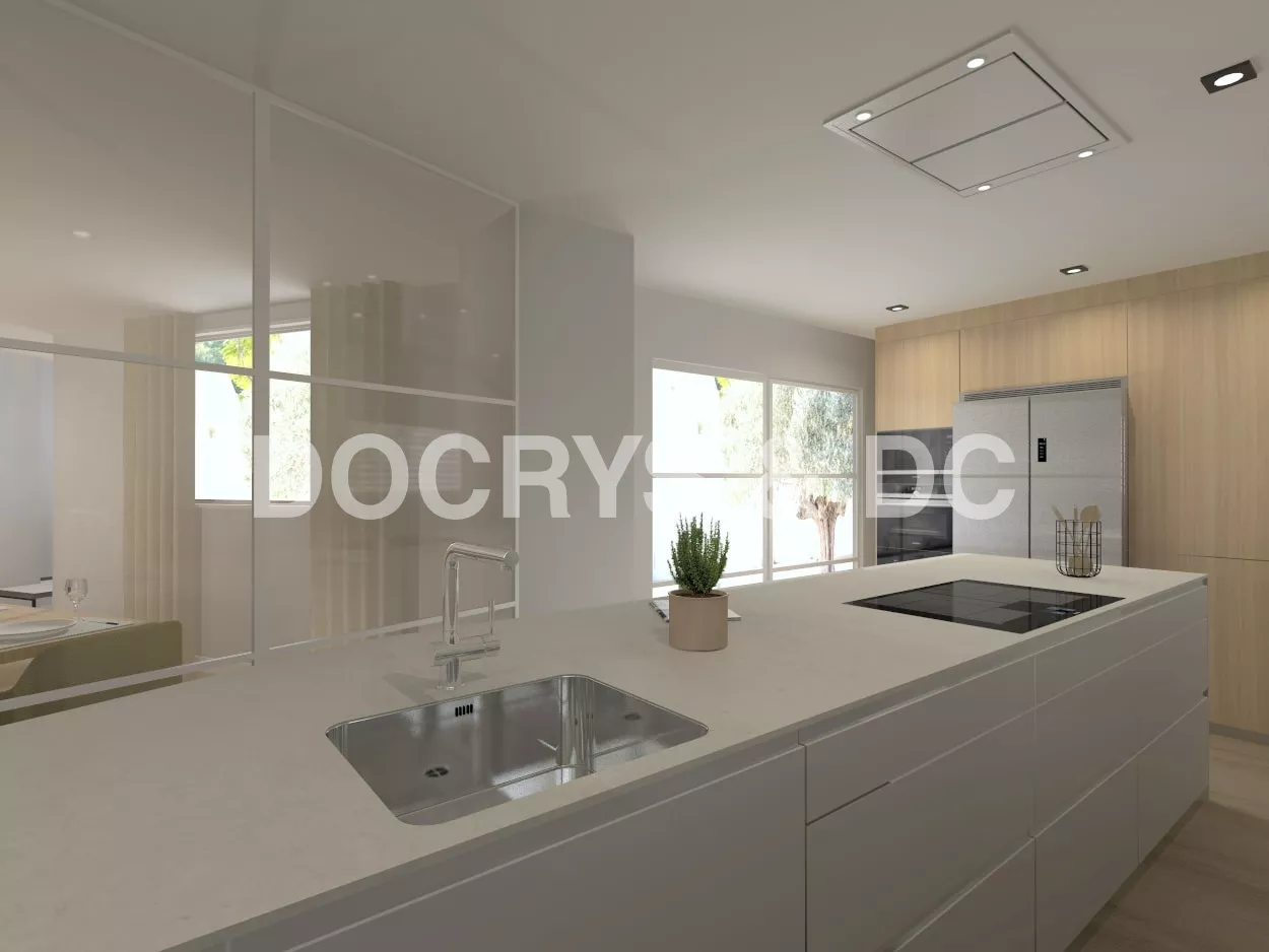 La cocina es semiabierta al salón, separadas ambas estancias por un gran ventanal compuesto por cuarterones, convirtiéndose en el núcleo principal de la vivienda, siendo un espacio de diseño, moderno y funcional.