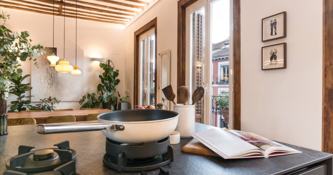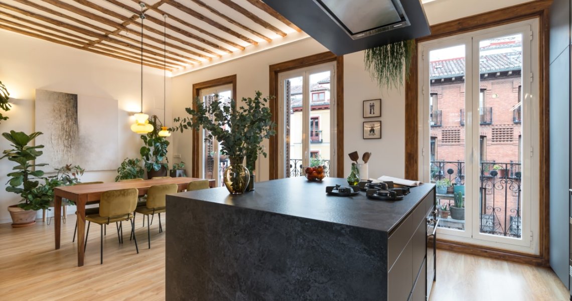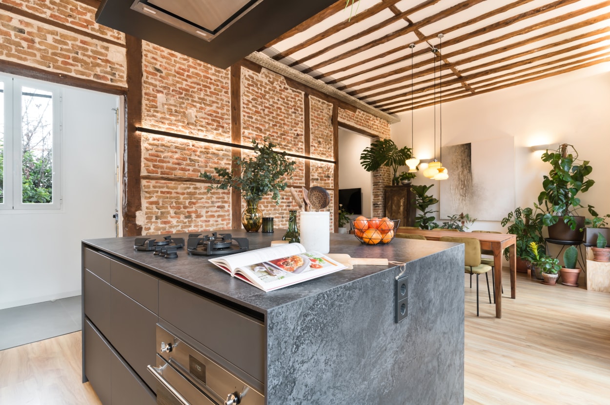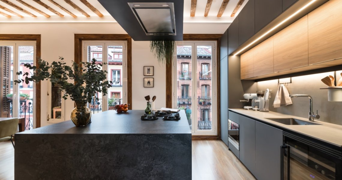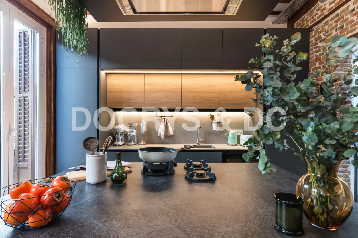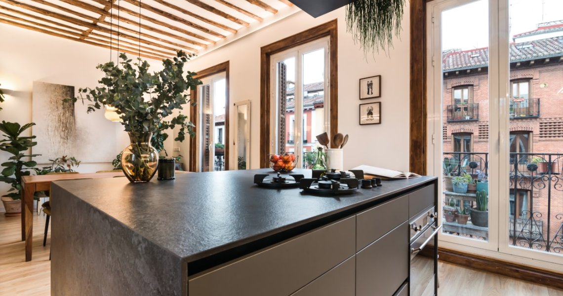 Esta cocina abierta al salón, forma parte del centro de la vivienda, con carácter y personalidad, luminosa y práctica.