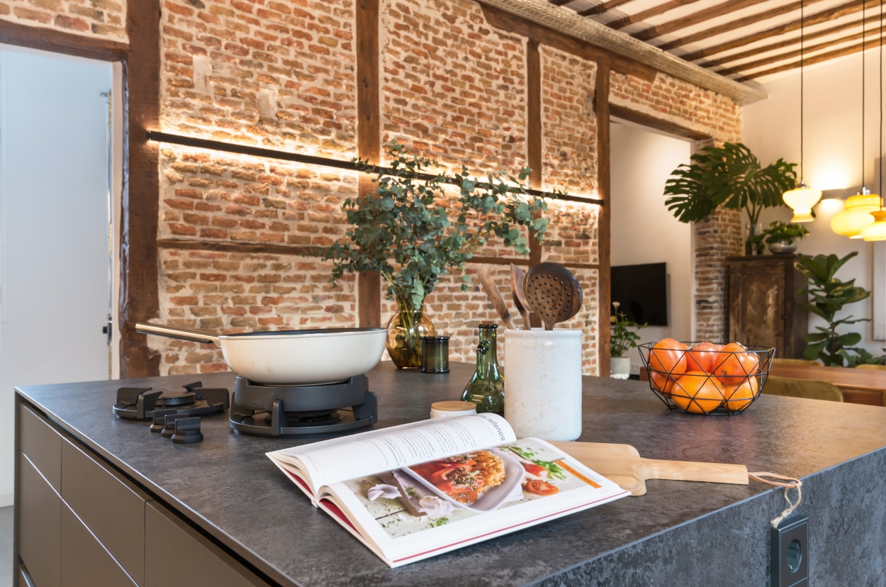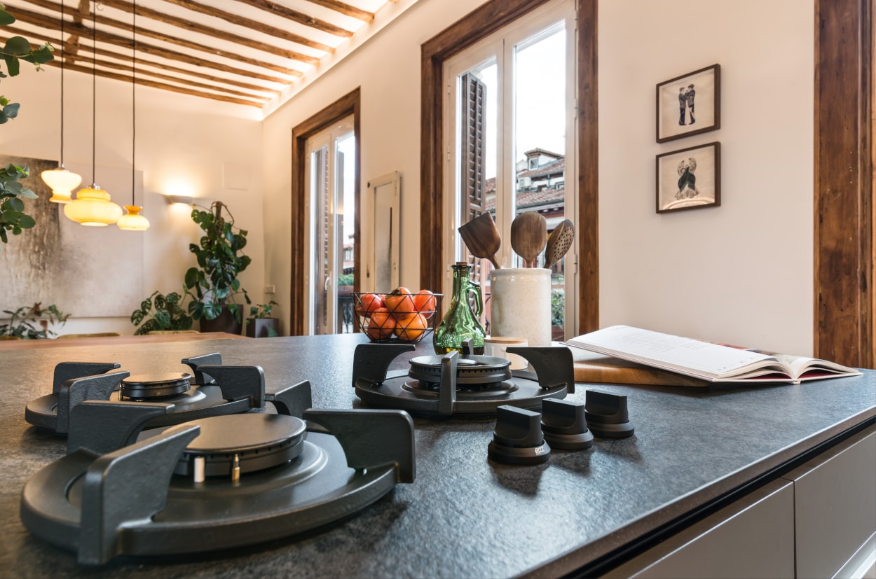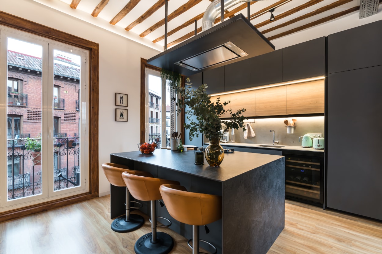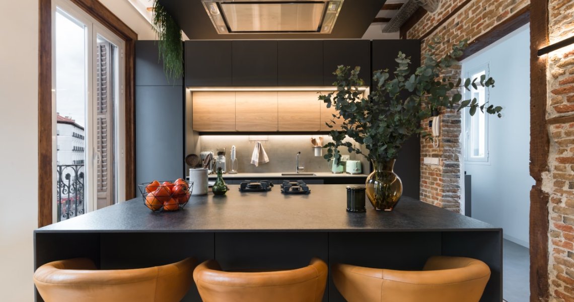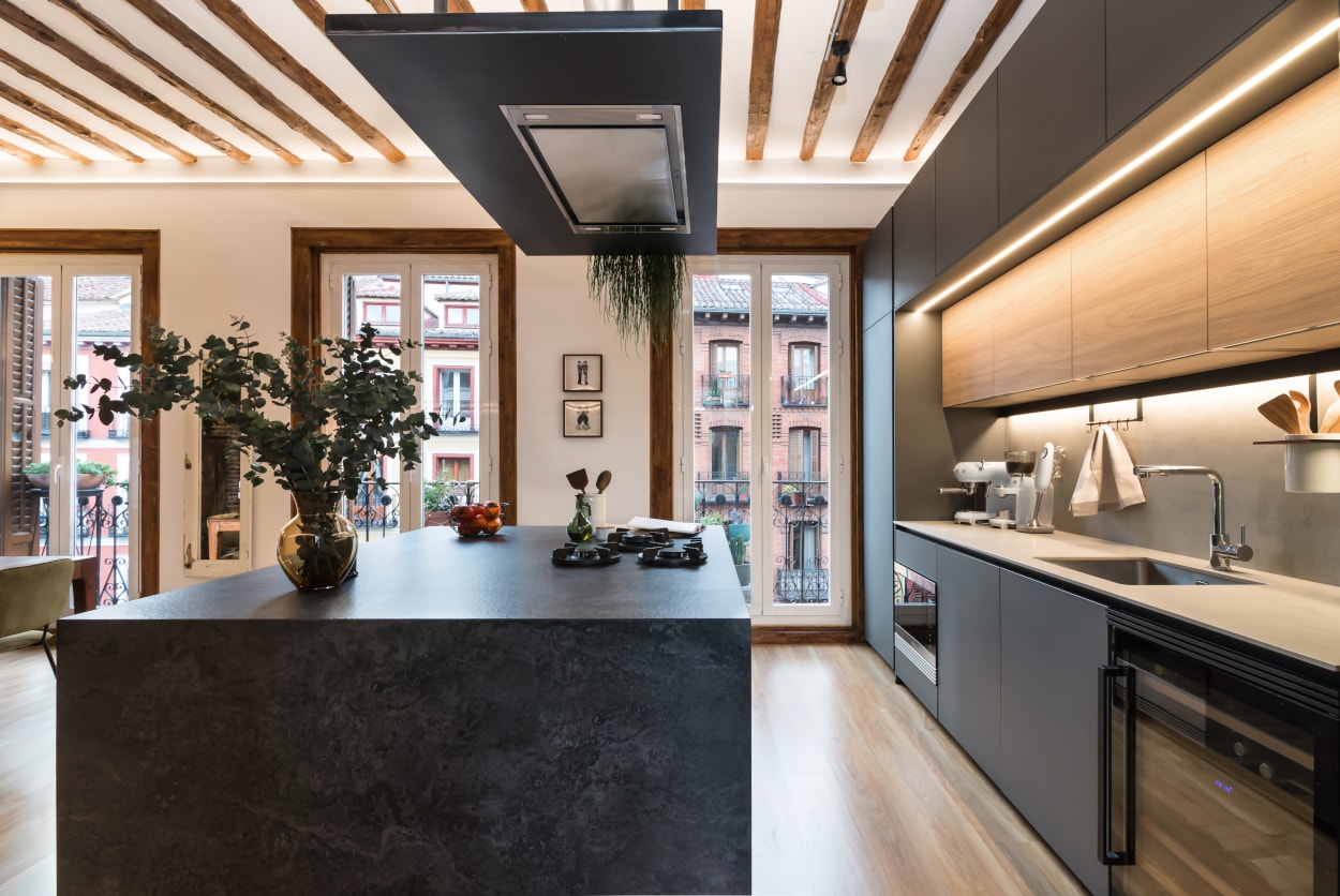 Por otro lado, la isla central, protagonista de la estancia, es donde se ubica la zona de cocción gracias a los fuegos integrados en la encimera de la firma Pitt Cooking , además de una extensa zona de trabajo y una barra para tres comensales.