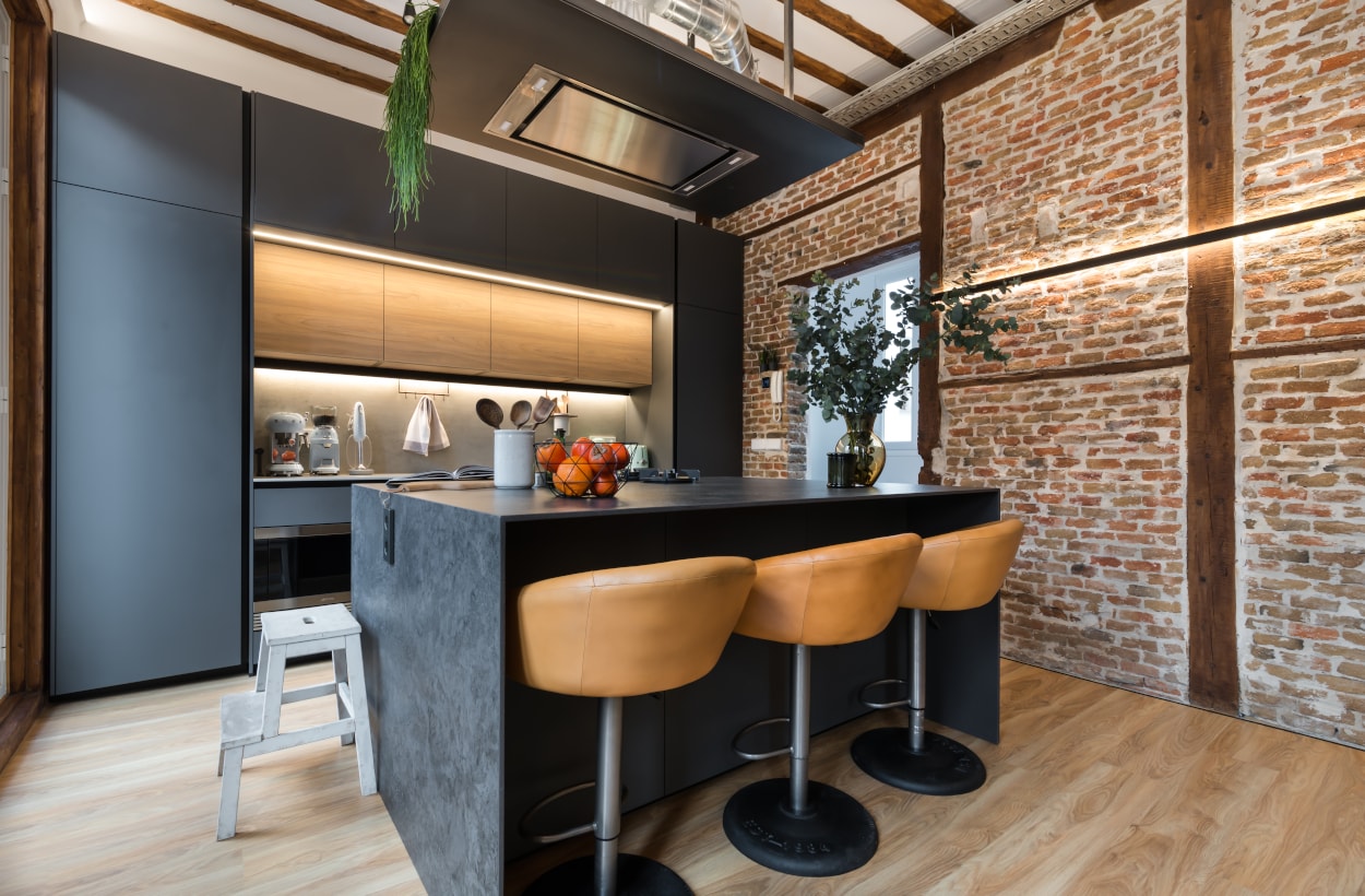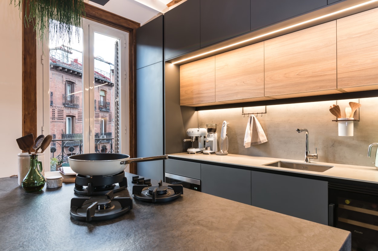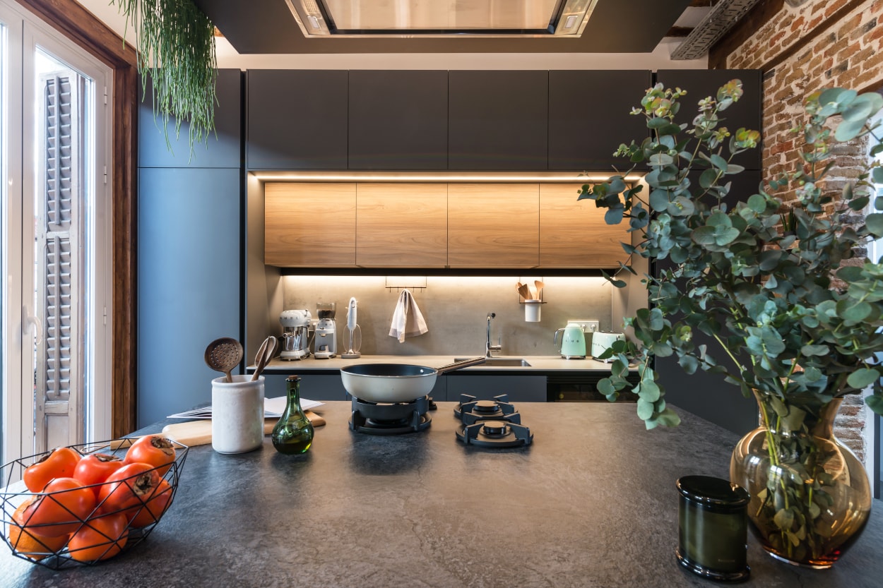 El mobiliario de líneas sencillas, en color gris y olmo, se integran a la perfección en el espacio y su distribución junto a la isla central, crea un espacio funcional y práctico.