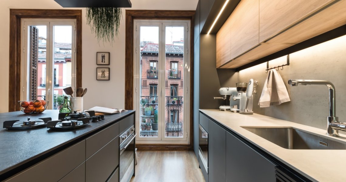 El frente de la cocina, acoge la zona de aguas, además de varias columnas donde se integran los grandes electrodomésticos.