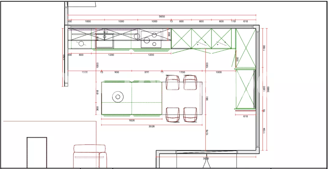 El frente en forma de L, está compuesto por muebles altos, muebles bajos, columnas y un desayunador. Esta zona acoge la zona de aguas, la zona de cocción y los grandes electrodomésticos.