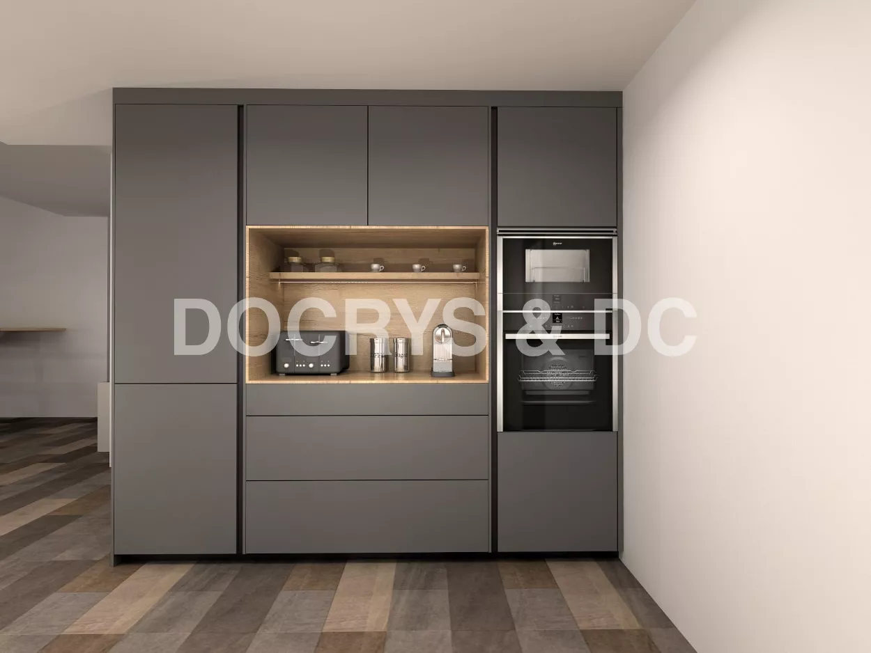 Cocinas Santos en color Gris antracita y roble rústico con material estratificado y laminado, modelo fine, plataforma E.