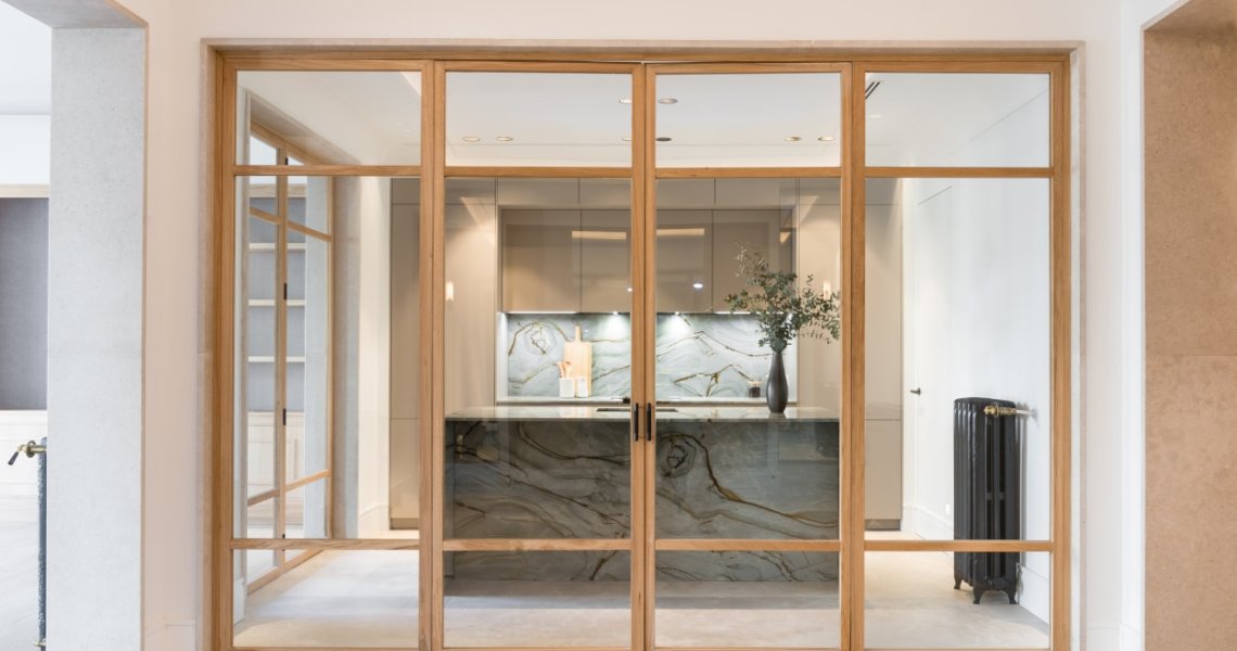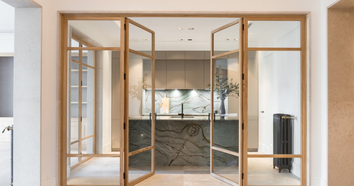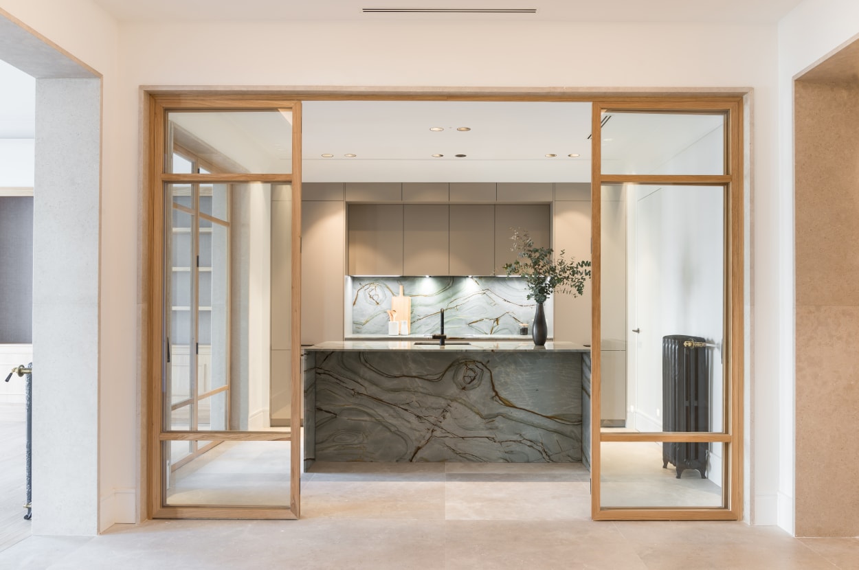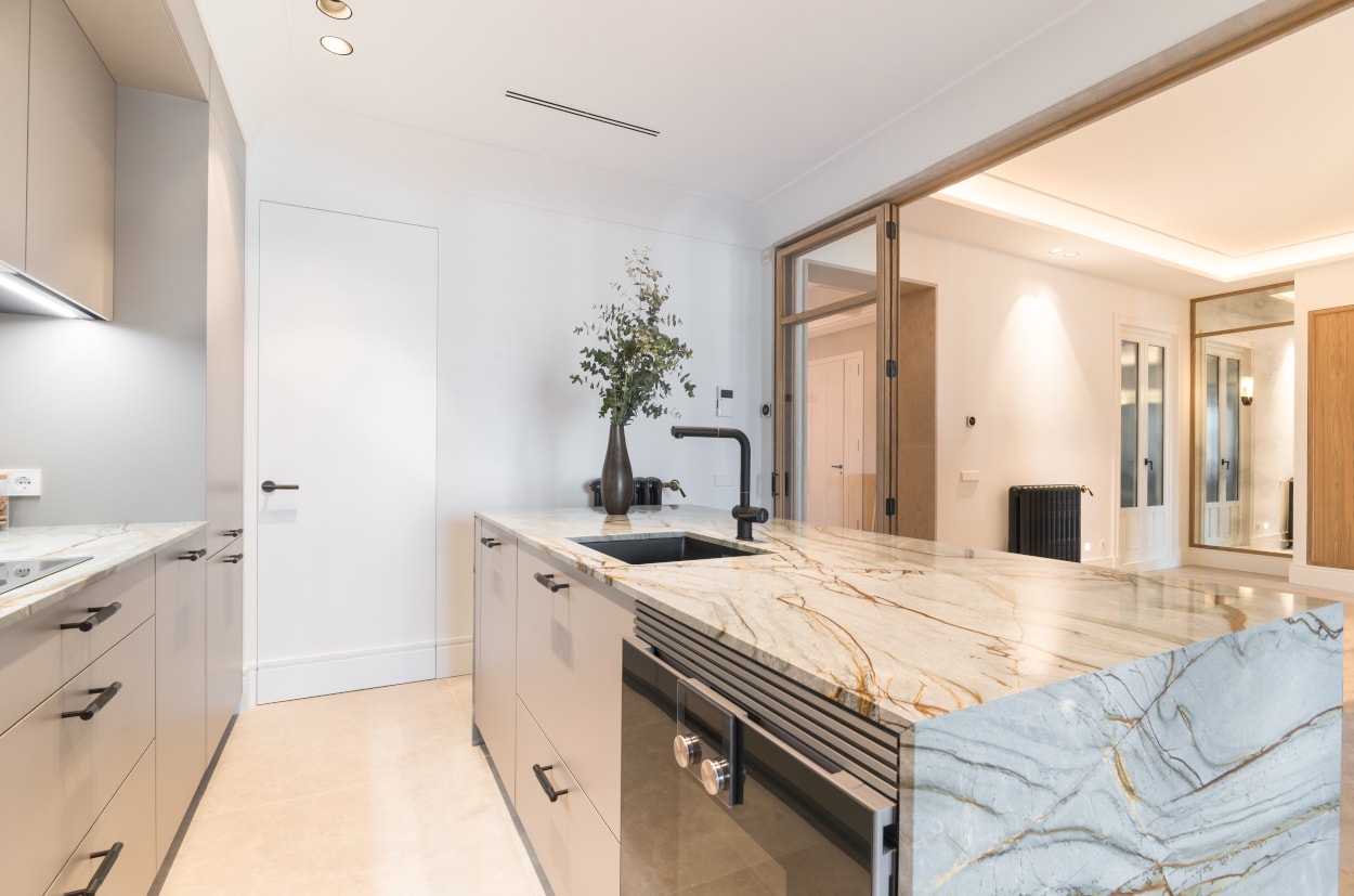 Esta cocina es semi abierta al salón, cuenta con unas grandes puertas en cristal y madera plegables, pudiendo dejar la cocina abierta o cerrada según la ocasión.
