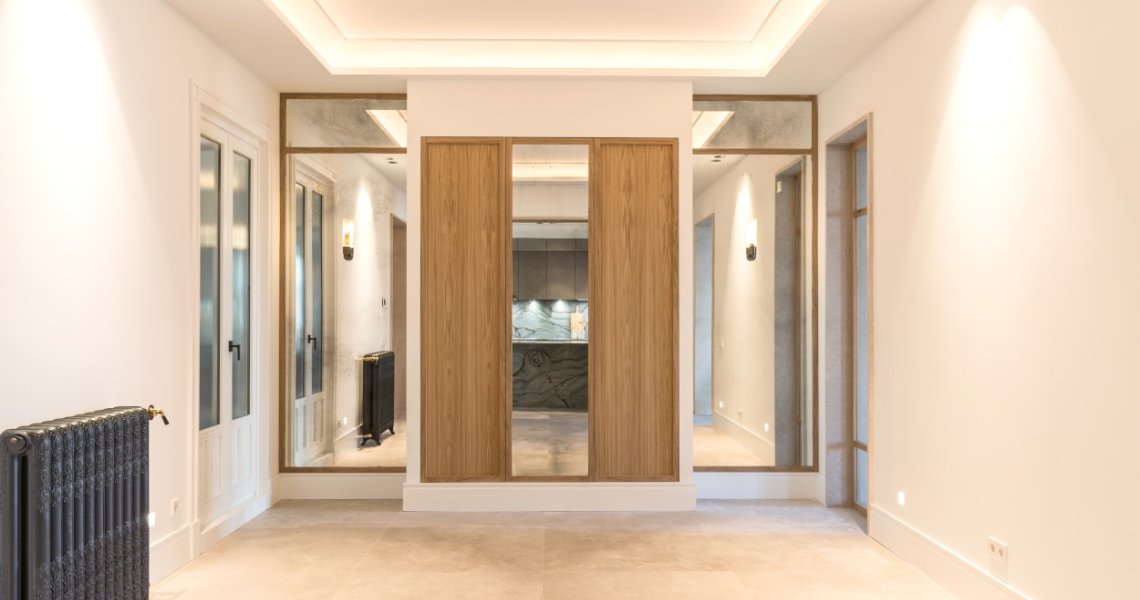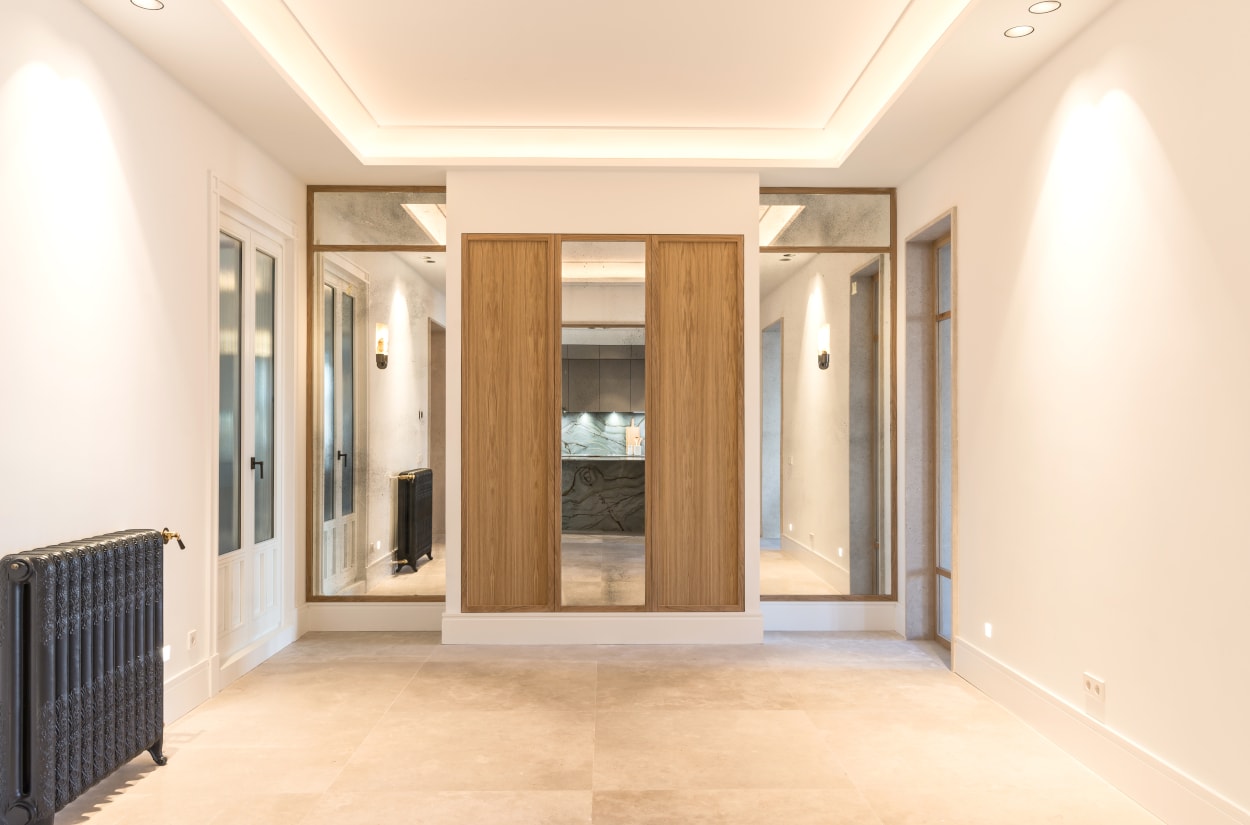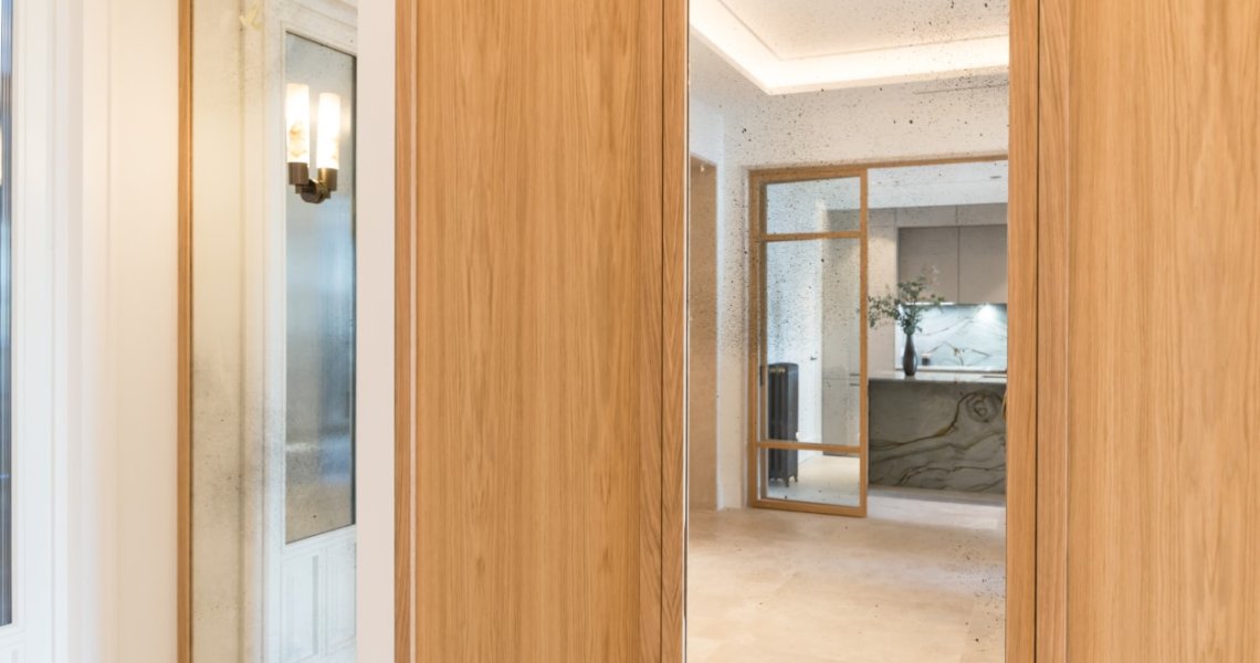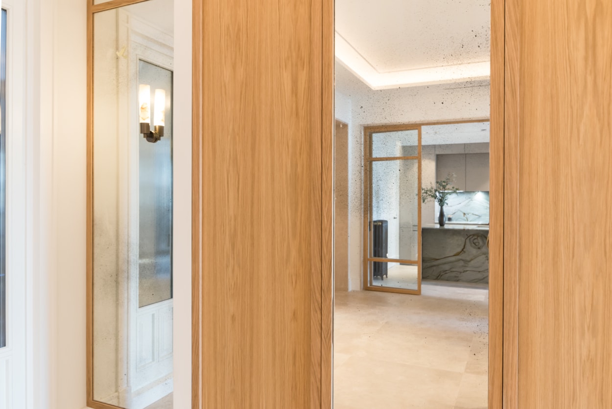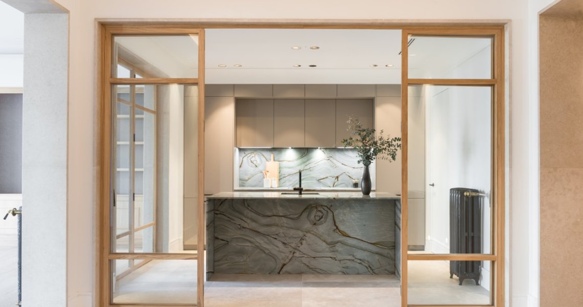 Esta cocina es semi abierta al salón, cuenta con unas grandes puertas en cristal y madera plegables, pudiendo dejar la cocina abierta o cerrada según la ocasión.