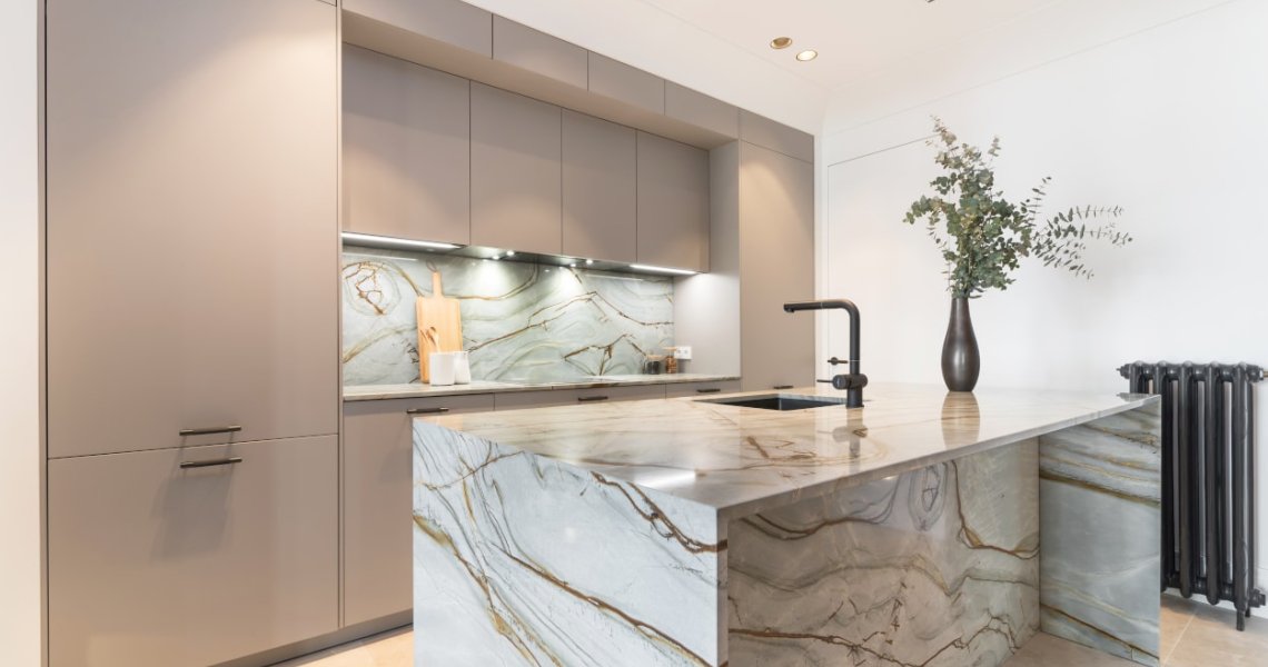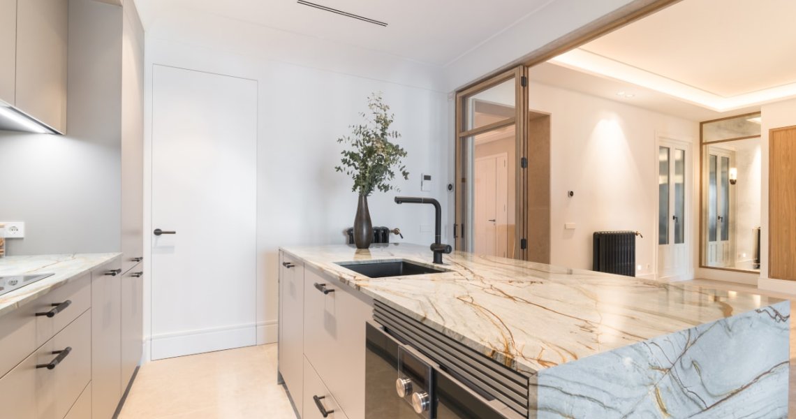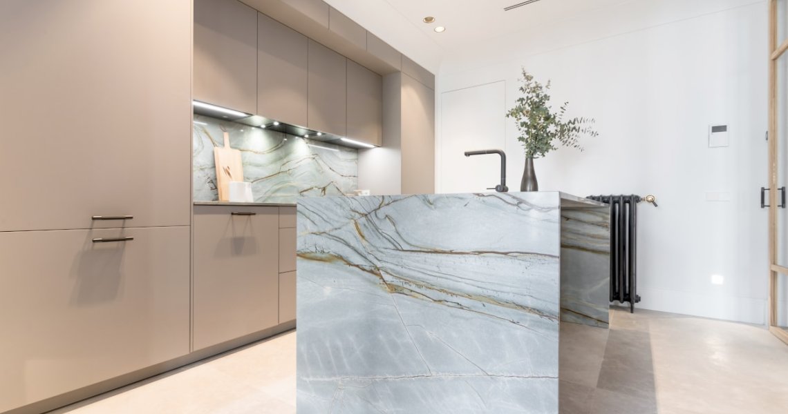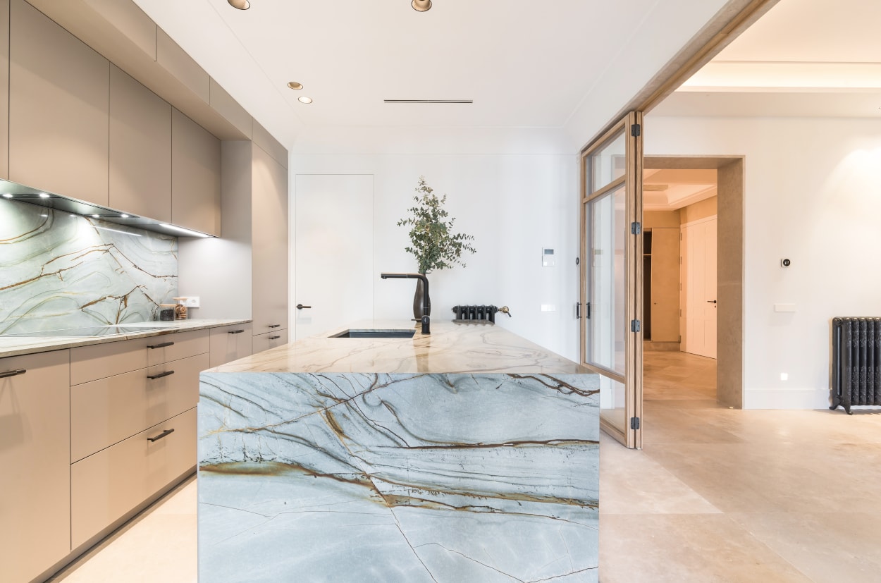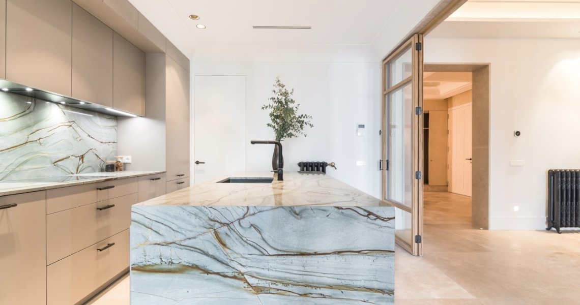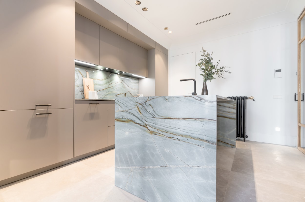 Cocina Santos en color Gris arena con material Laca seda mate y encimera de Rarestone, color Blue roma, acabado pulido.