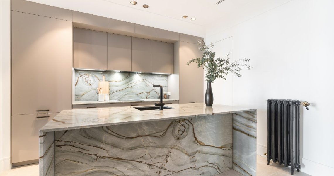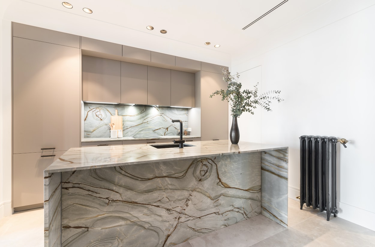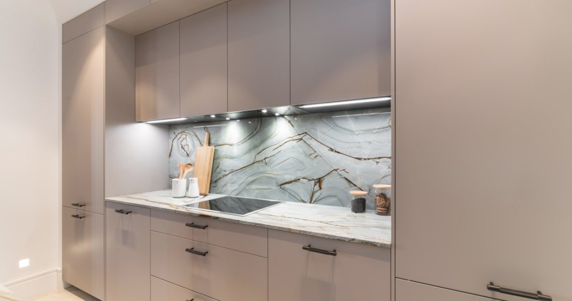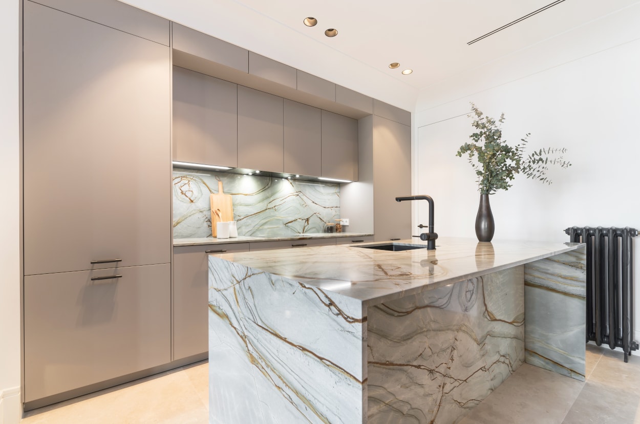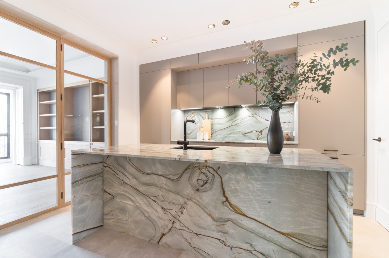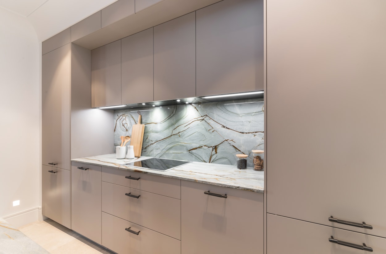 Cocina Santos en color Gris arena con material Laca seda mate y encimera de Rarestone, color Blue roma, acabado pulido.