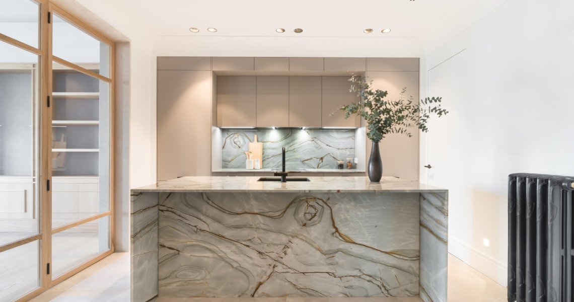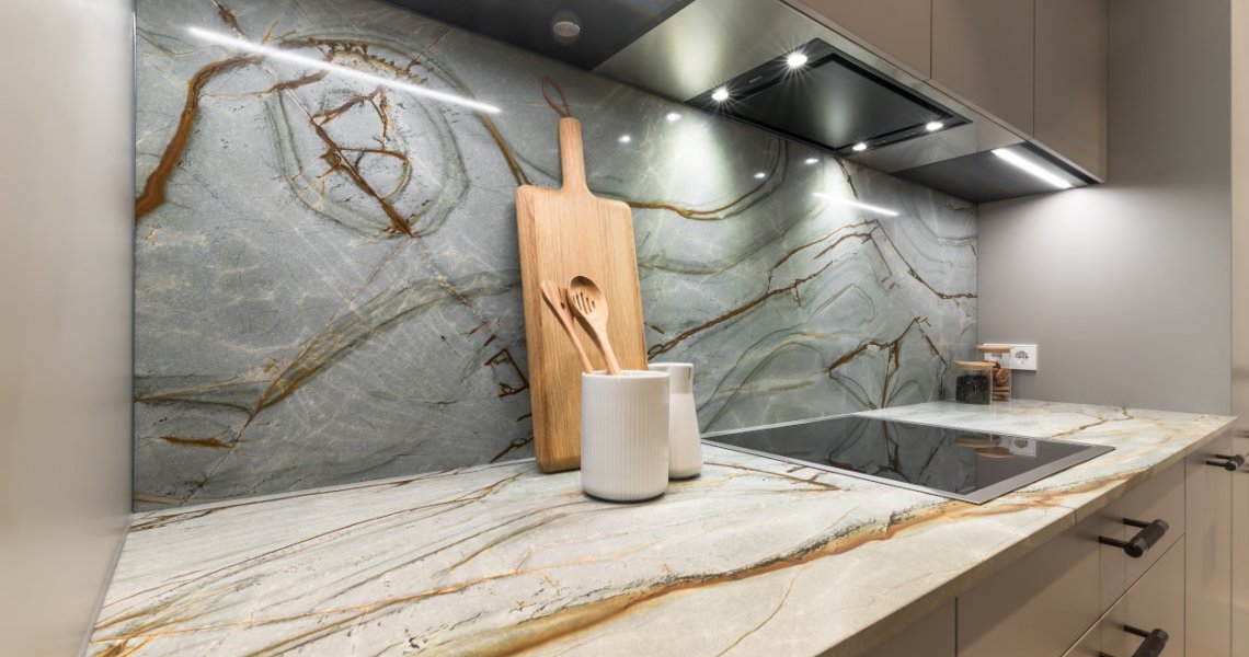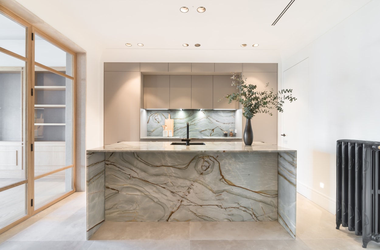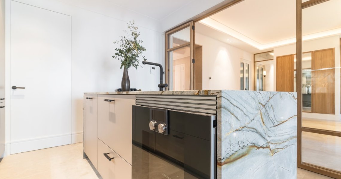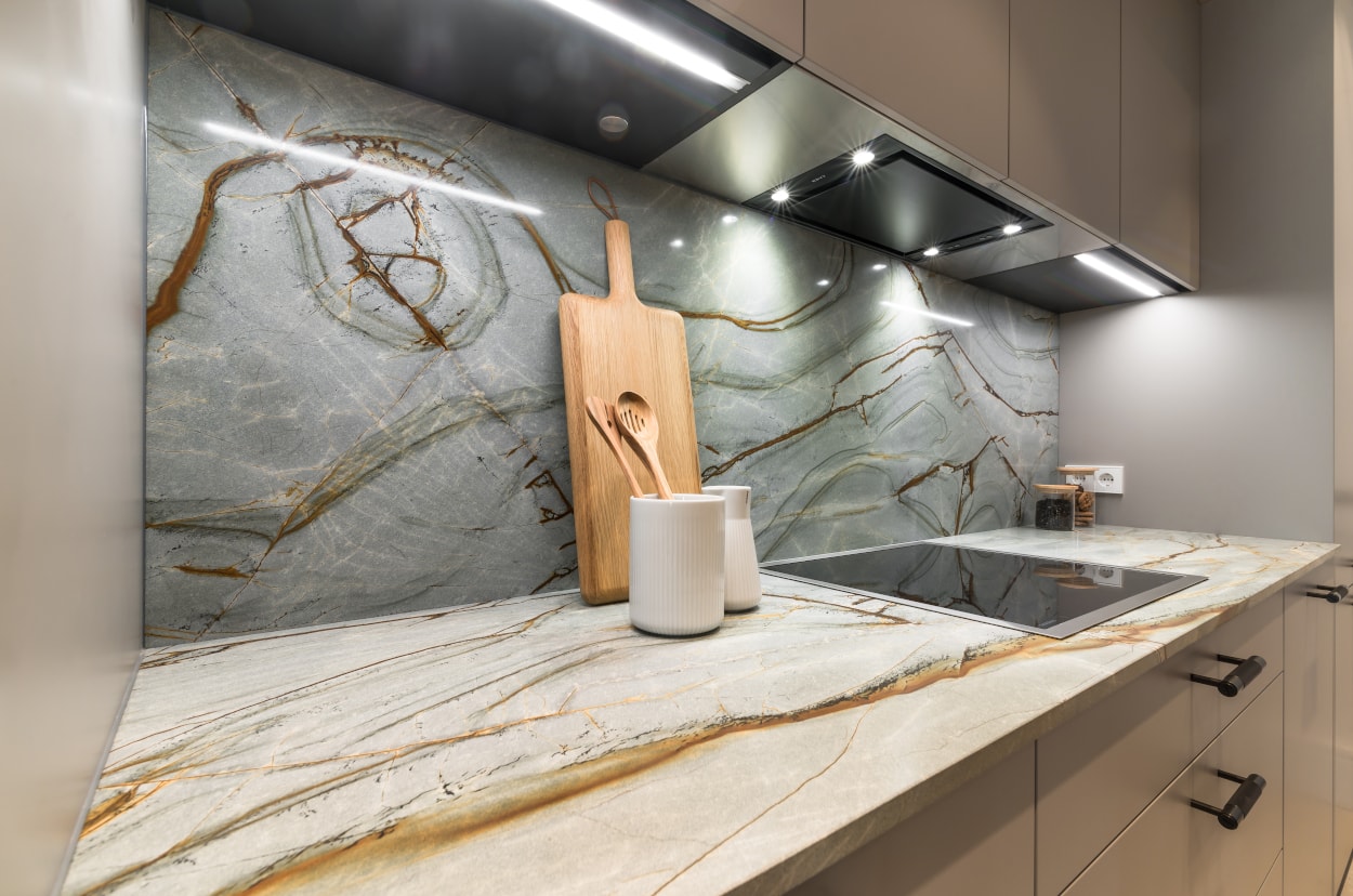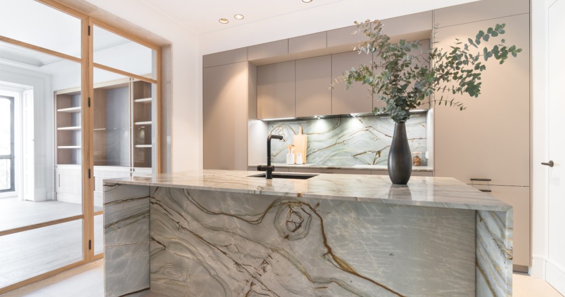 Cocina Santos en color Gris arena con material Laca seda mate y encimera de Rarestone, color Blue roma, acabado pulido.