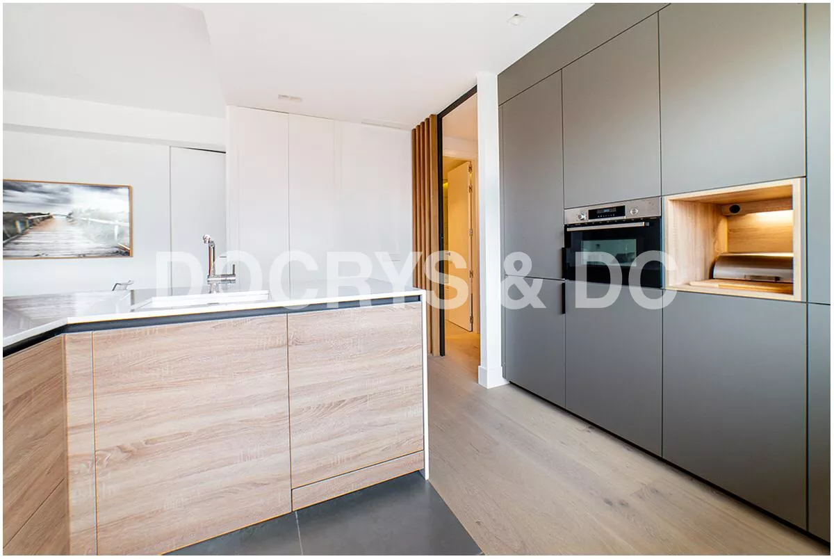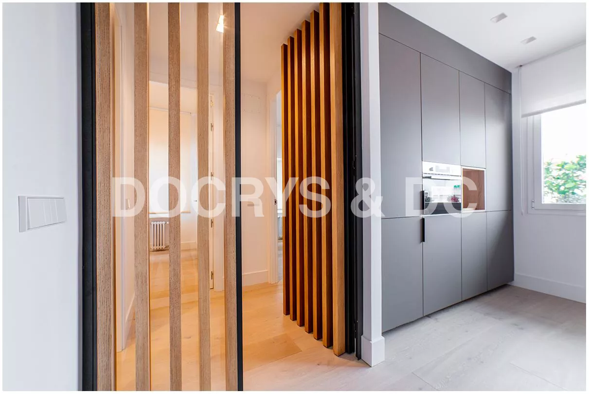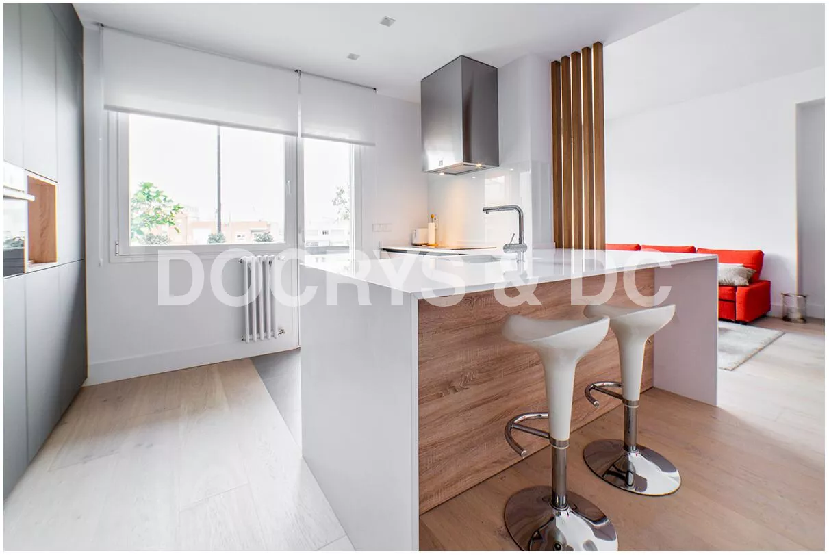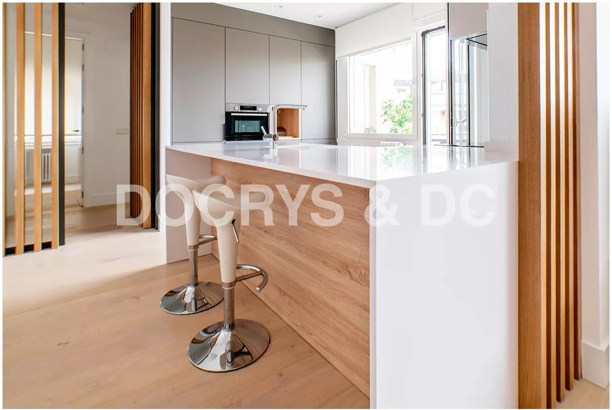 El ala blanca en L aporta un toque singular a esta estancia en la que se combina el blanco y la madera jugando con los remates de las puertas y el suelo. El ala abierta al salón aporta una doble utilidad al poderse utilizar como barra para desayunar.