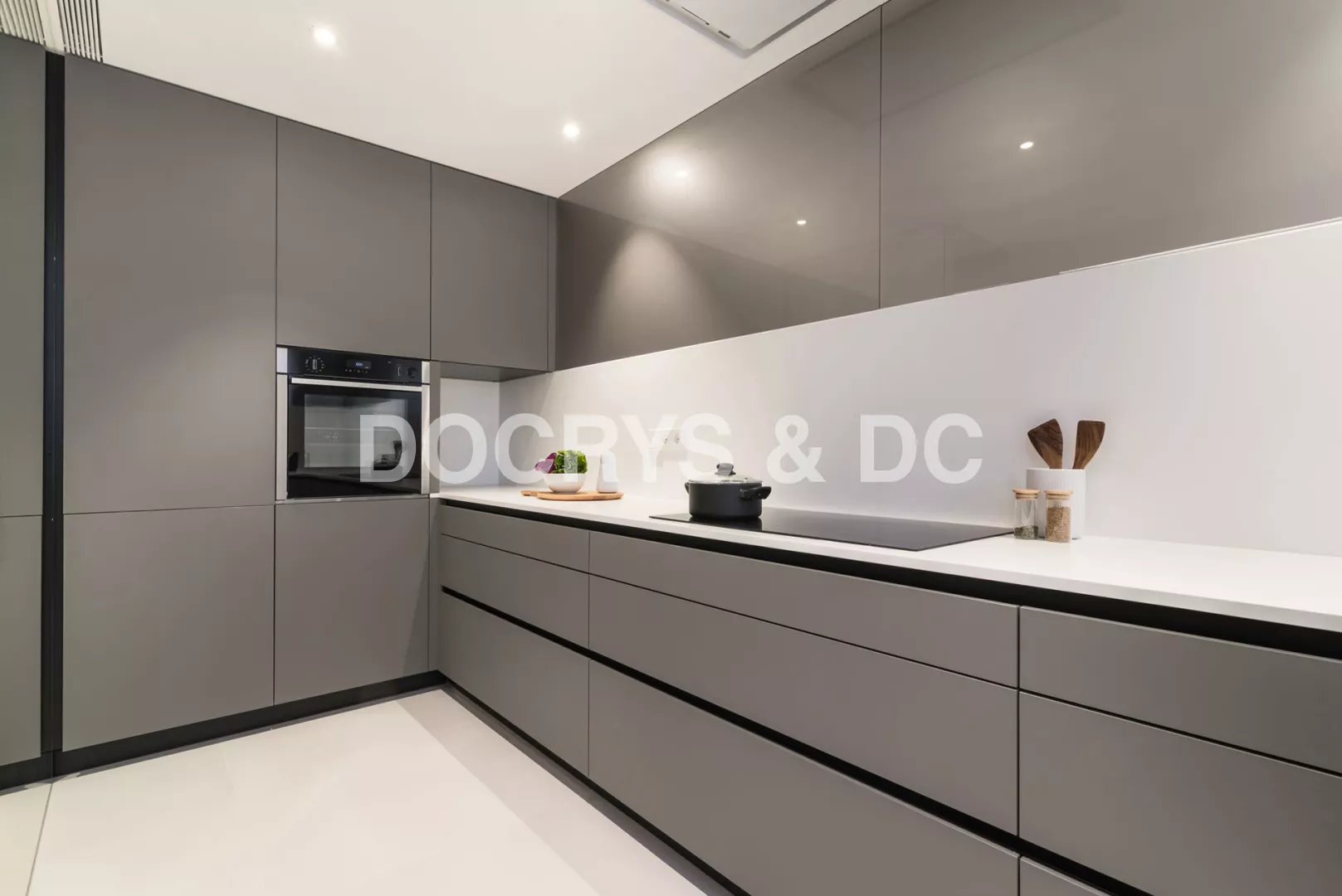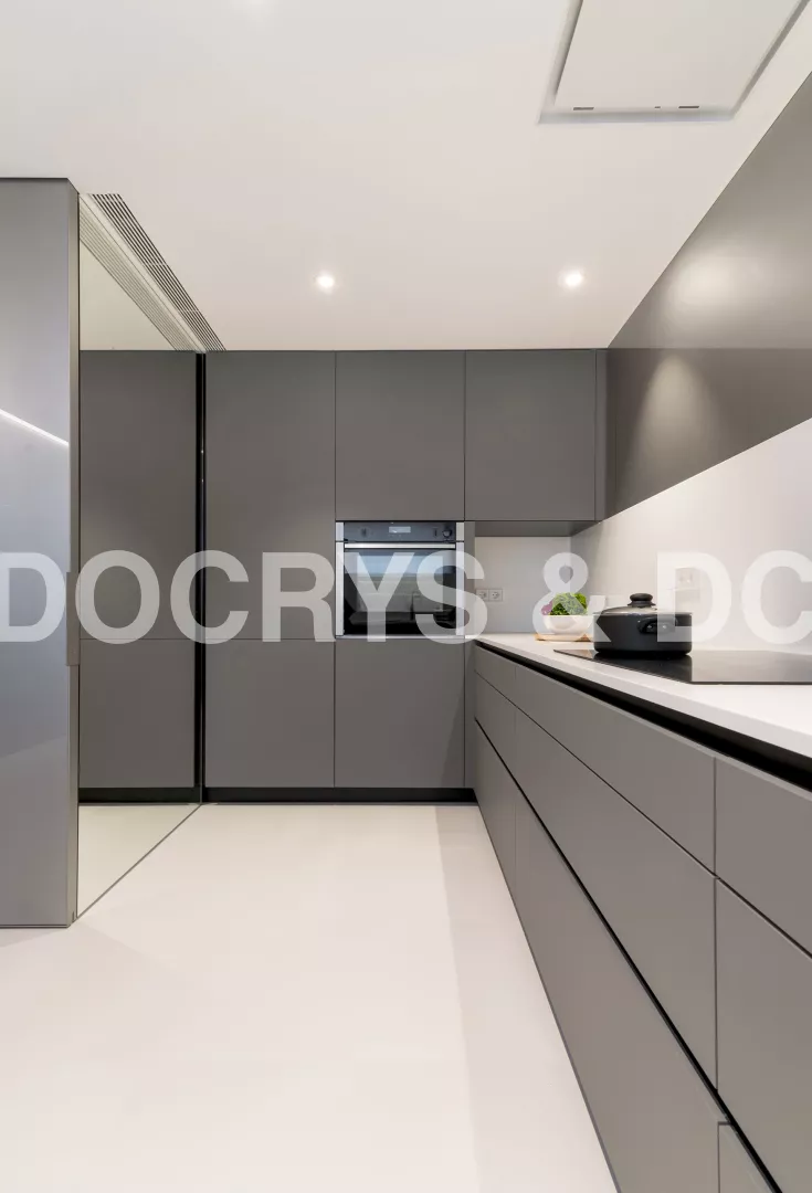 Cocina Santos en color Gris antracita seda con material estratificado y encimera de Lapitec en color Bianco assoluto, acabado satin.