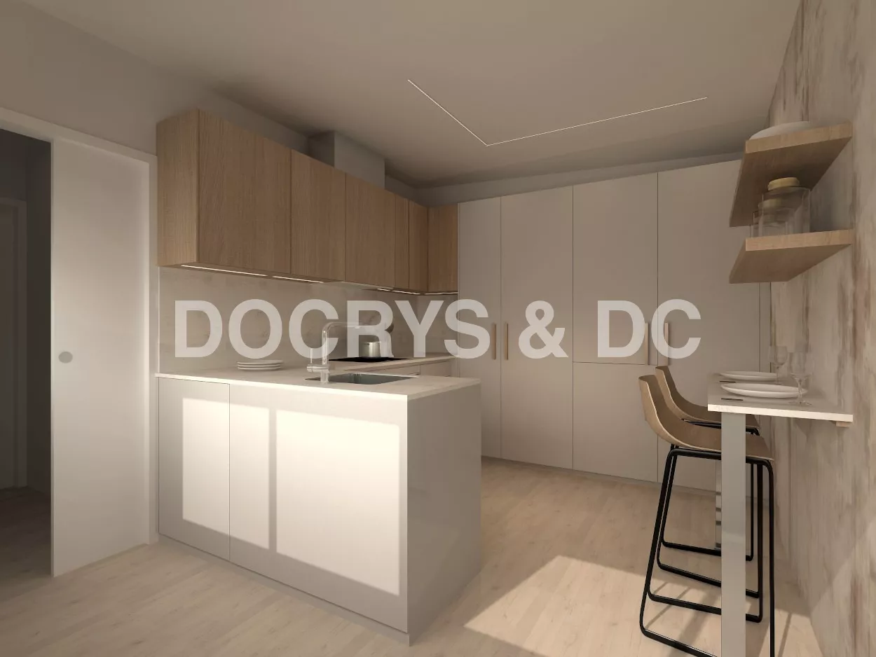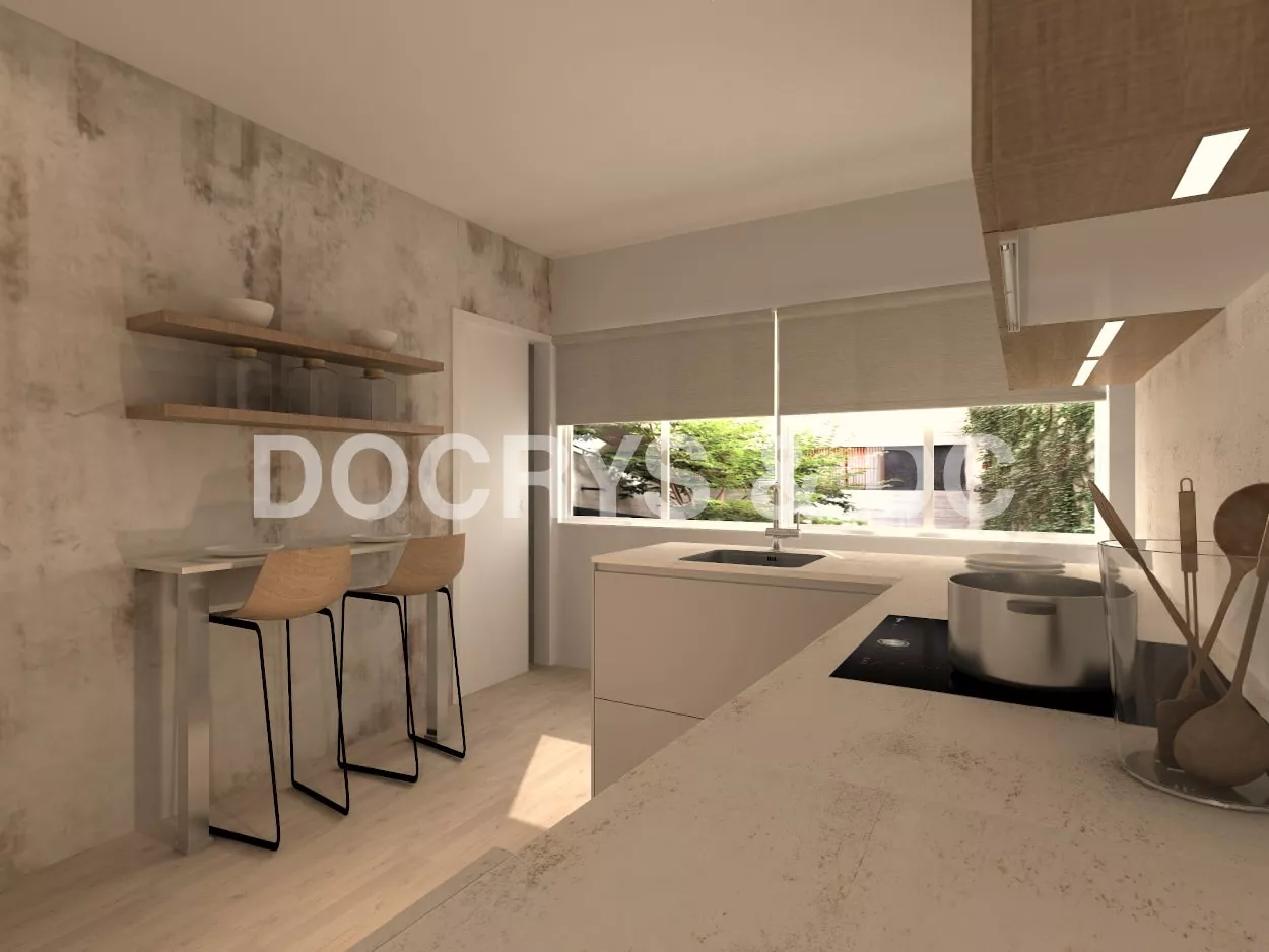 La distribución de esta cocina moderna es en forma de U con muebles bajos, muebles altos y columnas.
