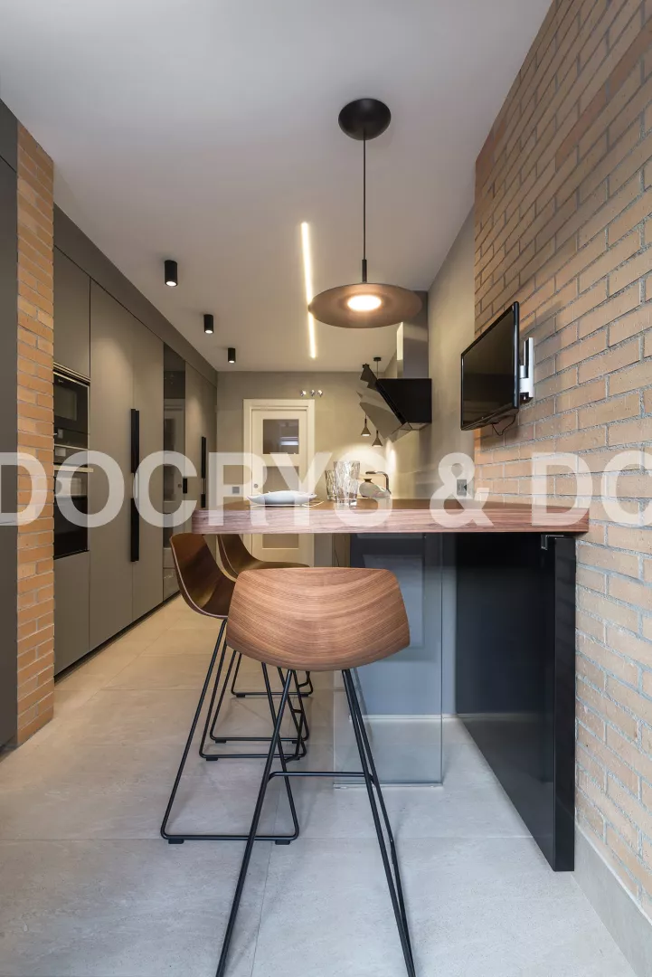 En esta cocina se ha aprovechado el espacio al máximo sin mermar el movimiento entre los diferentes elementos de la cocina. Diseñada en línea con dos frentes, esta cocina utiliza todo el espacio disponible desde el suelo hasta el techo. Junto al acceso al jardín se ha instalado un rincón con una mesa-barra de madera de nogal de ONNEA con pié de cristal y taburetes altos de La Palma que permiten disfrutar de un espacio luminoso para comer. Una televisión en la pared termina de completar este diseño de cocina moderno rústica.