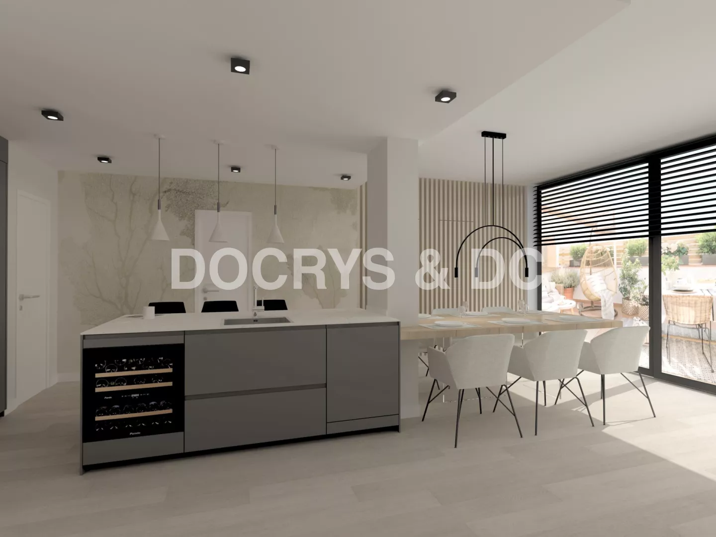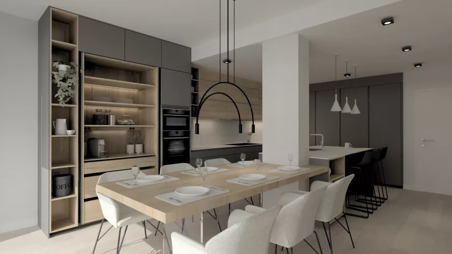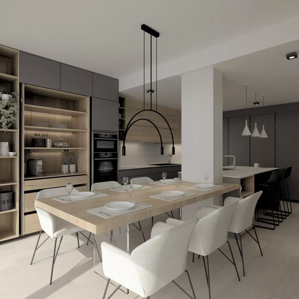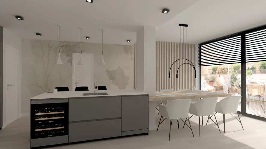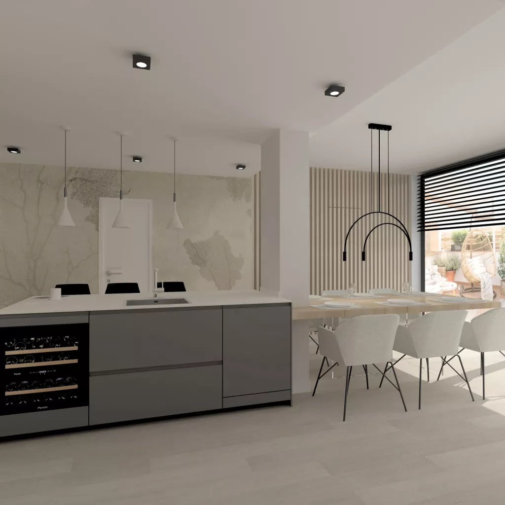 Además, de esta isla, se extiende una mesa baja en tablero marino para seis comensales.
