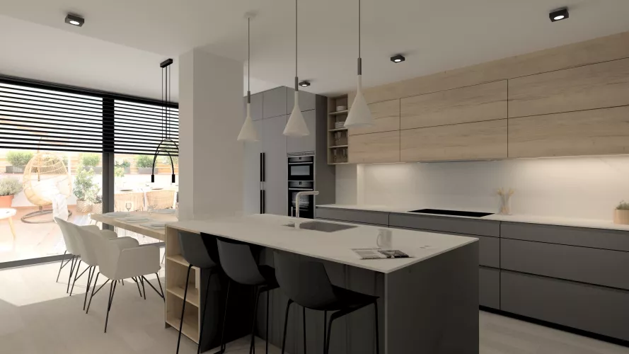 Cocina Santos Gris Visón con Isla y Encimera de Inalco