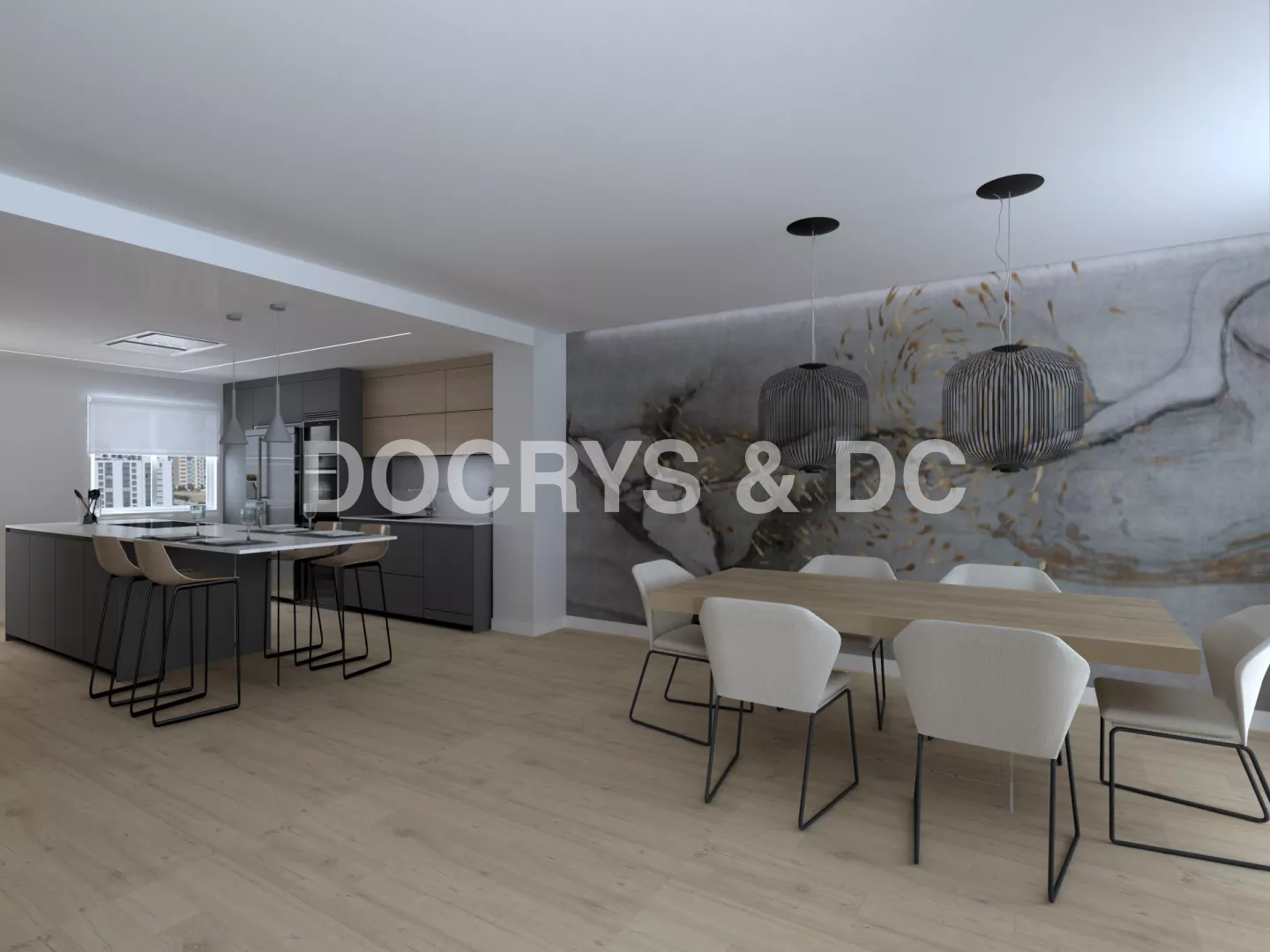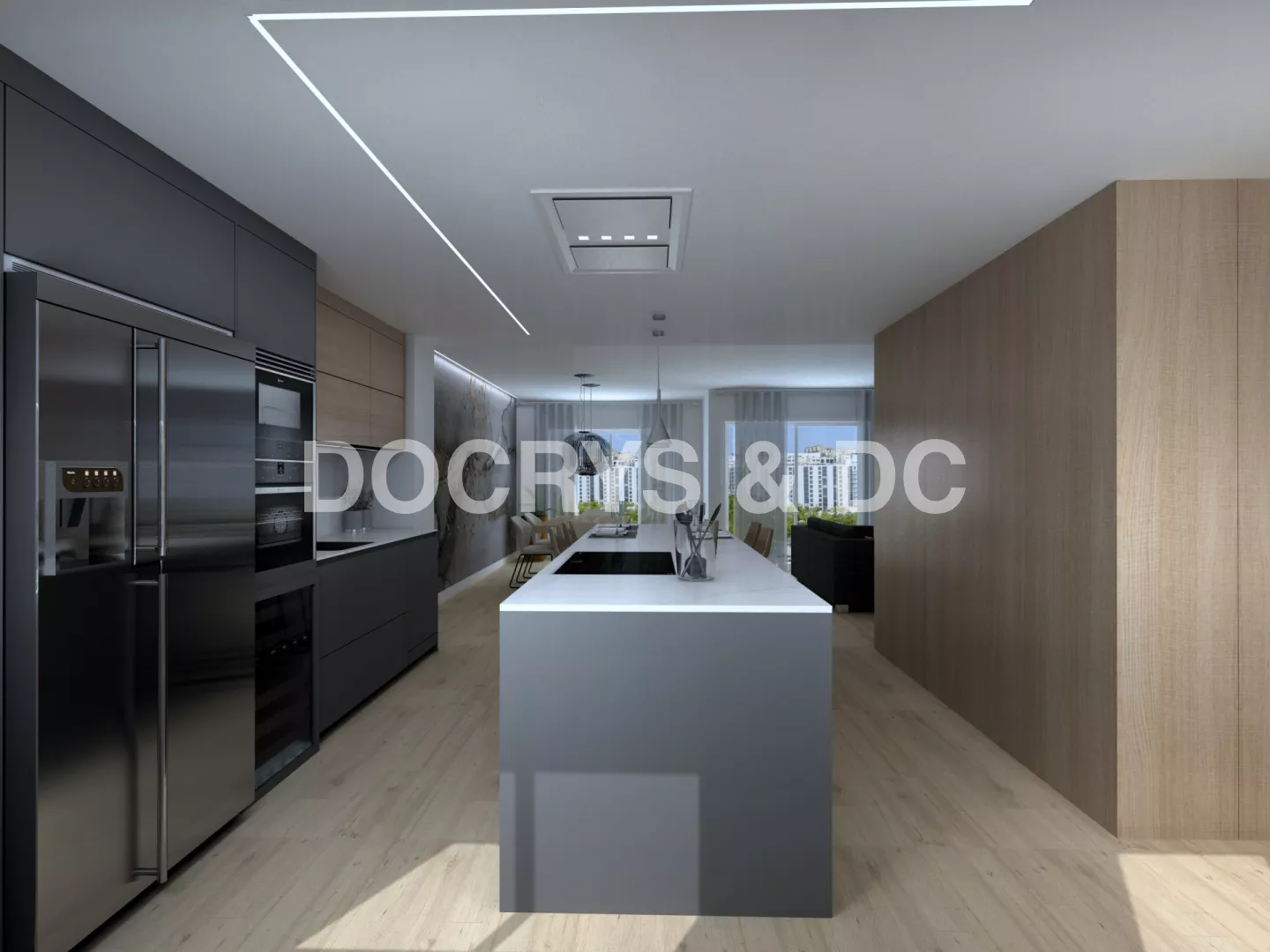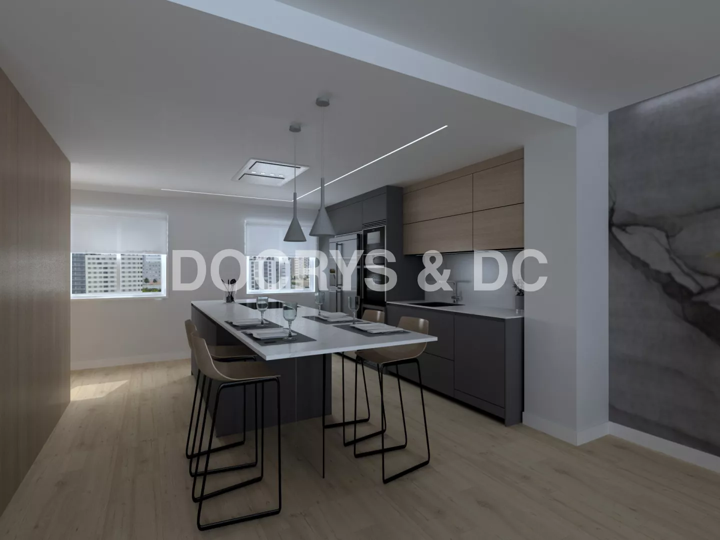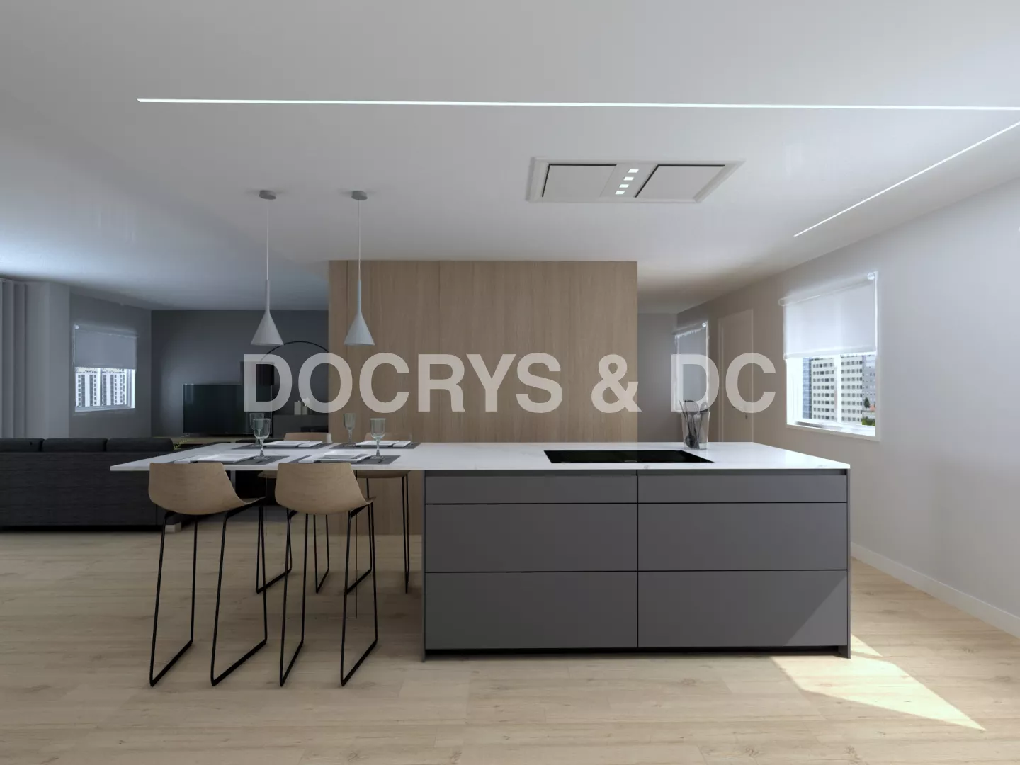Cocina Santos en color Gris Antracita Seda y Roble Kairos en material estratificado. El diseño de esta cocina moderna abierta al salón cuenta con un frente con muebles bajos y altos donde se ubica la zona de aguas, además de varias columnas y el frigorífico y una gran isla central como protagonista de este espacio.