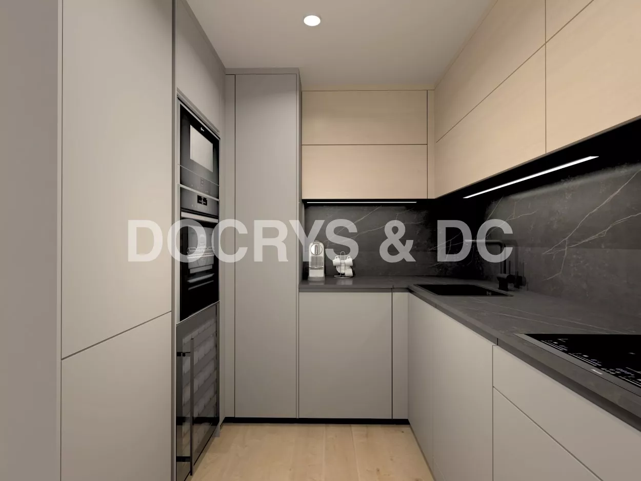 En uno de los frentes se ubica la zona de aguas y la zona de cocción y el otro frente está compuesto por varias columnas, donde se ubican los grandes electrodomésticos.