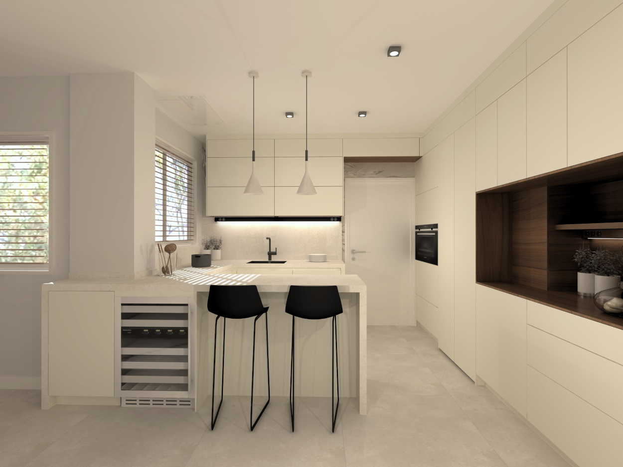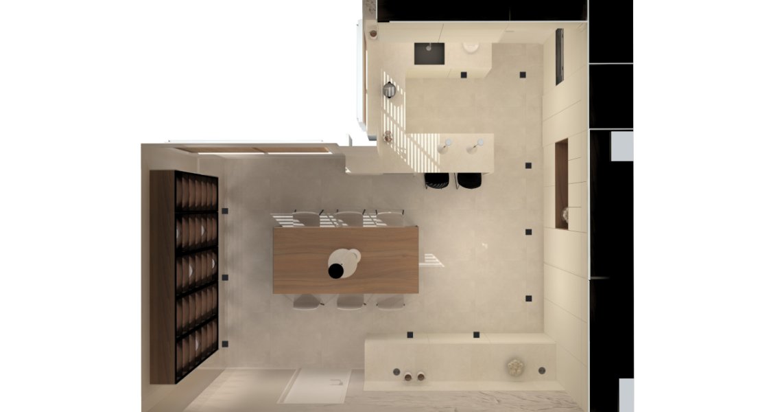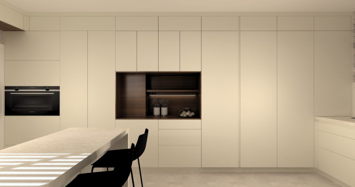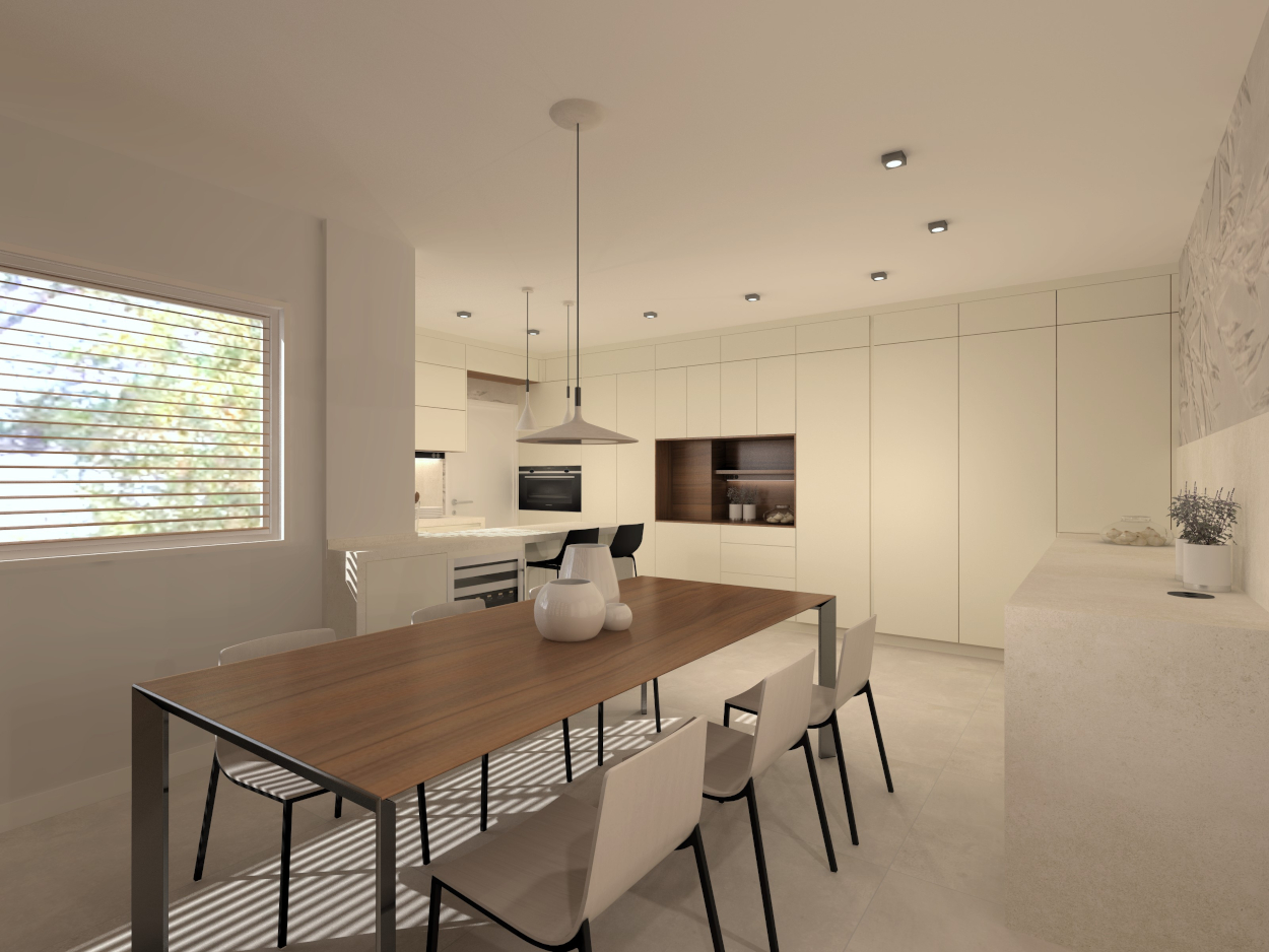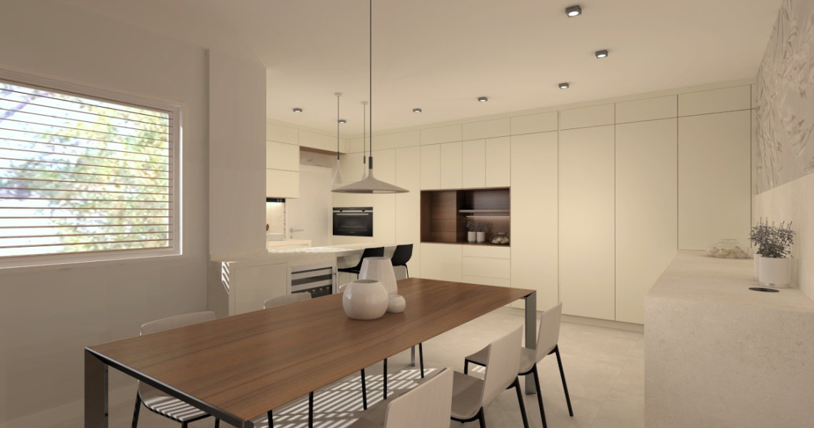 Es una cocina bastante completa ya que comprende también de una zona desayunador, llamado hornacina alineada con las columnas a lo largo de toda la pared.