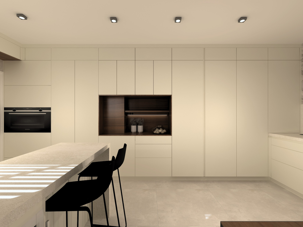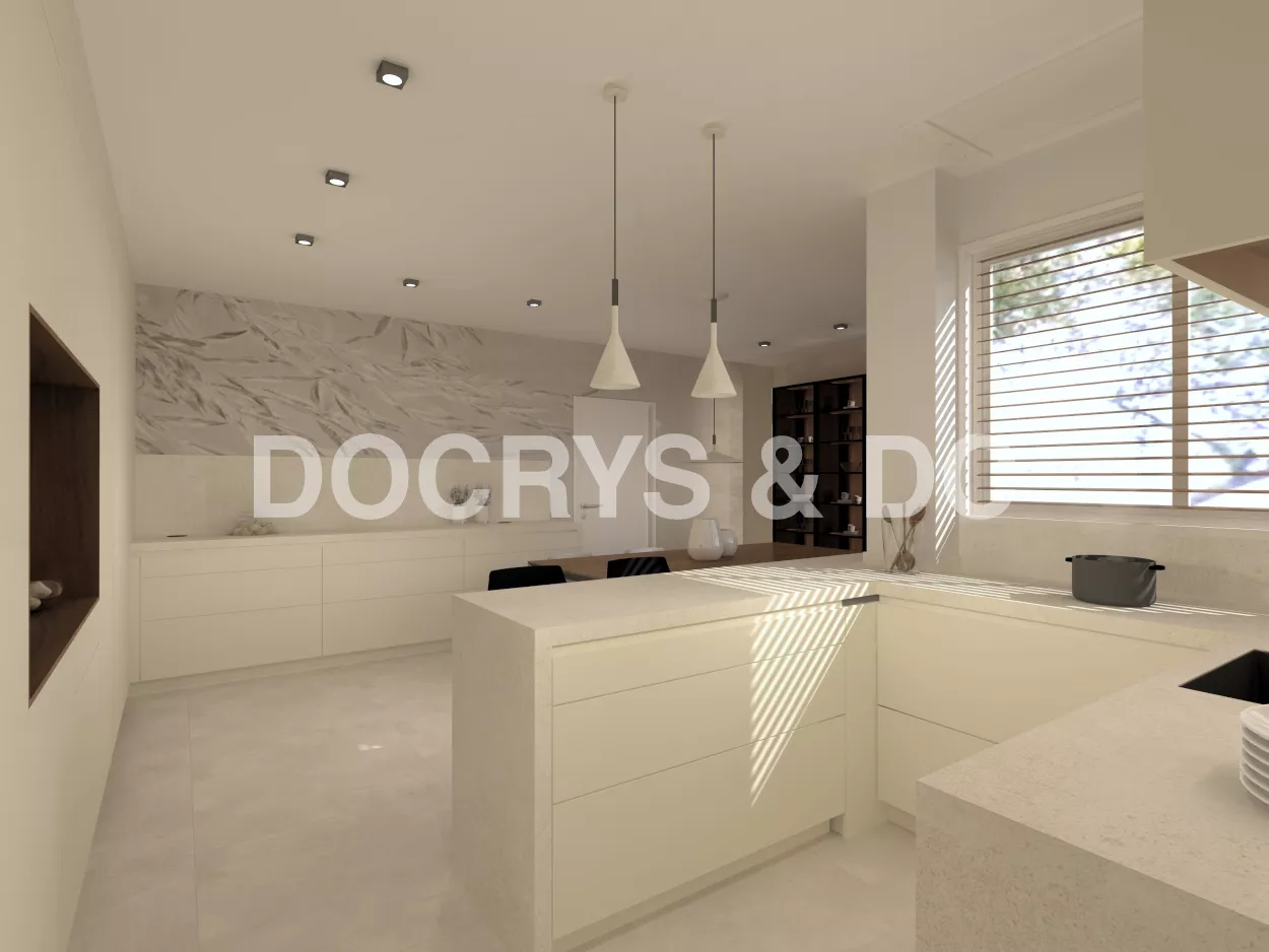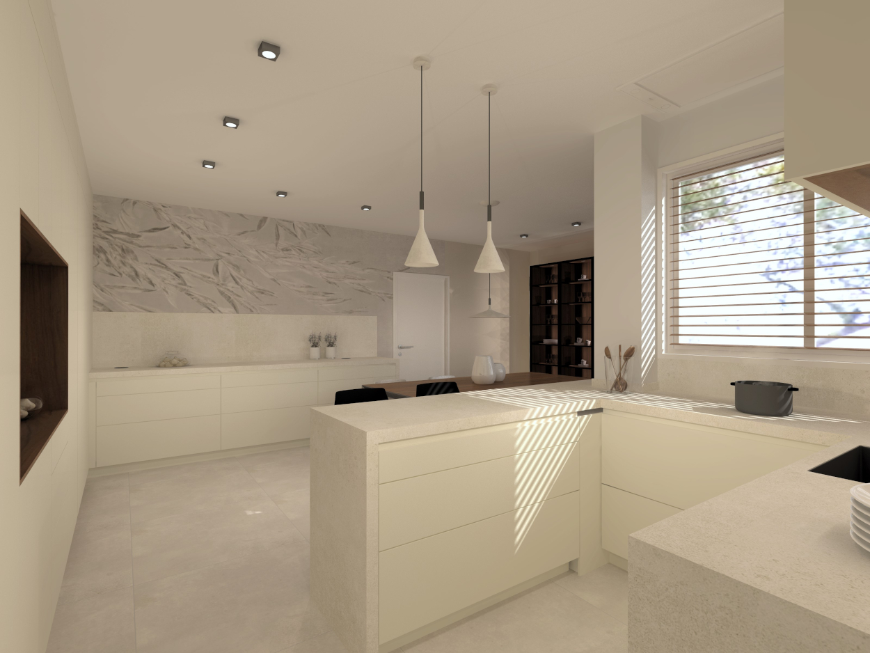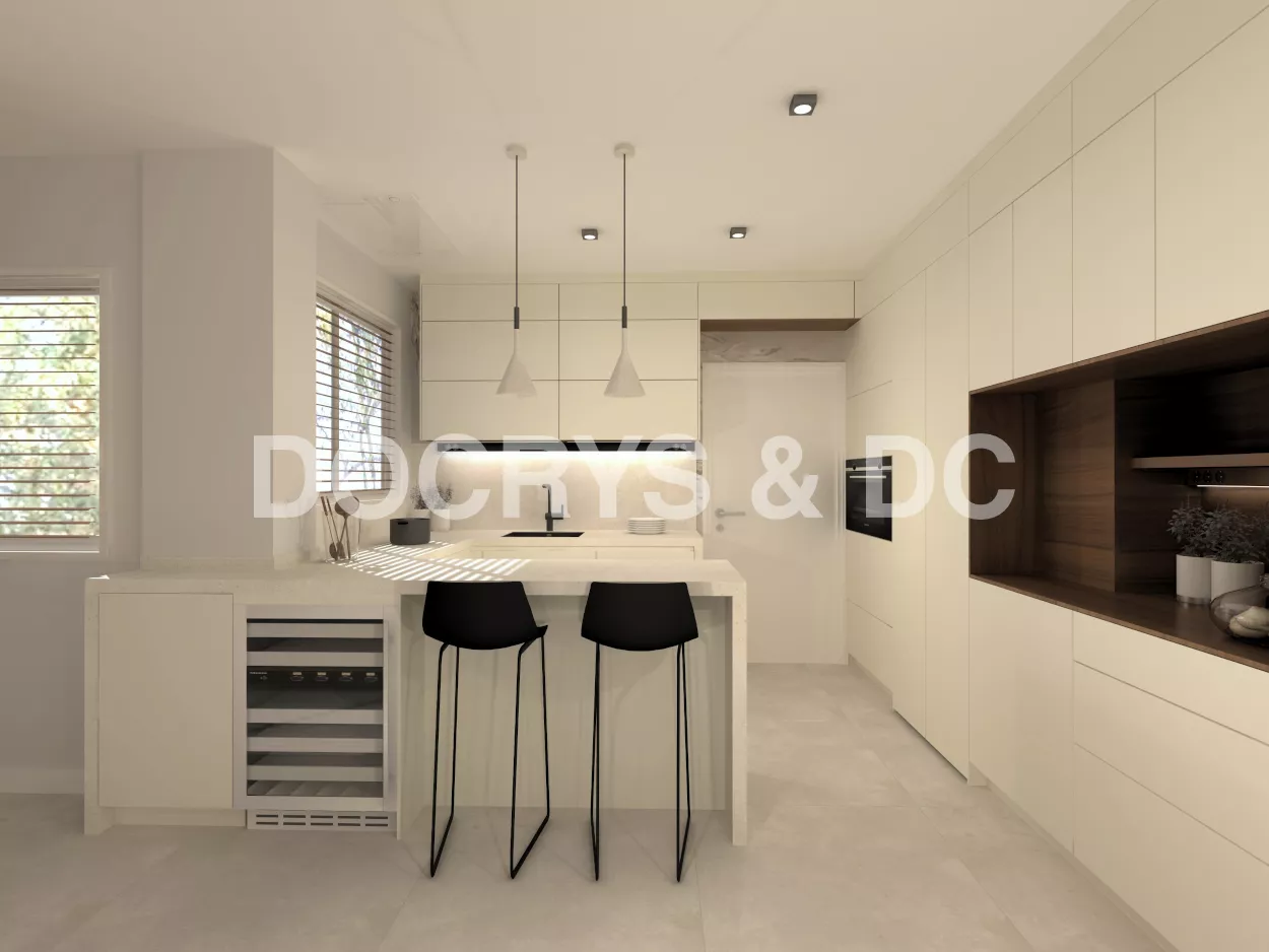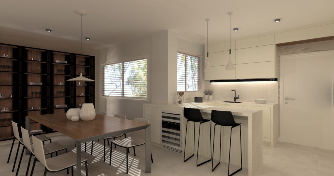 Es una cocina bastante completa ya que comprende también de una zona desayunador, llamado hornacina alineada con las columnas a lo largo de toda la pared.