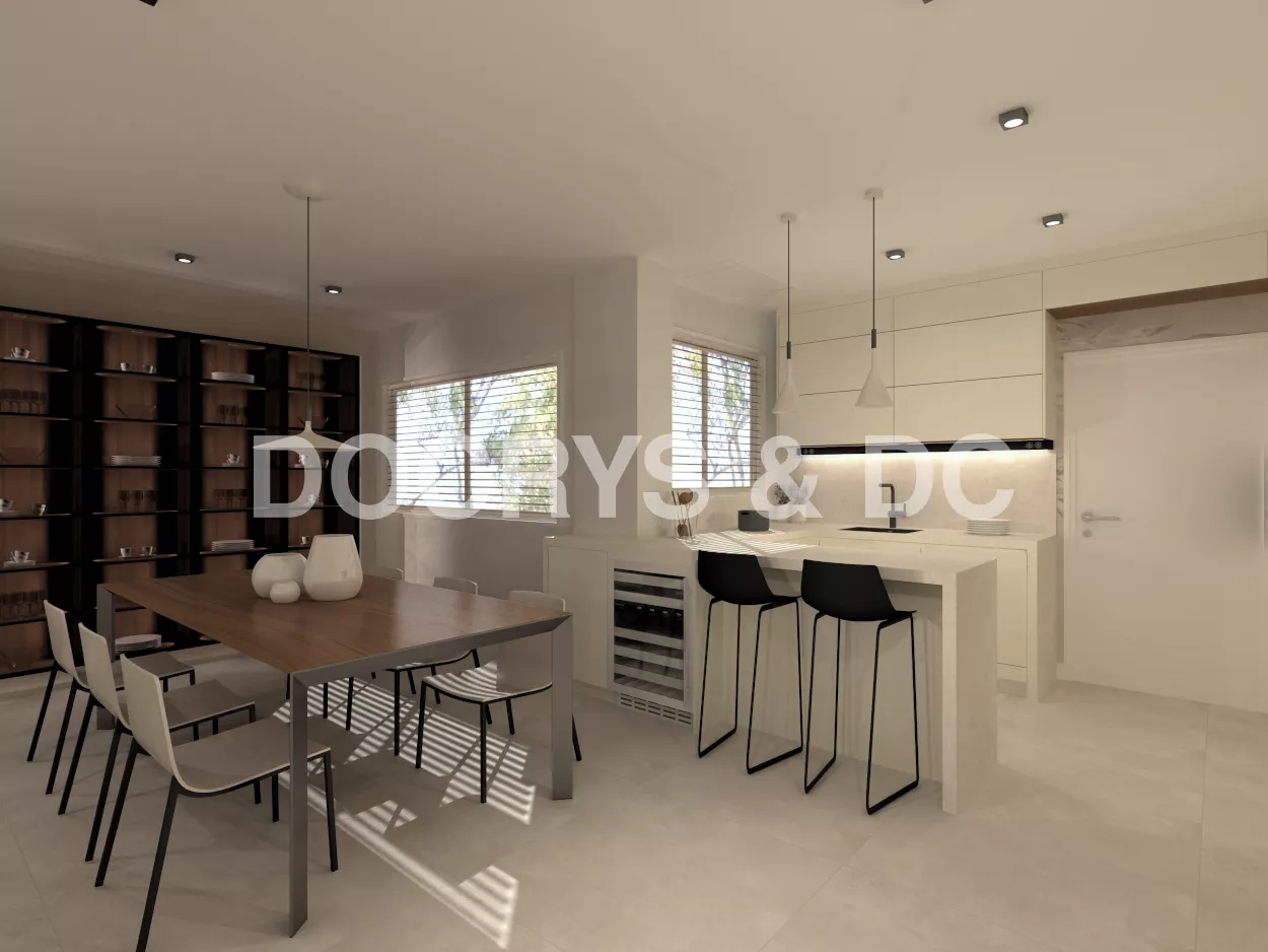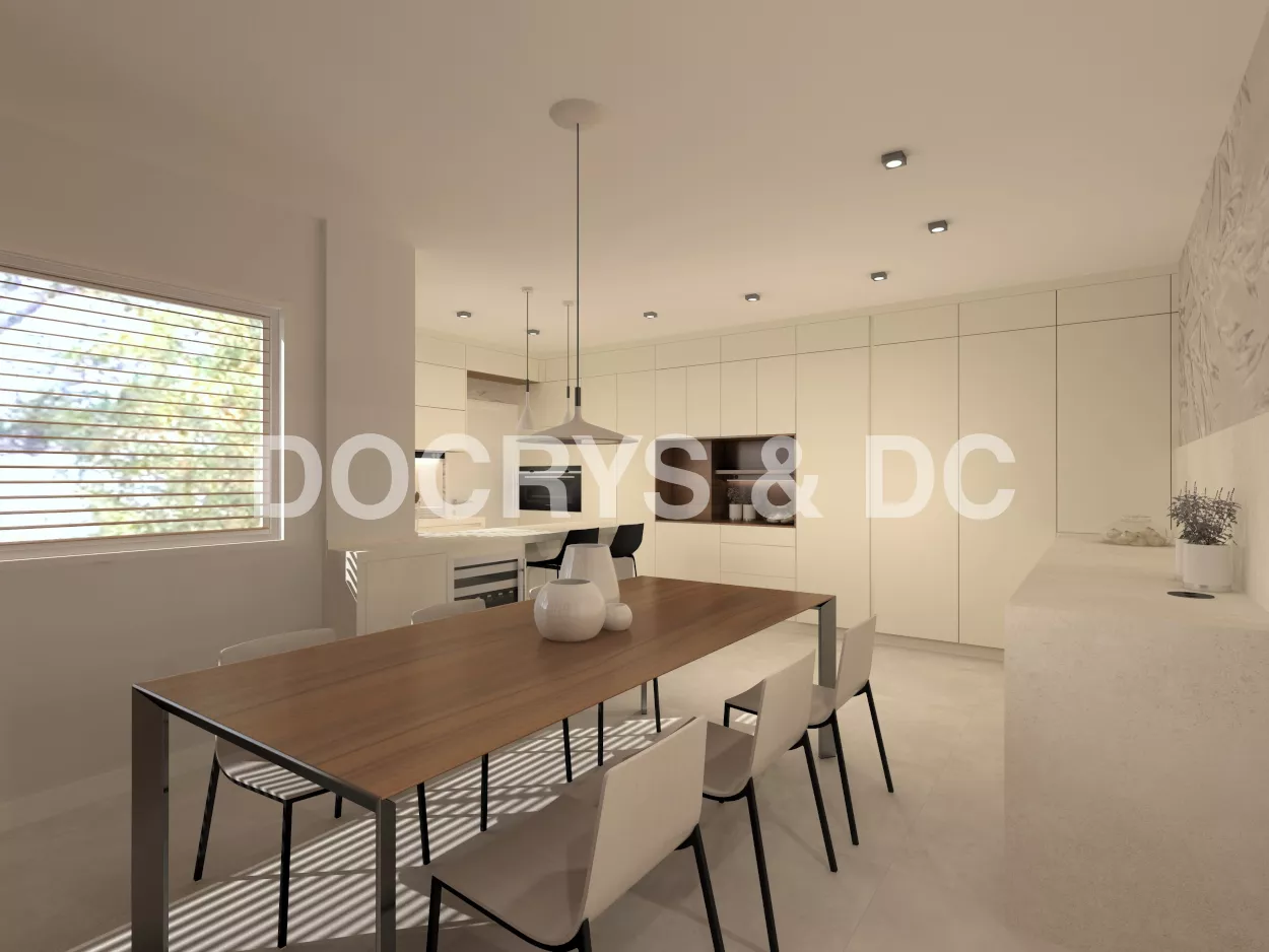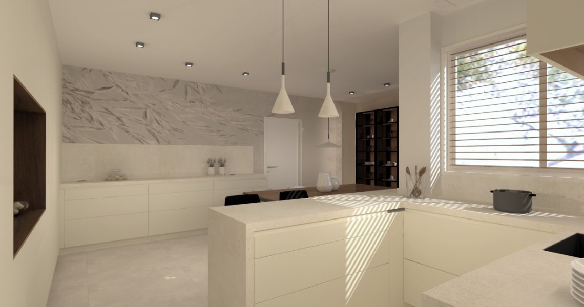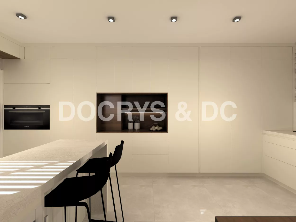 Es una cocina bastante completa ya que comprende también de una zona desayunador, llamado hornacina alineada con las columnas a lo largo de toda la pared.