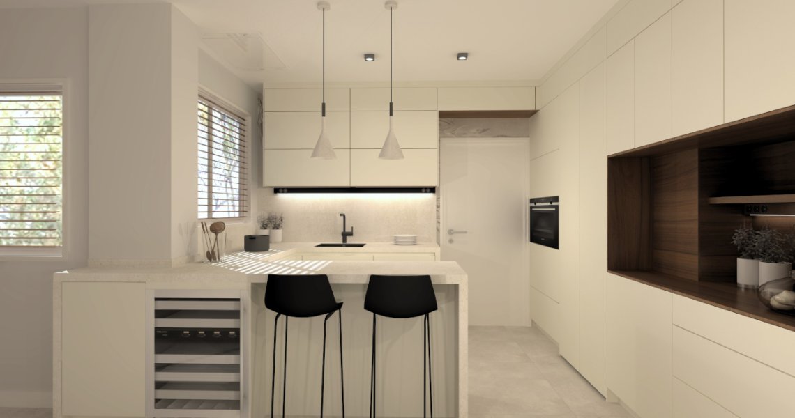 Cocina Santos en color claro, con encimera en un mismo tono claro, aportando bastante luminosidad al espacio, está compuesta por muebles bajos, formando una U junto con la zona alta donde se encuentra el fregadero.