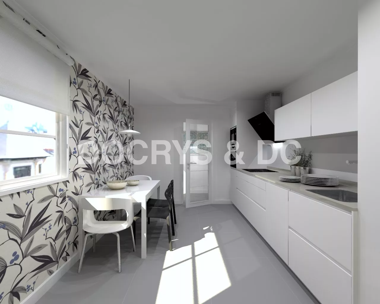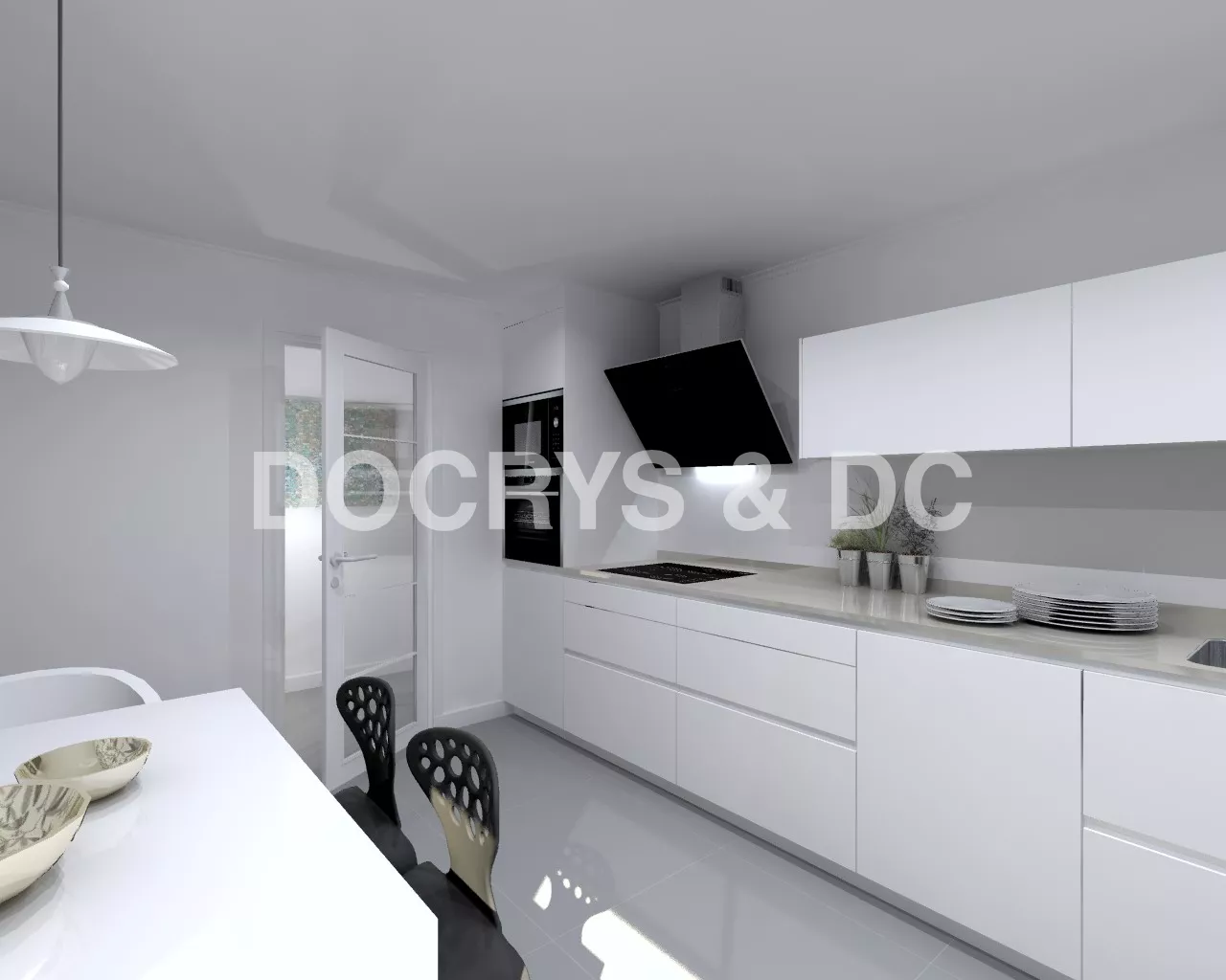 Es fundamental en las cocinas blancas añadir acentos de color para que el espacio no se sature. En esta se ha utilizado concretamente el color Blanco Innsbruk a través del modelo Line Estratificado de Santos. Para su encimera se ha aplicado un Silestone Royal Reef, un tono arena cuya claridad se ve alterada por las tonalidades oscuras que proyectan los electrodomésticos y especialmente el papel pintado. Al fondo se dispone de una serie de columnas destinadas a la organización y al almacenaje. Por último, cuenta con una pequeña mesa comedor, perfectamente iluminada gracias a su gran foco colgante de luz LED.