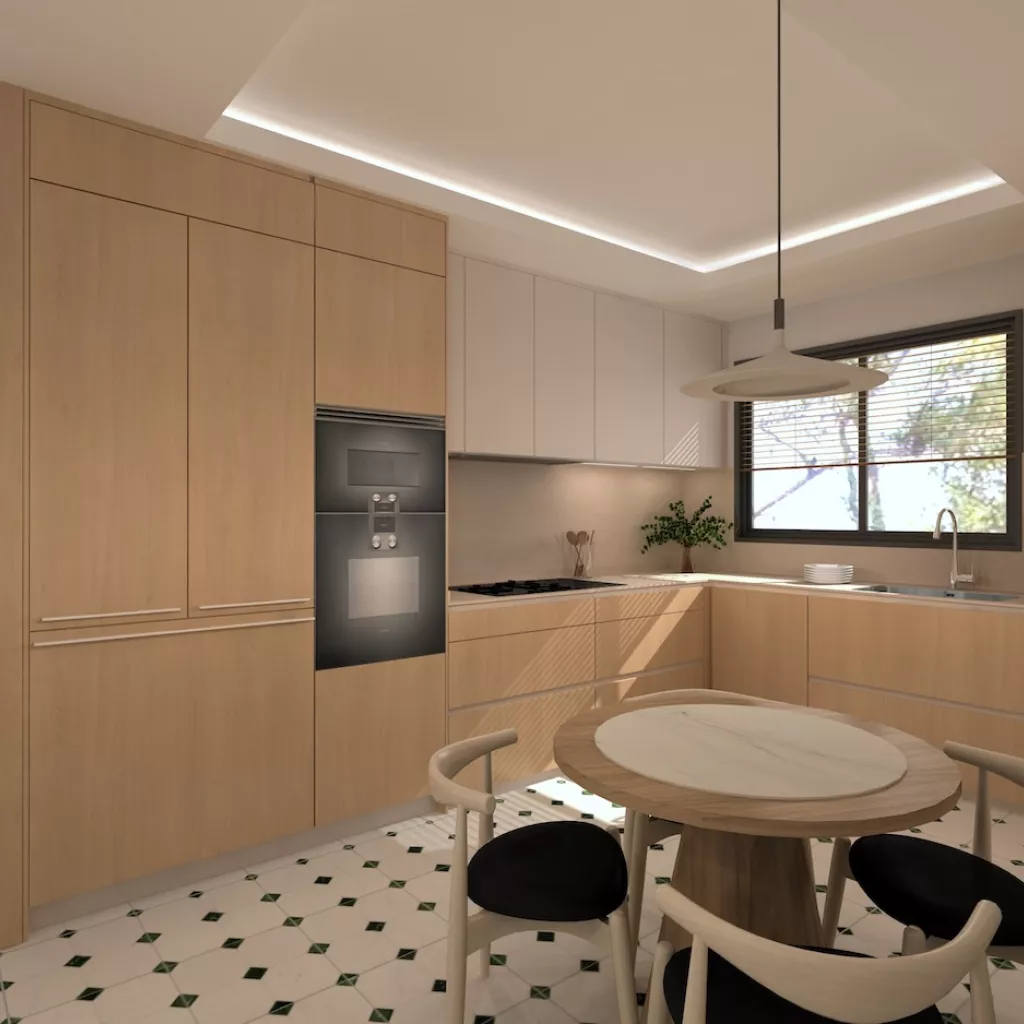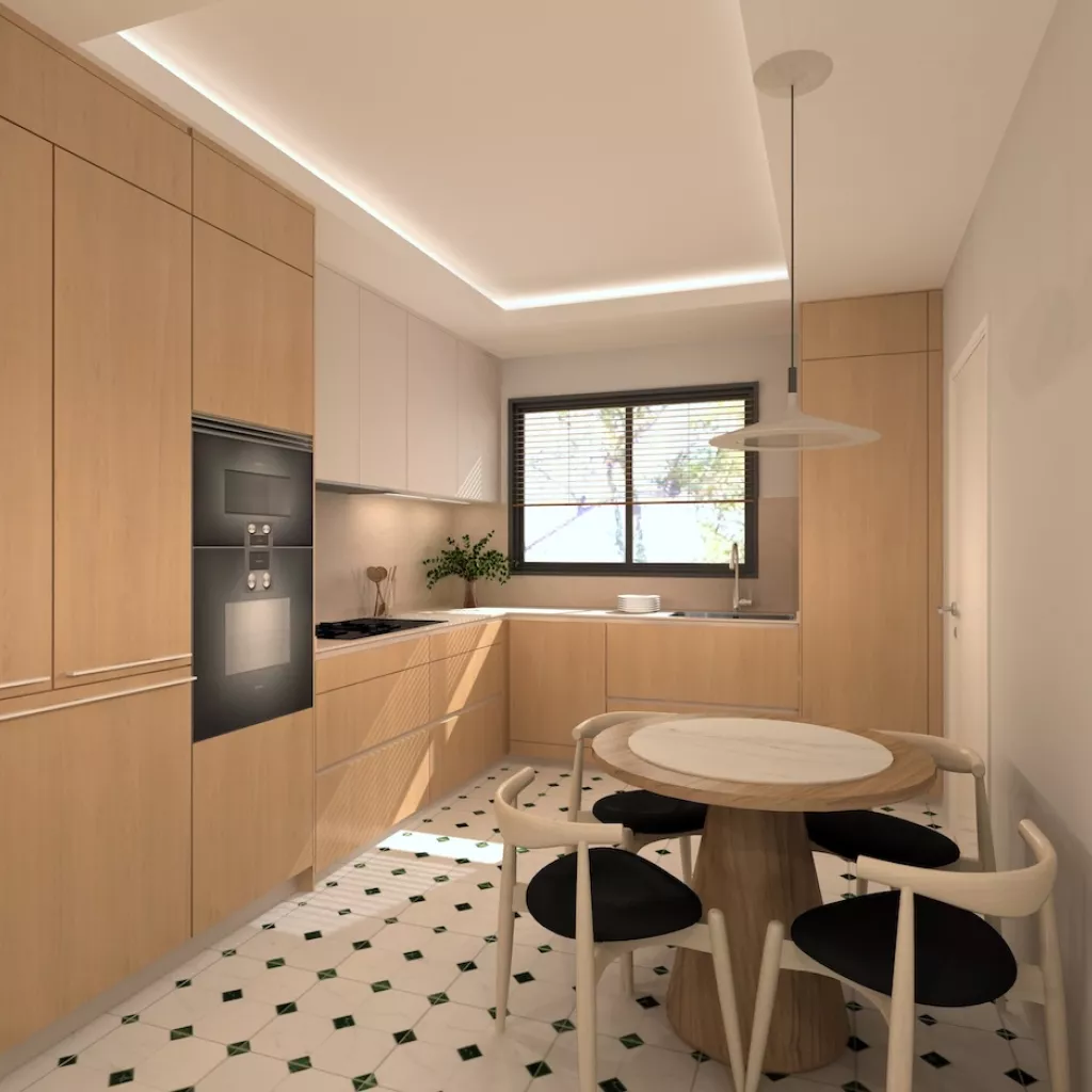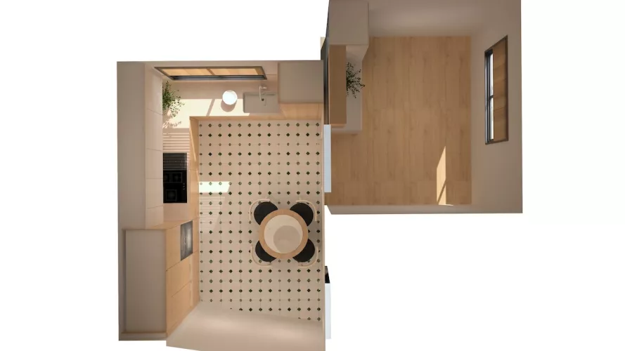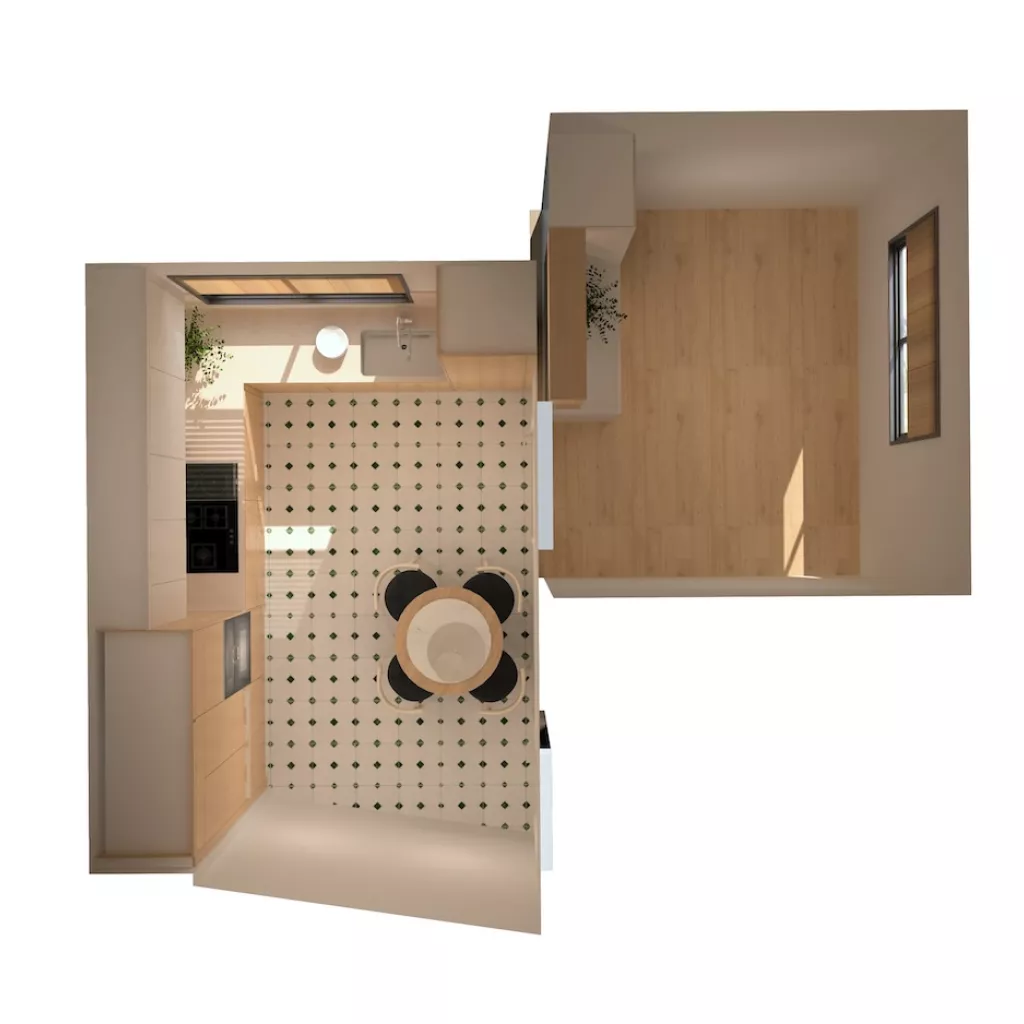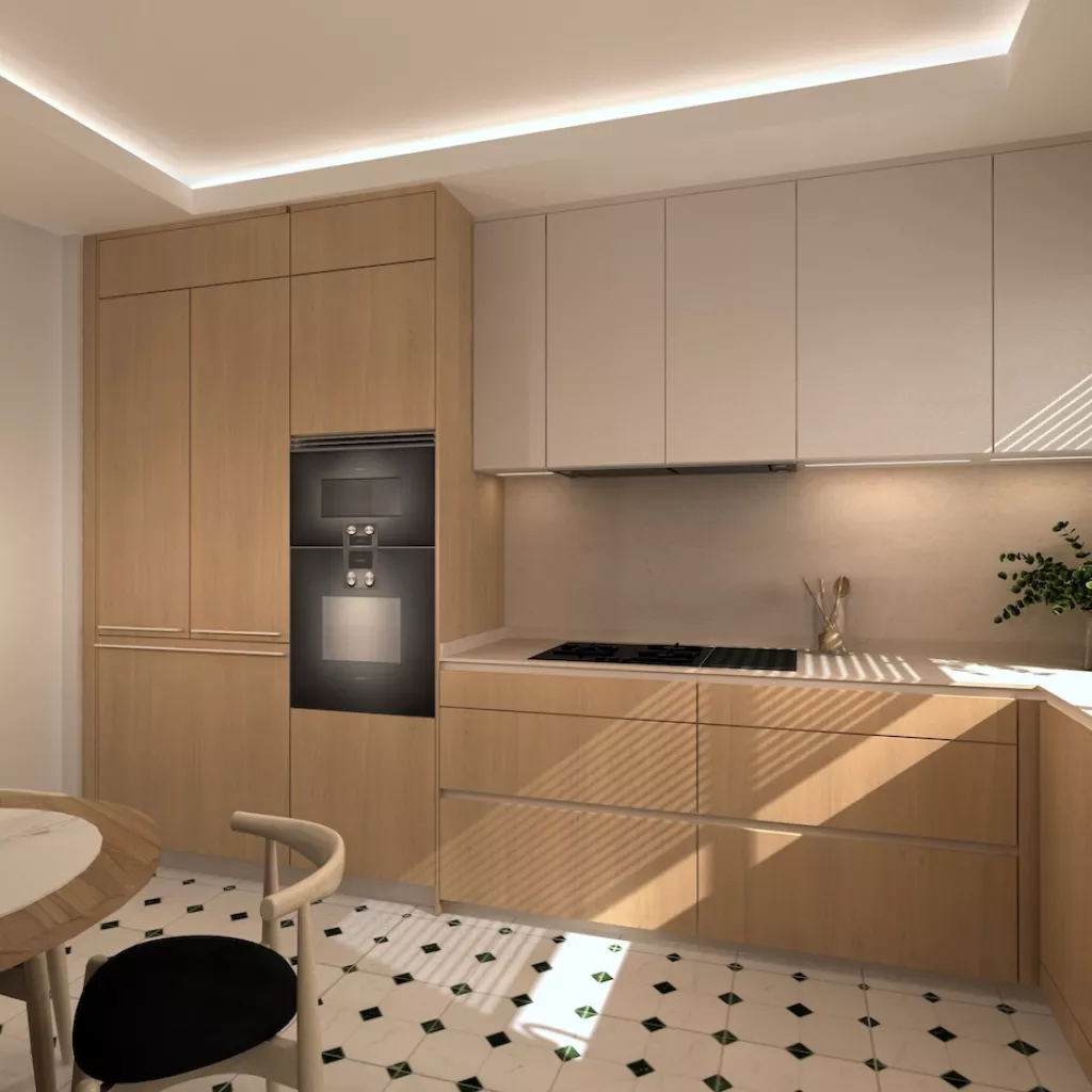 El suelo en porcelánico blanco con detalles geométricos en verde aporta dinamismo y personalidad, sin romper la armonía del conjunto. Cada detalle ha sido cuidadosamente pensado para crear una cocina que no solo cumple con las exigencias de la vida moderna, sino que también transmite bienestar, orden y belleza.