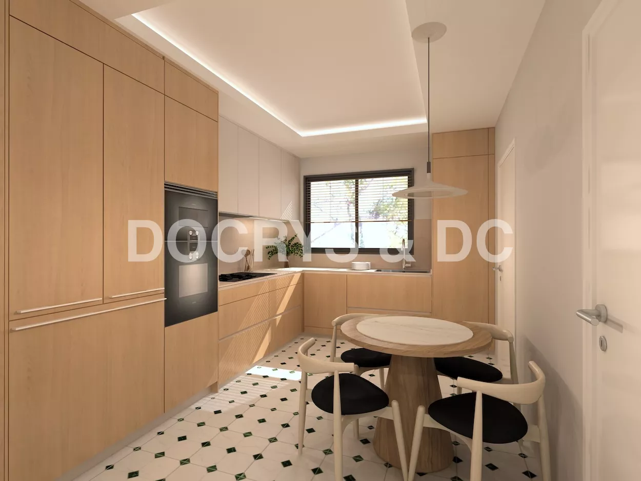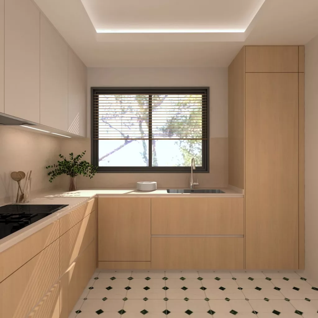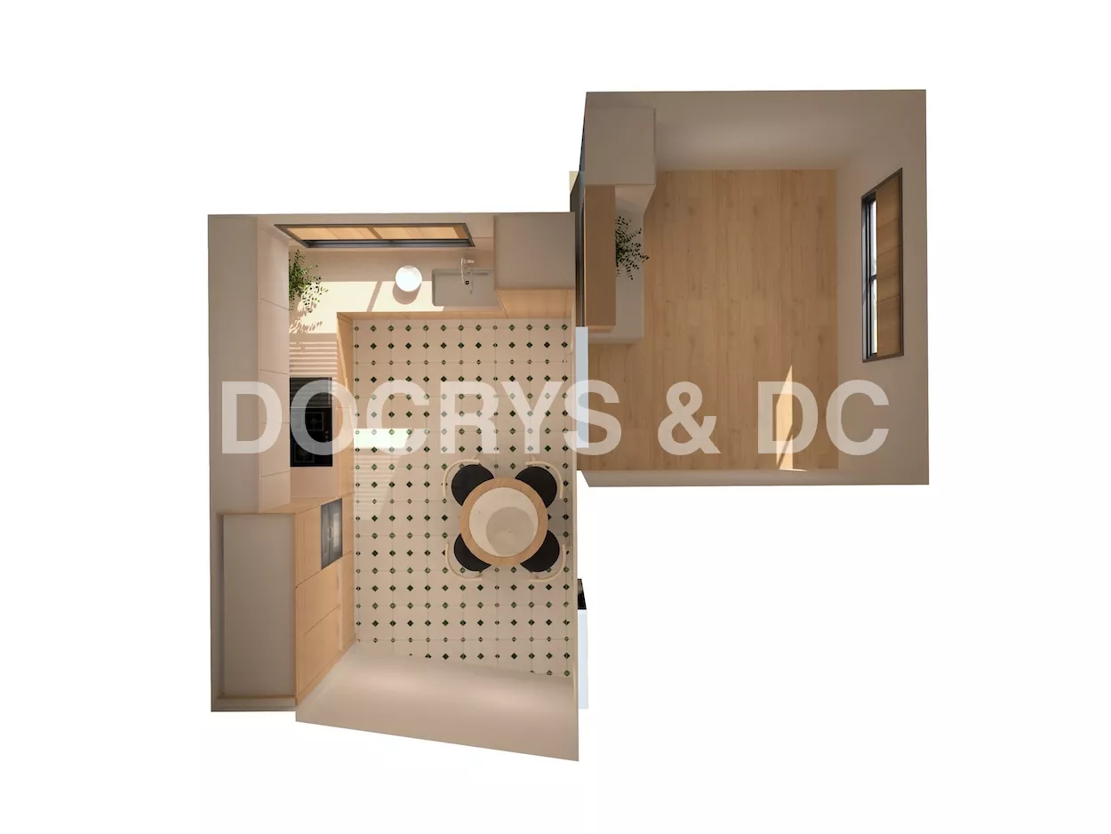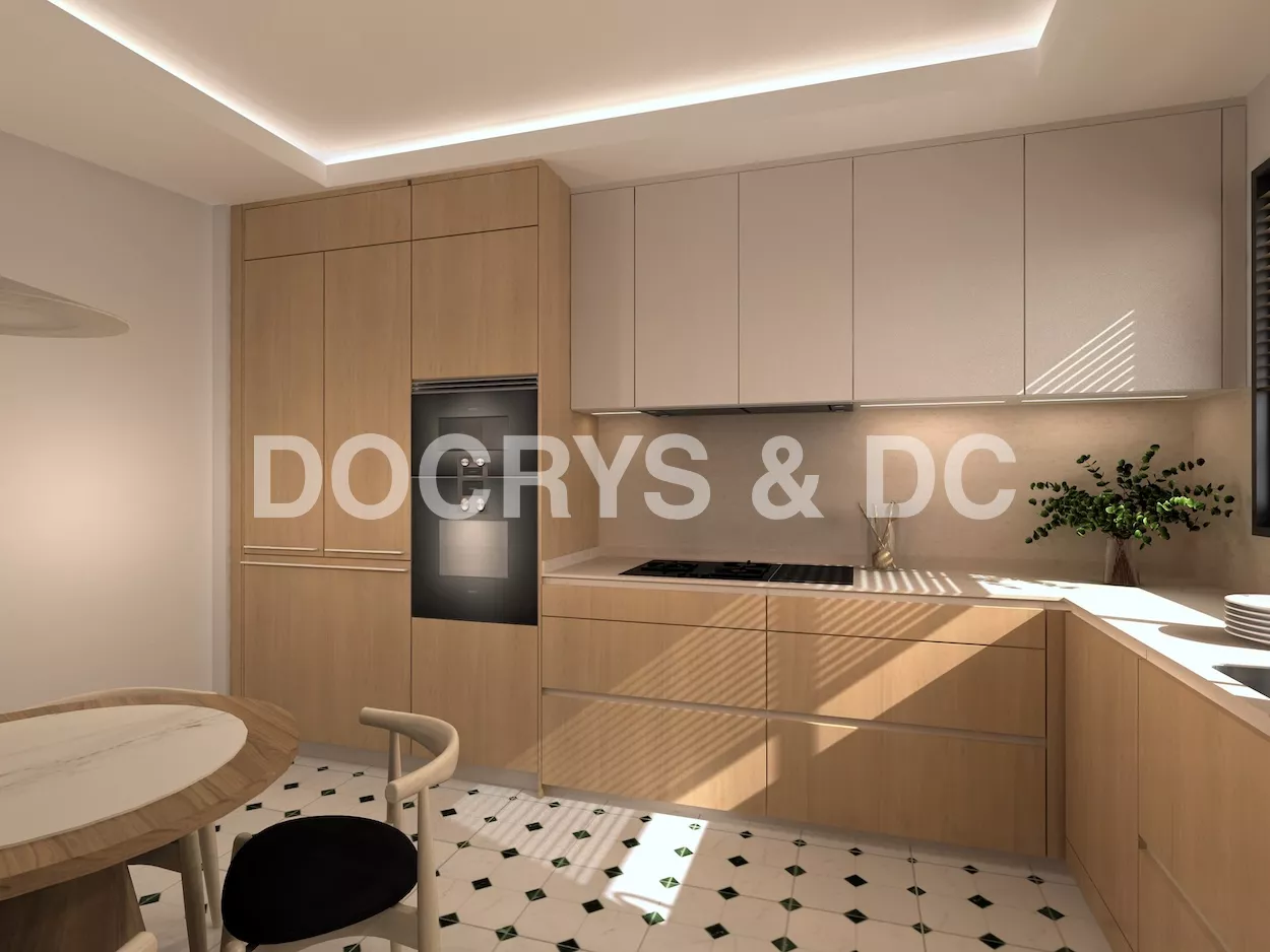 El suelo en porcelánico blanco con detalles geométricos en verde aporta dinamismo y personalidad, sin romper la armonía del conjunto. Cada detalle ha sido cuidadosamente pensado para crear una cocina que no solo cumple con las exigencias de la vida moderna, sino que también transmite bienestar, orden y belleza.