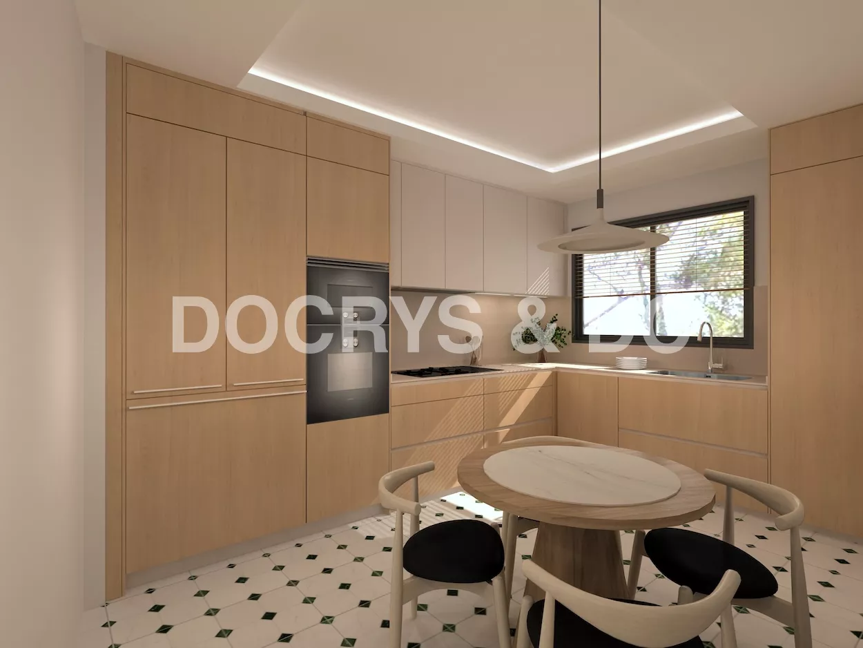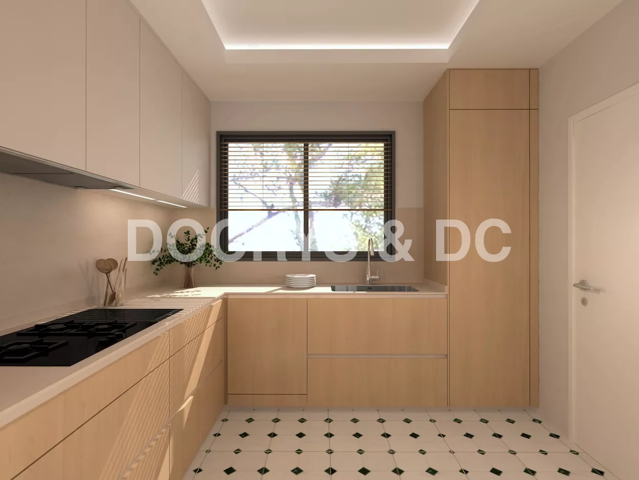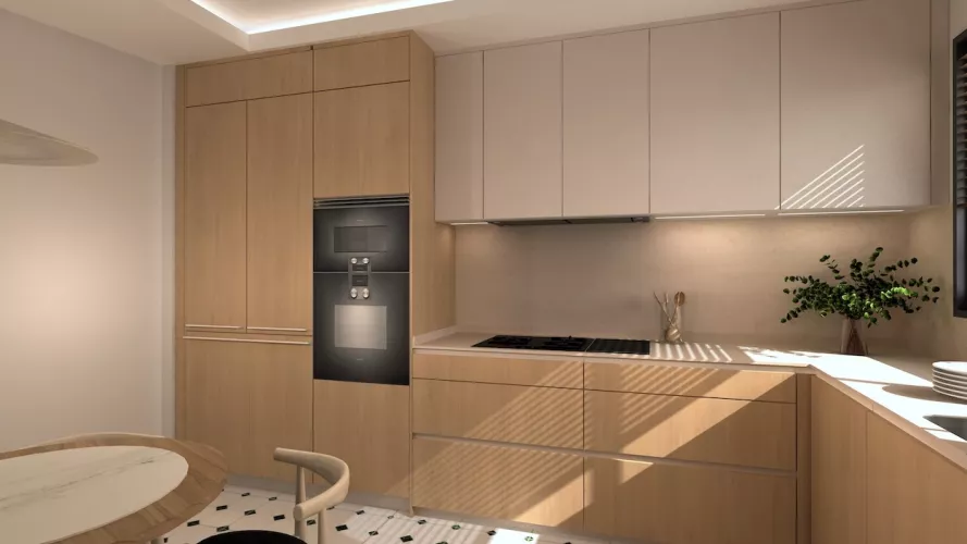 Los muebles sin tiradores refuerzan la estética minimalista, generando superficies limpias y continuas que amplifican visualmente el espacio. La encimera, en un tono neutro y elegante, recorre toda la cocina conectando las zonas de cocción, fregado y preparación sin interrupciones, ofreciendo así una experiencia de uso cómoda y eficiente.