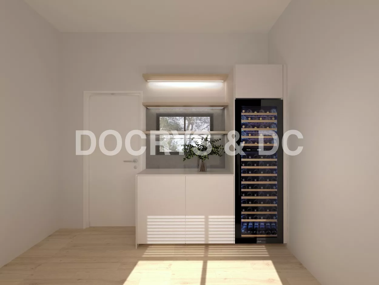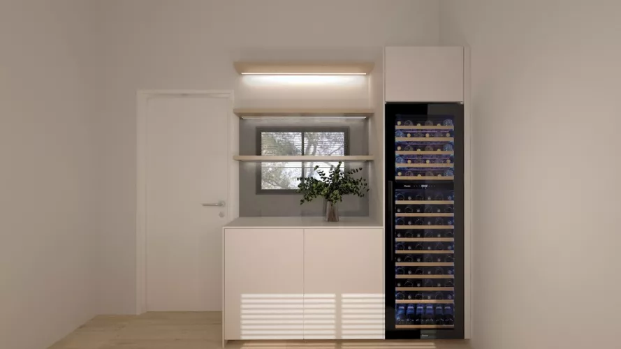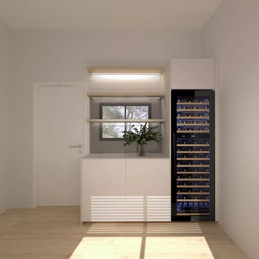 Un rincón especialmente destacado es la zona anexa equipada con una vinoteca de gran capacidad, ideal para los amantes del vino. Acompañada por un módulo auxiliar y estantes decorativos con iluminación integrada, esta área combina funcionalidad y estética, convirtiéndose en un punto focal del hogar.
