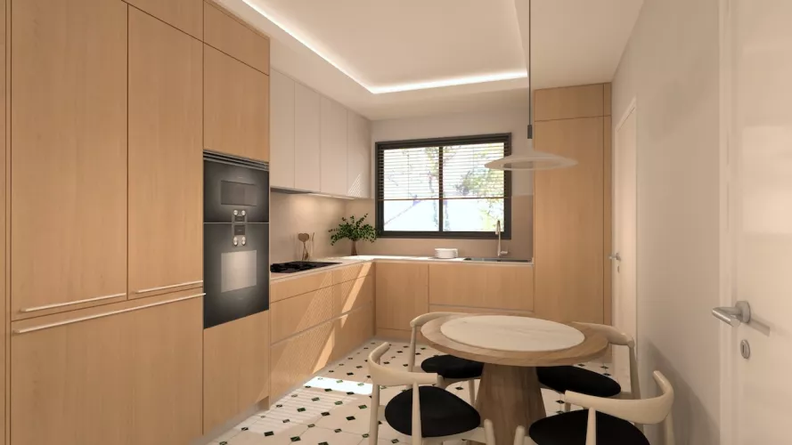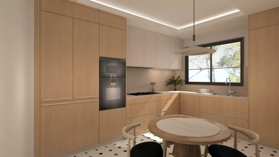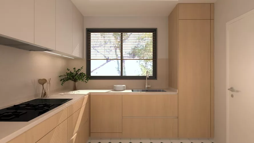 Esta cocina representa un equilibrio perfecto entre funcionalidad, diseño y calidez. Con una distribución envolvente en forma de "L" y una paleta de materiales suaves, el espacio invita a disfrutar del día a día con naturalidad y estilo. La madera clara en el mobiliario aporta un carácter orgánico y atemporal, mientras que los módulos en blanco mate suavizan el conjunto y realzan la luminosidad del ambiente.